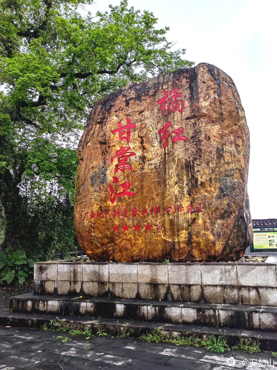 我们沿甘掌江边溯江而上,大概走了三,四里,便按徒步路线转村道,一块风景大江石立在路边,上书橘红甘棠江,标明是广西特色农业示范区,字的下面刻着五颗红星,不知何解
