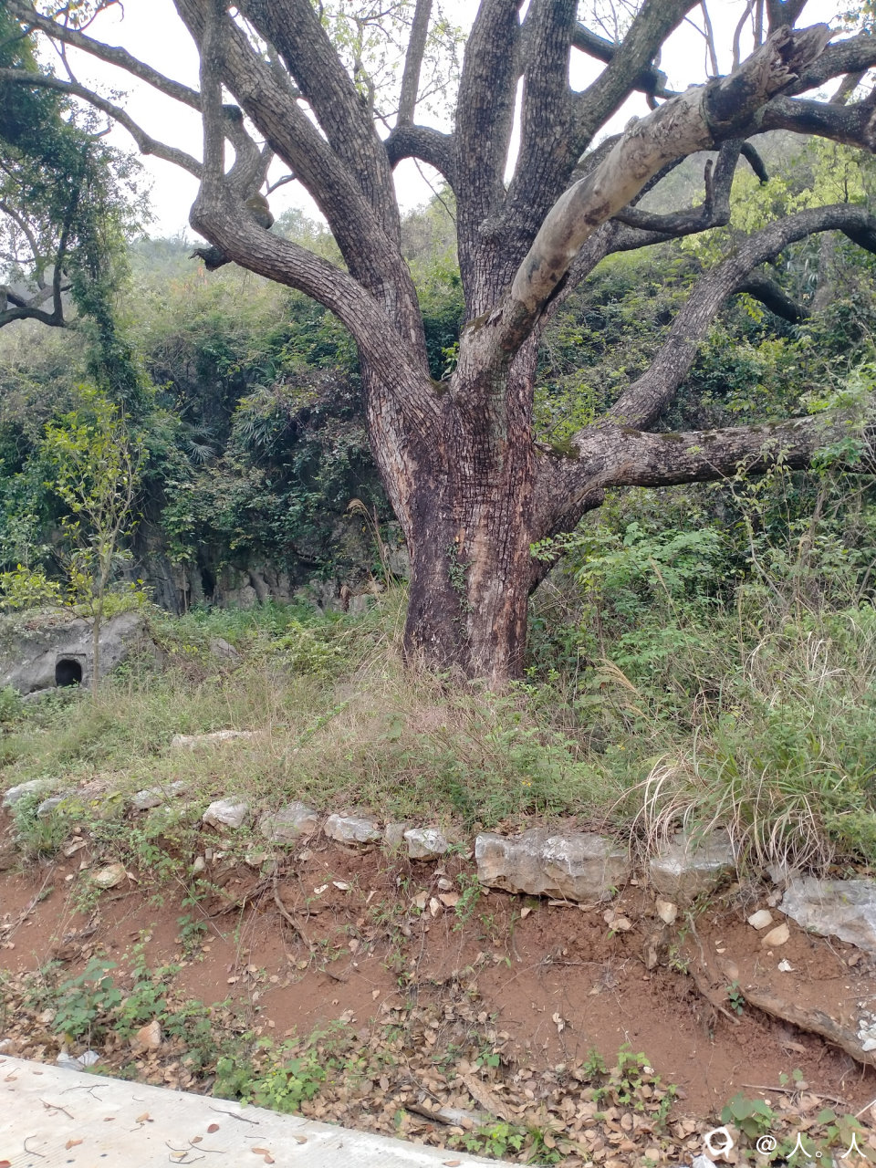 直接开车朝山坳处行进,水泥路只铺到了古樟脚下,左边的约六立方巨石很显眼。