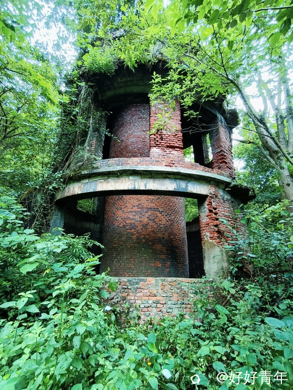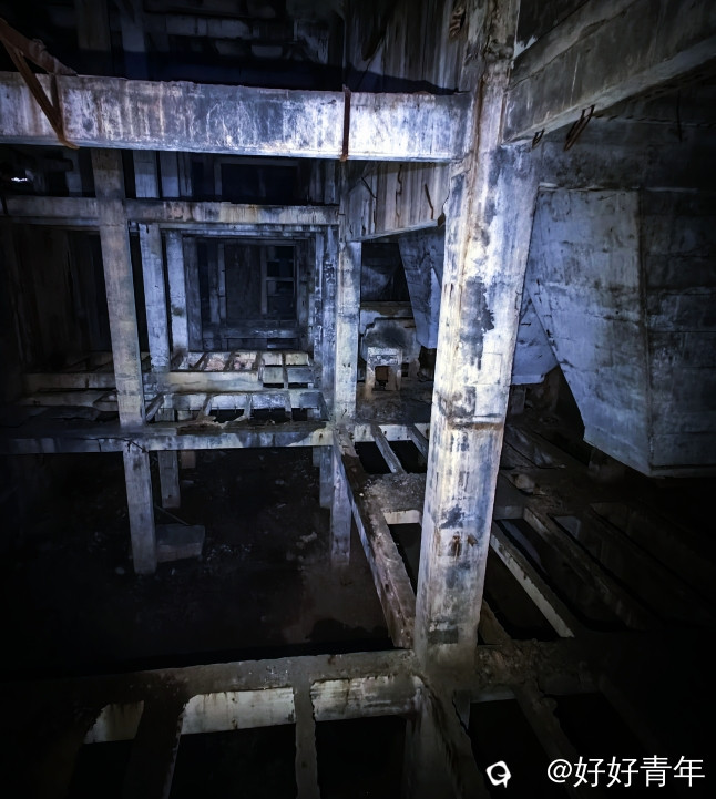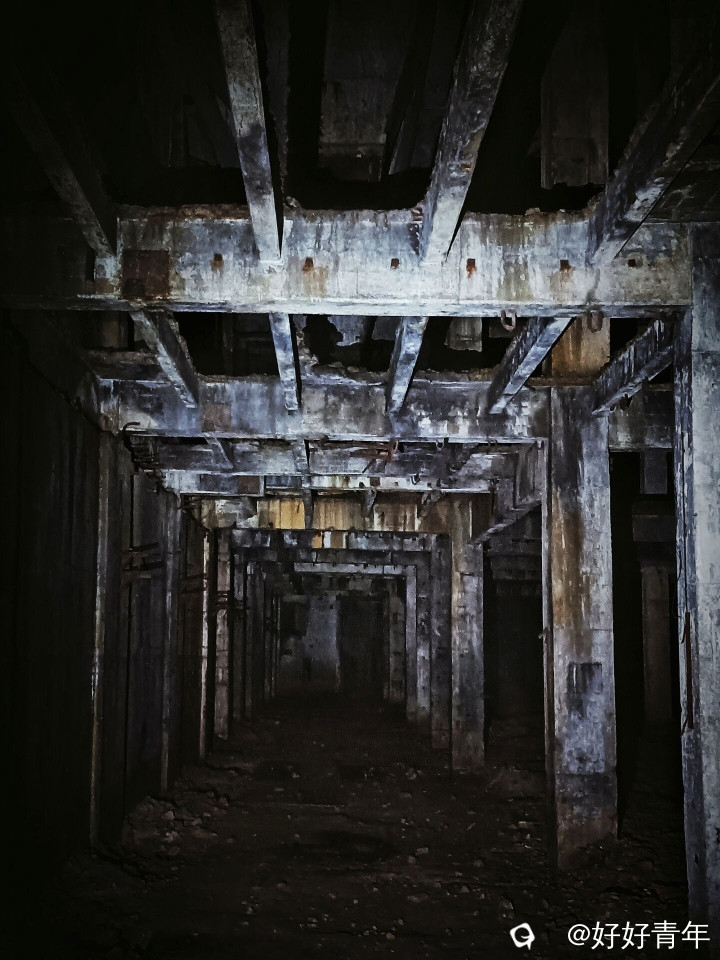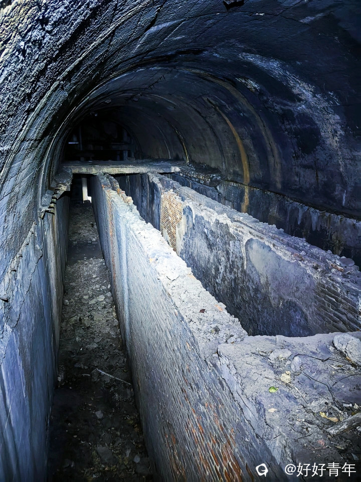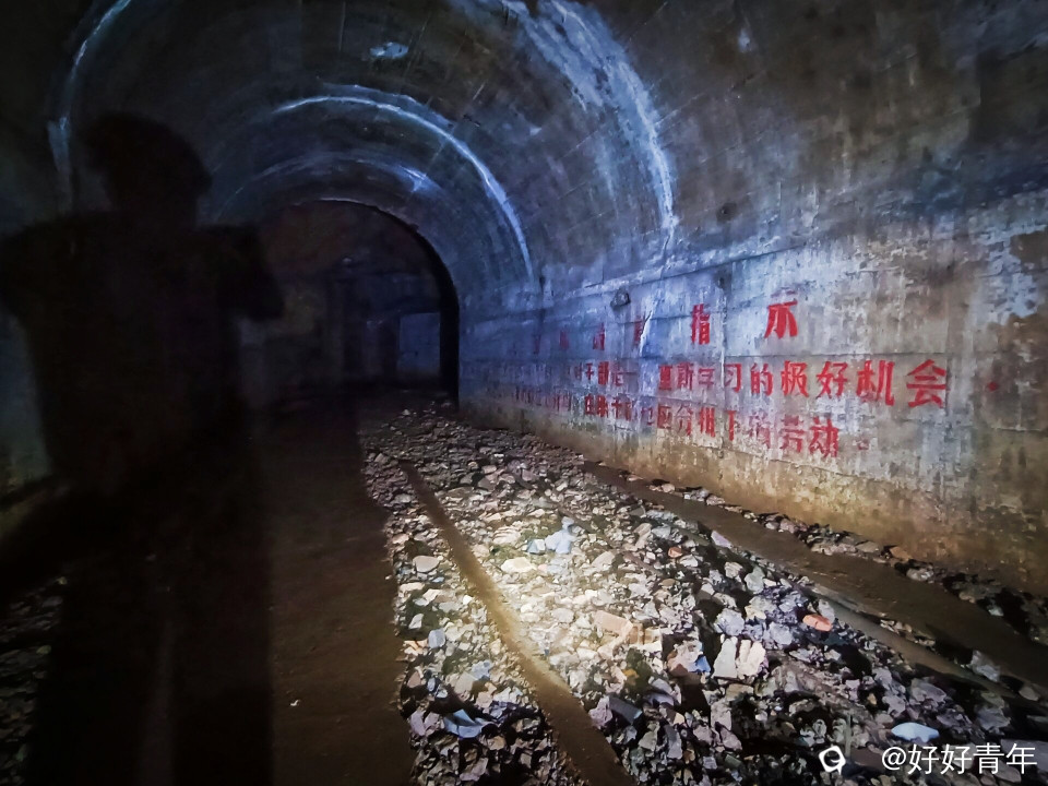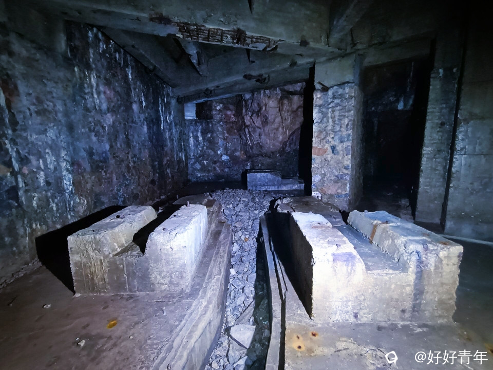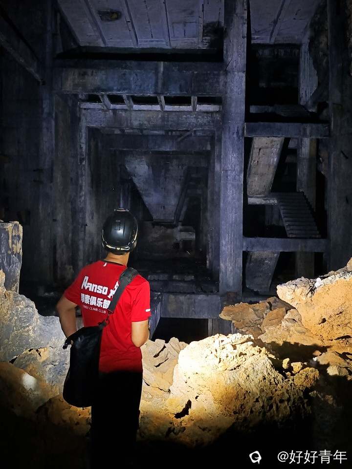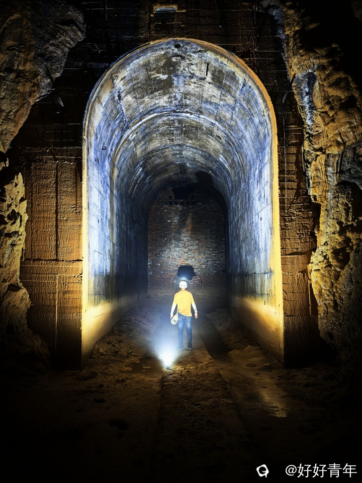 阳光透过密集的树林,洒下斑驳陆离的光影,我们沿着蜿蜒曲折的小径深入。经过一番艰难的跋涉,一个被岁月侵蚀的山洞悄然出现在眼前。我们小心翼翼地拨开遮掩的绿意,打开头盔的小灯踏入黑暗的洞口,一股混合着泥土与金属气息的阴冷空气扑面而来。小灯的光束在黑暗中摇曳,照亮了斑驳的建筑体和墙壁,以及散落一地的石头。这里的时间仿佛静止了,每一角落都弥漫着年代的气息。
