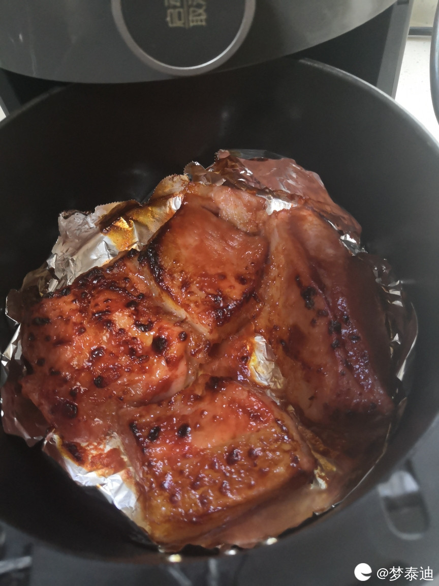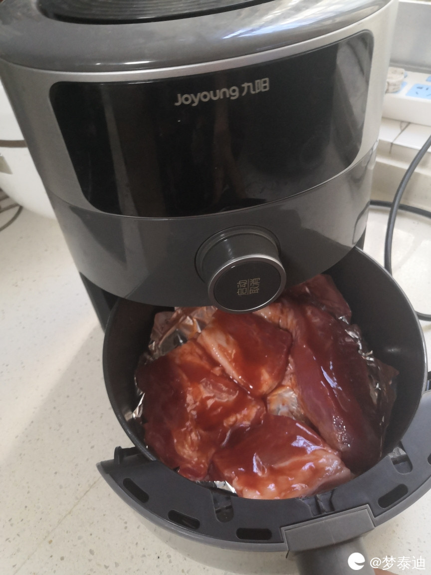 注:买空气炸锅以前,我家一直用微波炉烤叉烧,效果也不错。重点是多观察烘烤时间,随时加减。