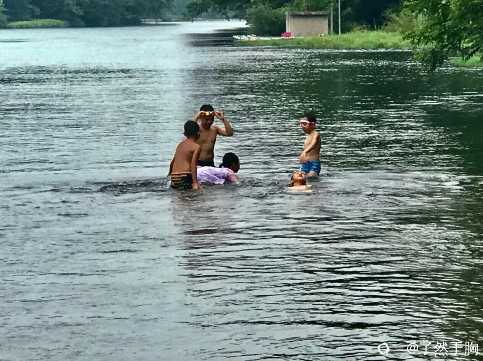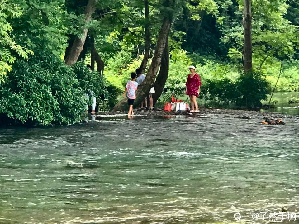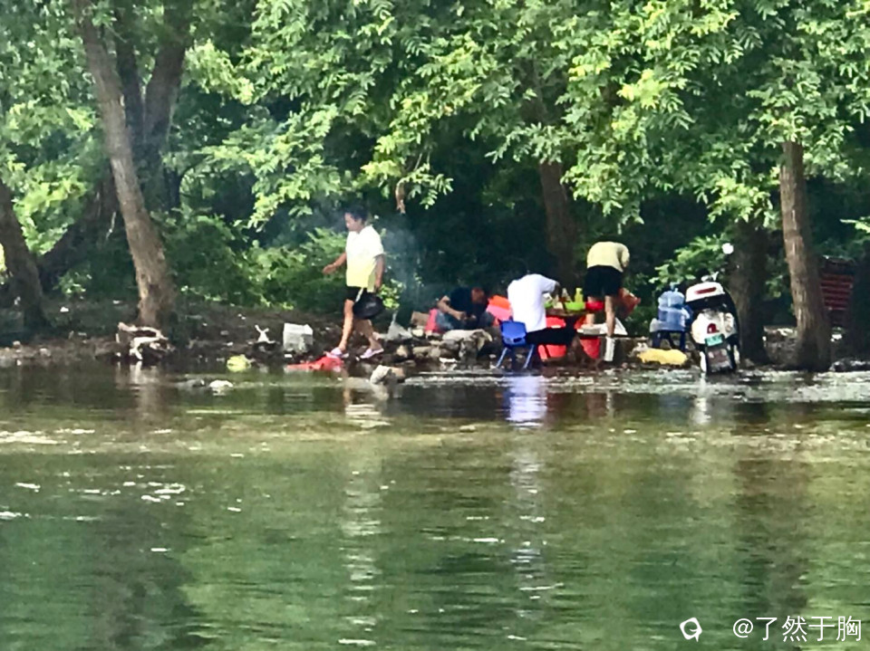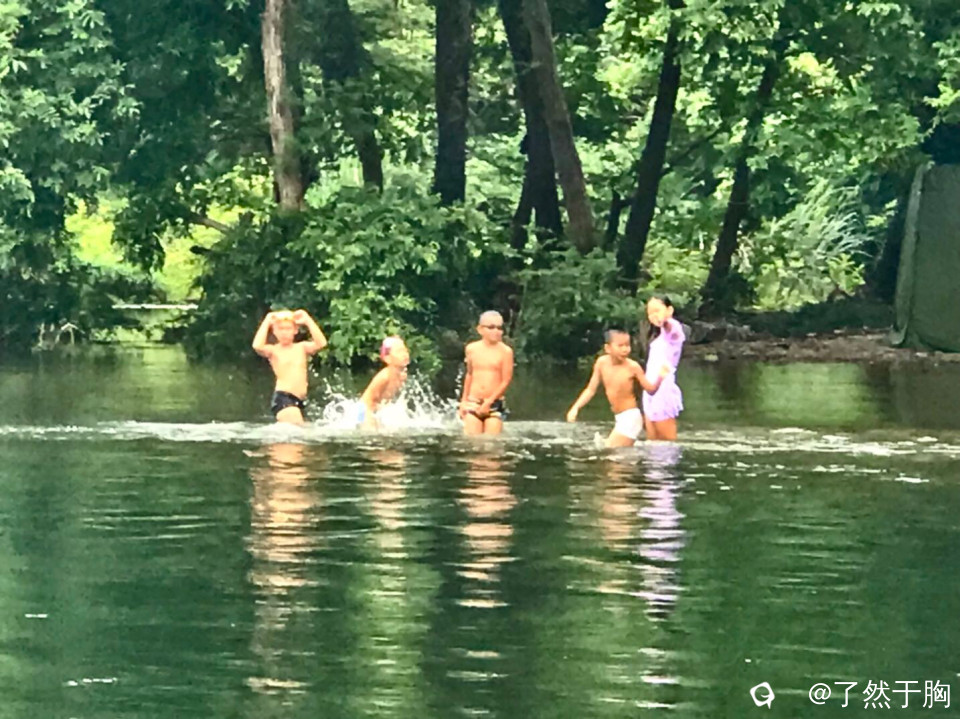 大人们在不大的陆地上忙着垒灶架锅,备物烧烤,孩子们在河滩上水中戏水游泳,各得其乐。