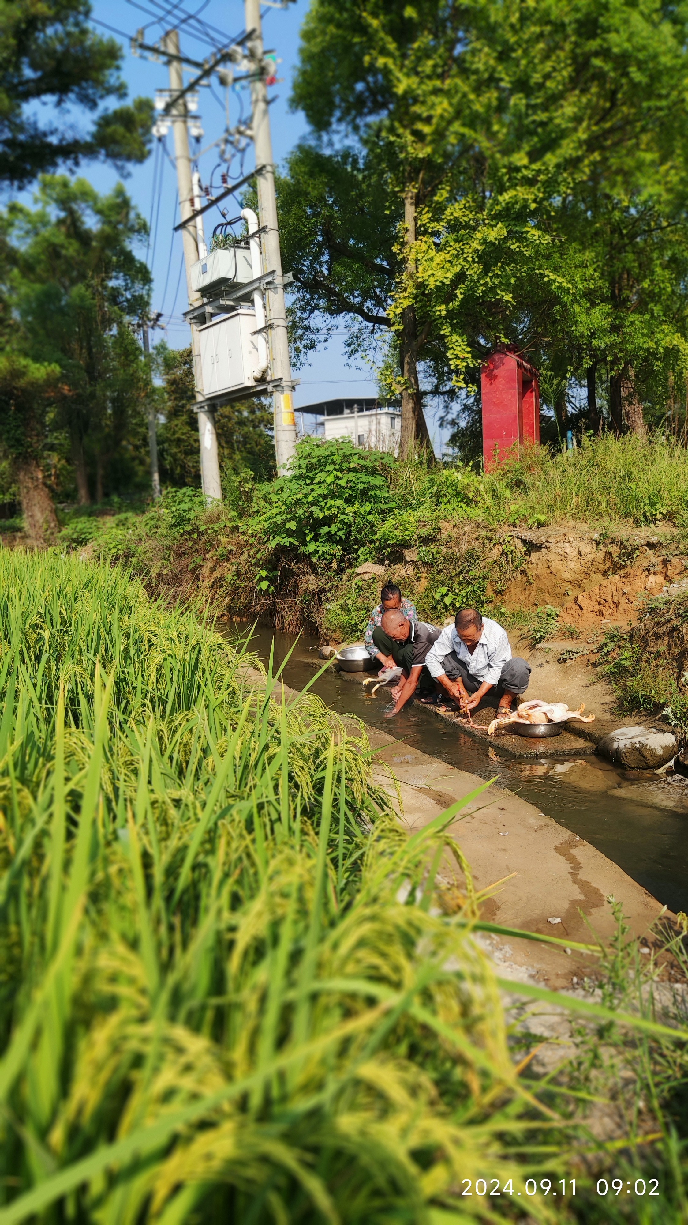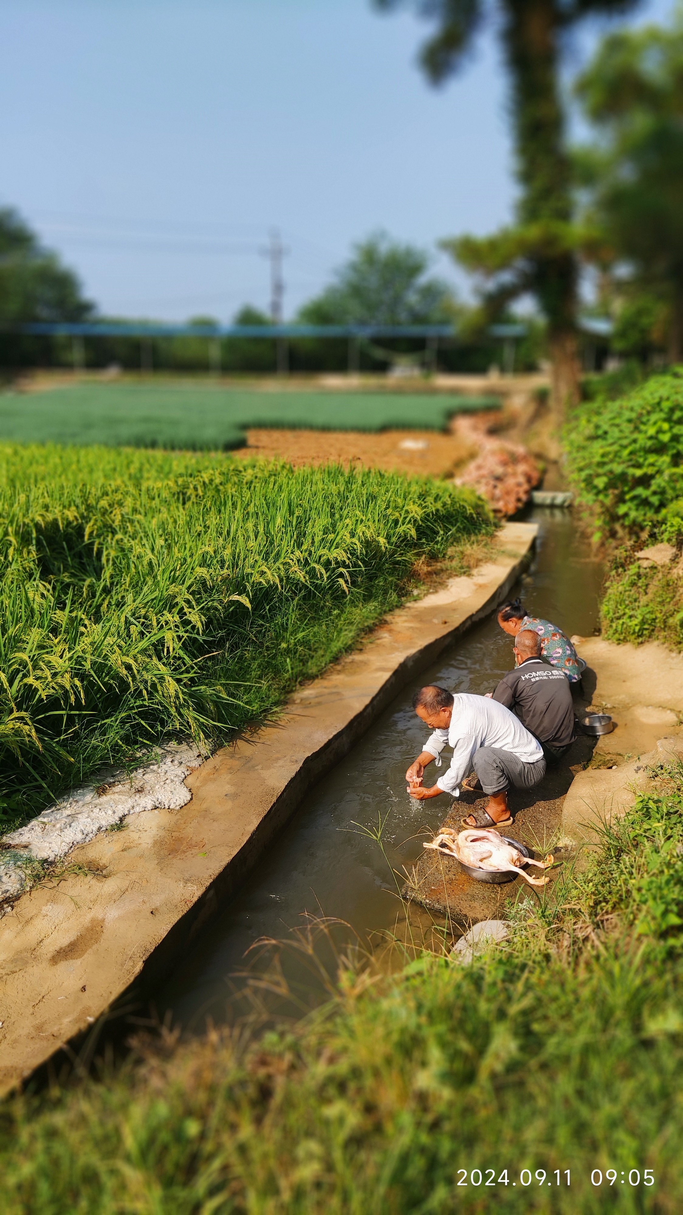 上午九点多钟,村口,老表们已经准备好了鸭子。东干渠流进的水,经过碧绿如玉的葱花地、正值泛黄的稻谷田。