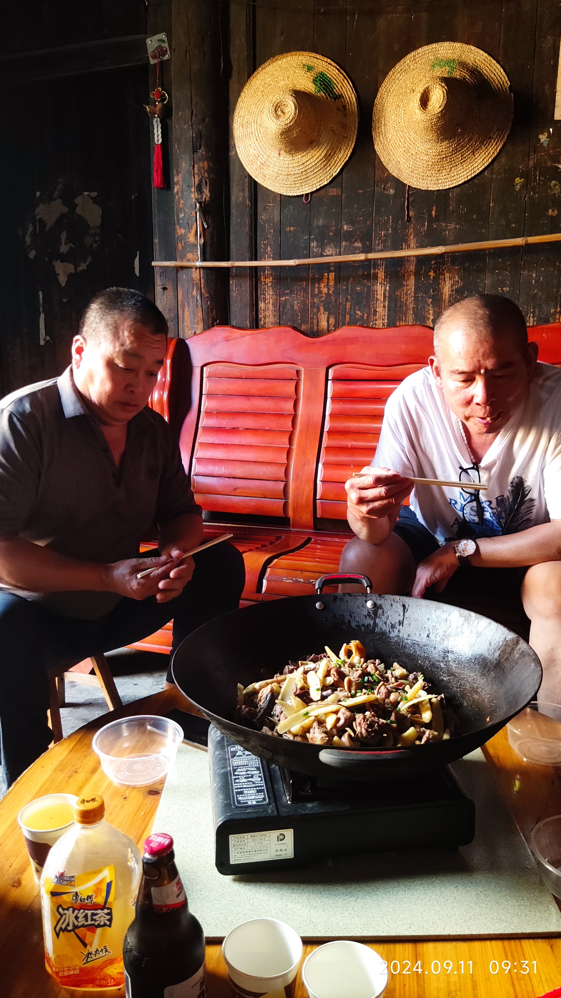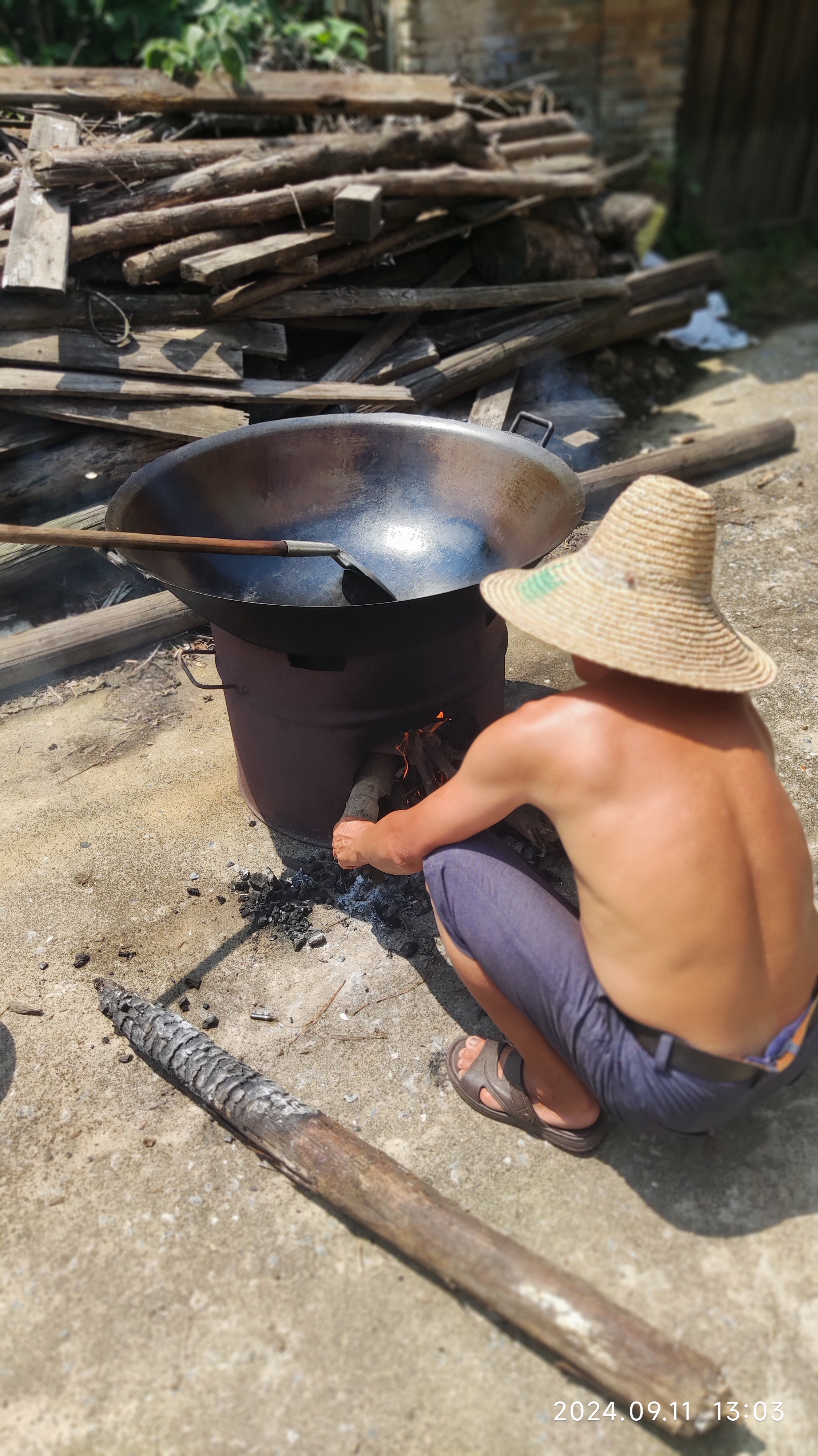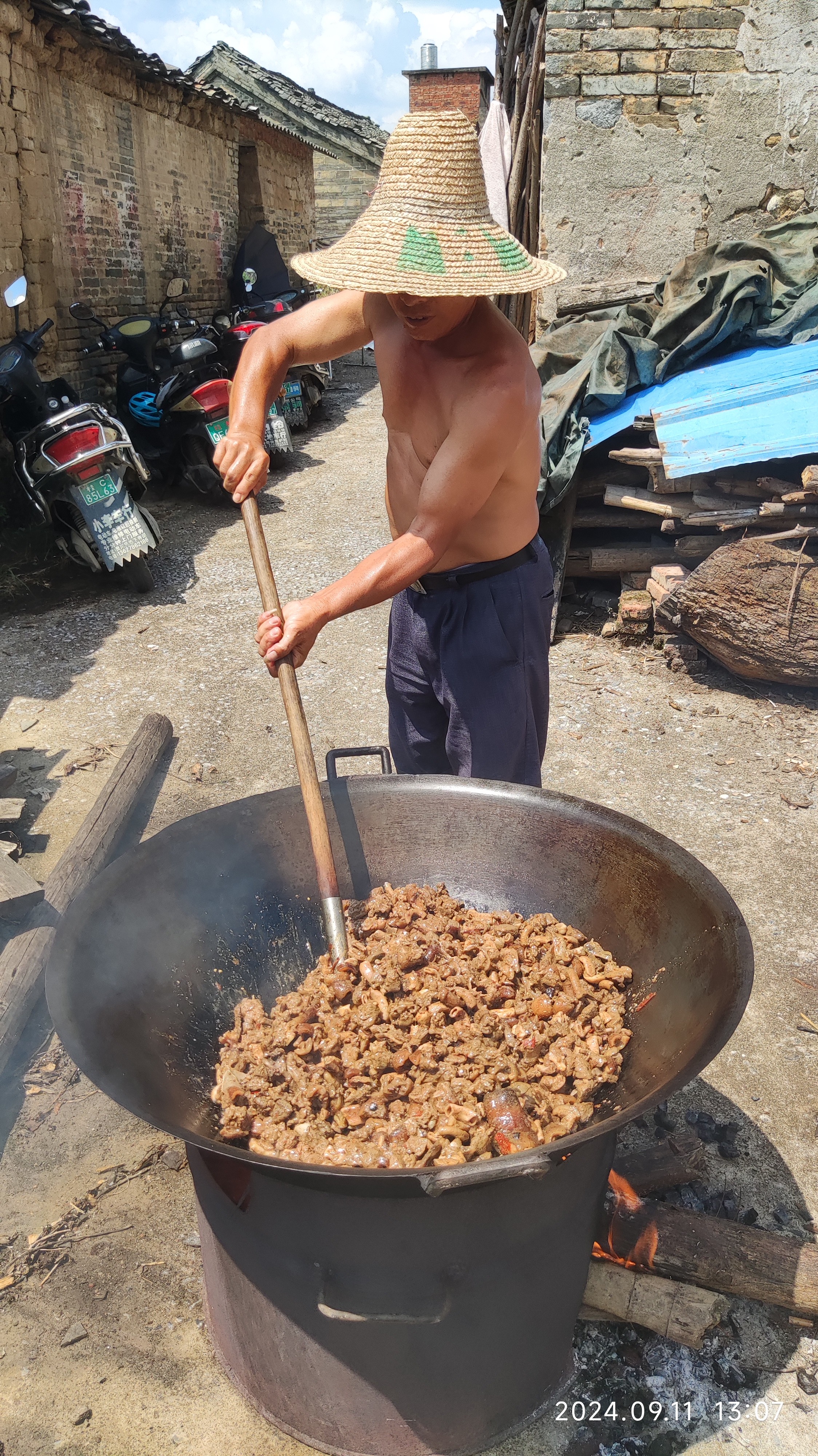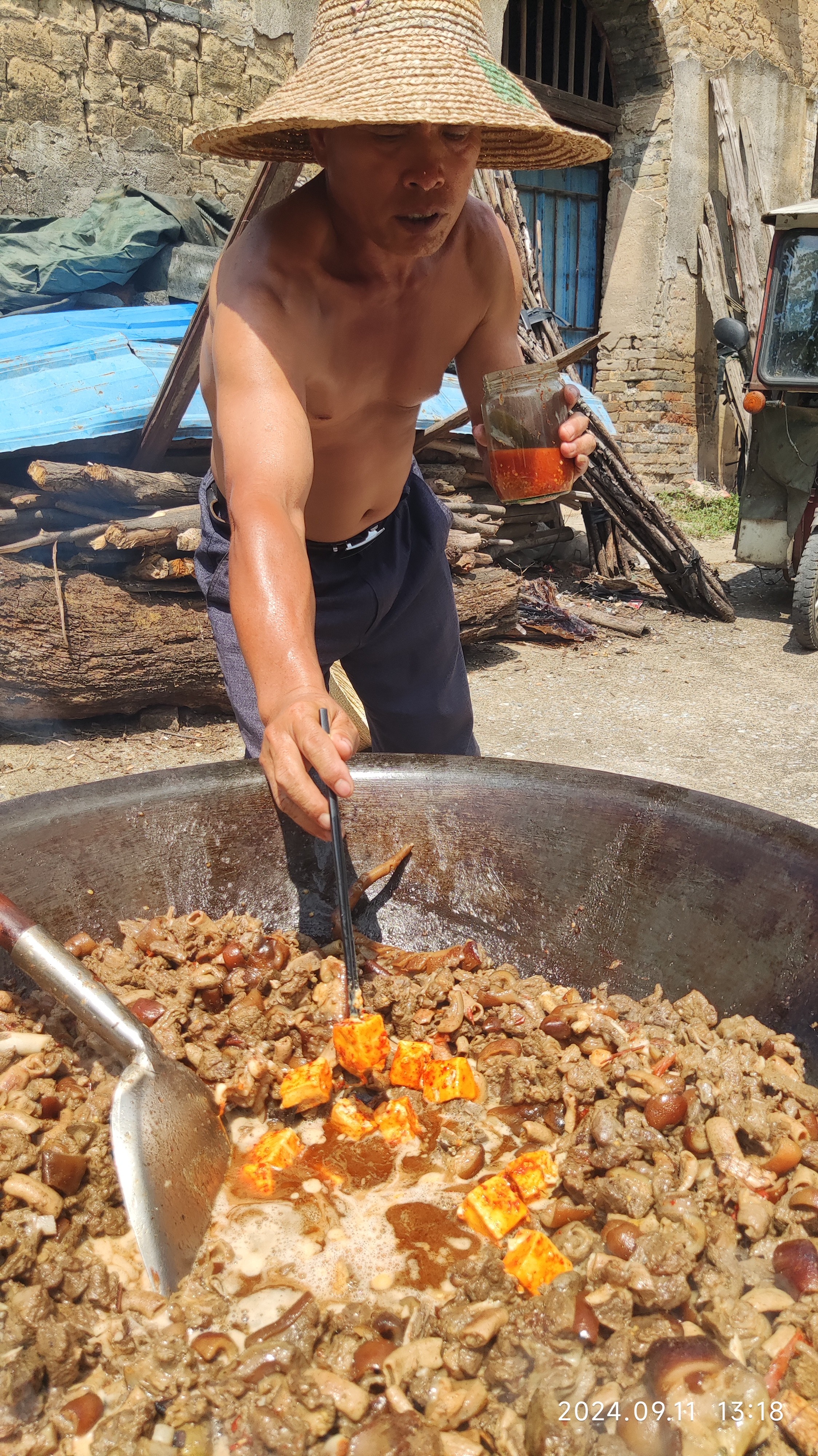 下午一点,客人到齐了。戴起草帽,在36℃的太阳下烧起火,四方井腐乳入锅,收汁,狗肉那魂牵梦绕的香味炸锅了。