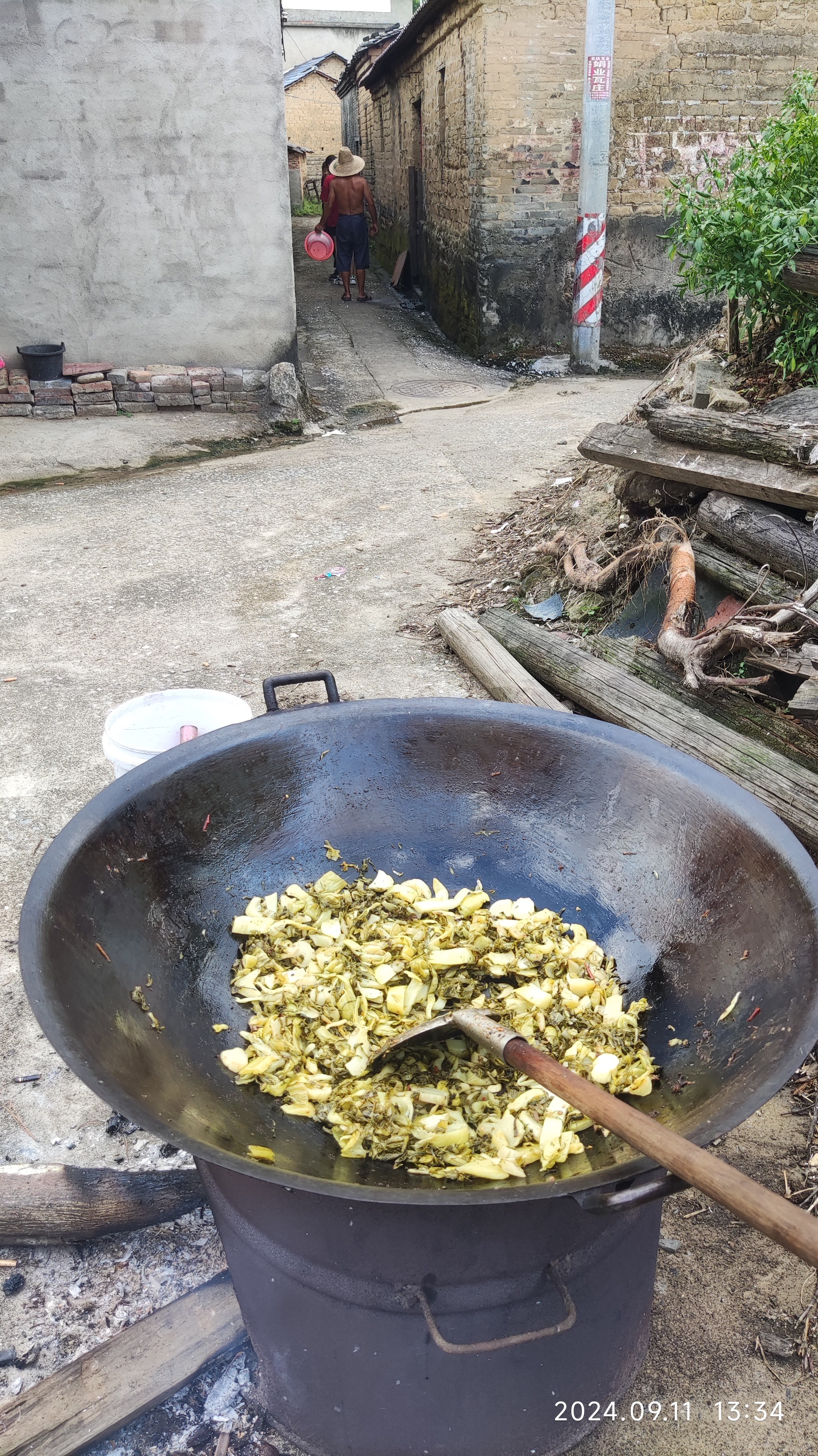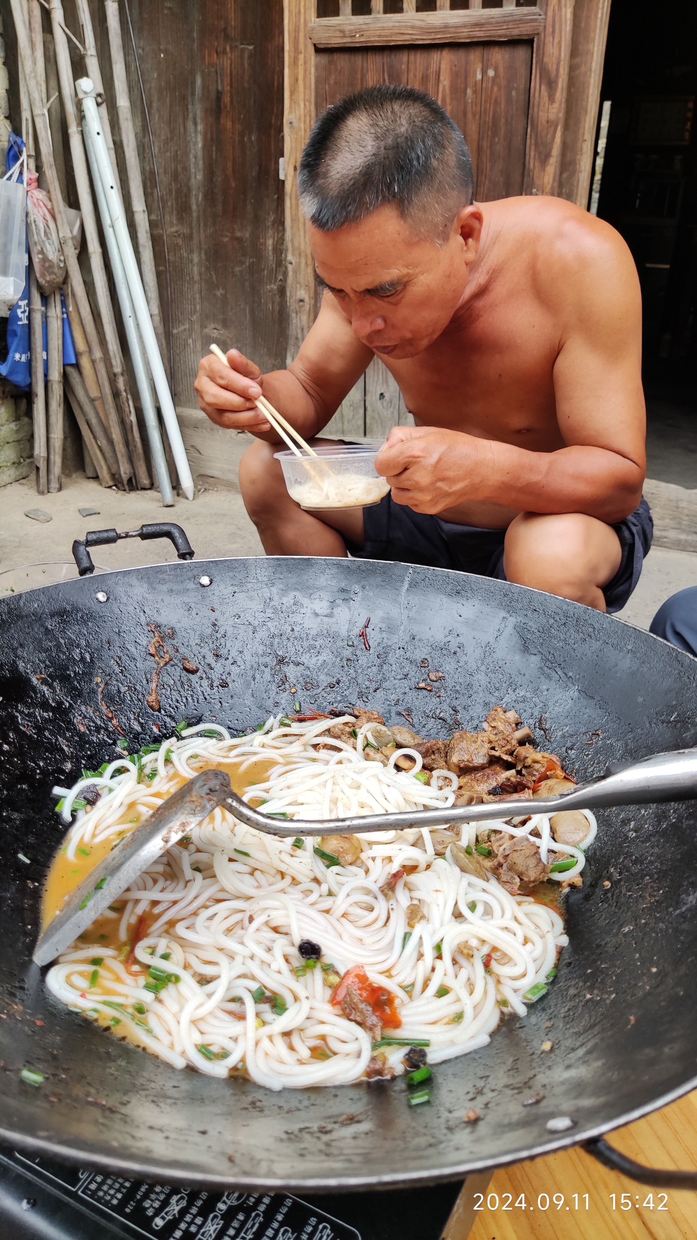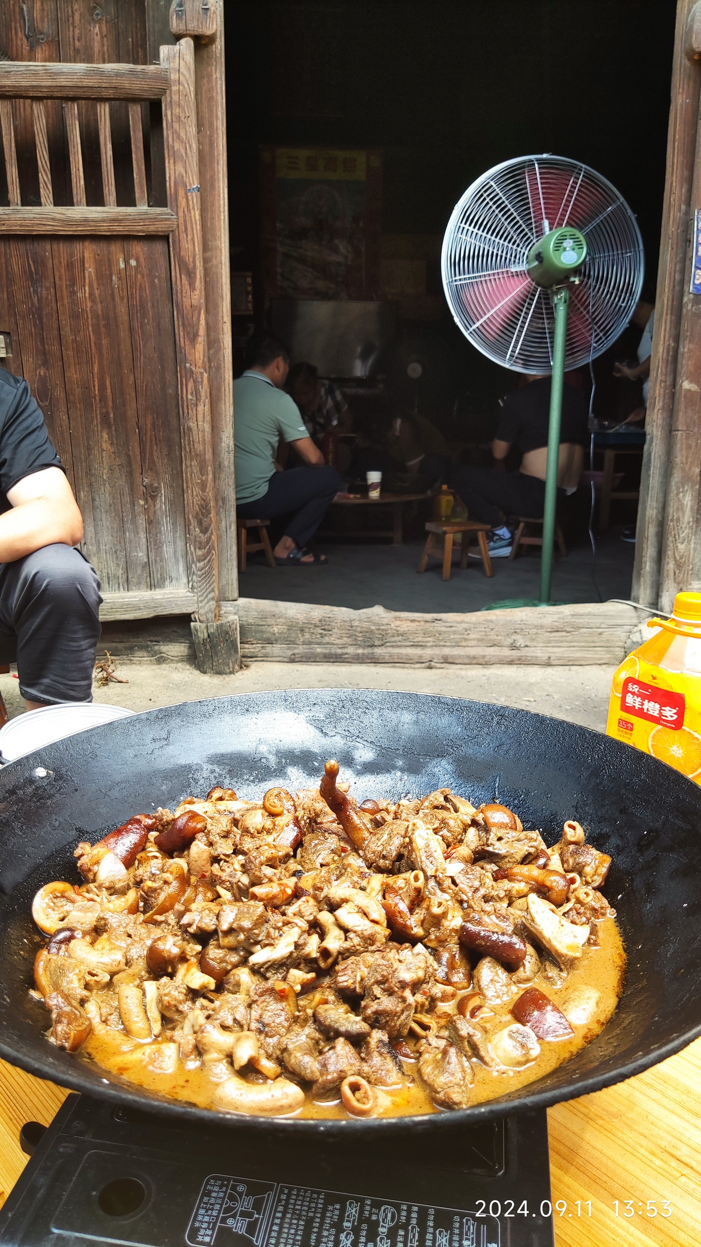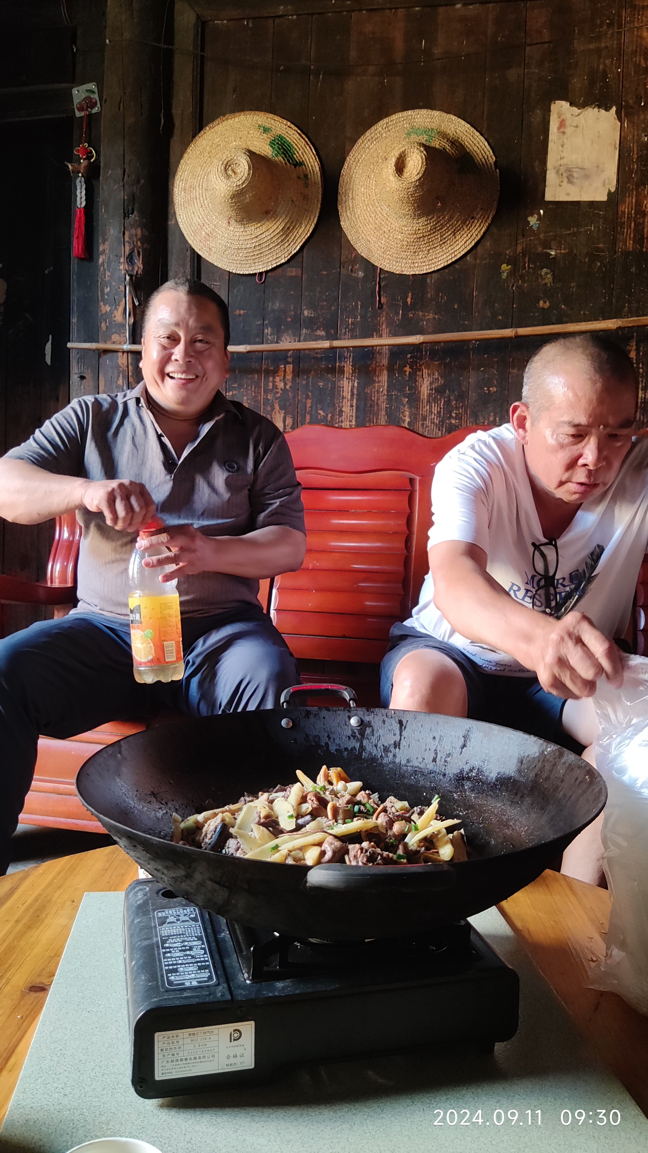 下午一点,客人到齐了。戴起草帽,在36℃的太阳下烧起火,四方井腐乳入锅,收汁,狗肉那魂牵梦绕的香味炸锅了。