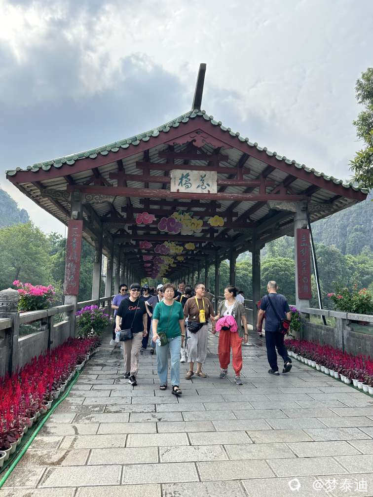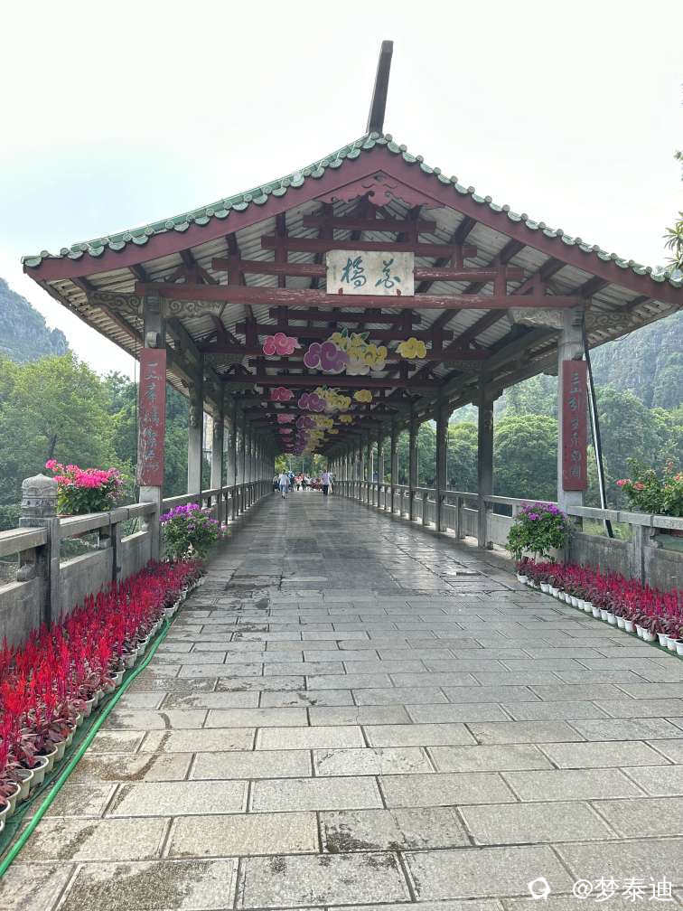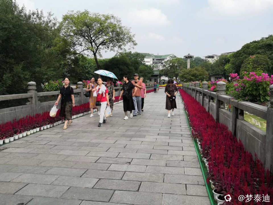 通向花桥的的步道两旁摆满了盛开的鲜花。