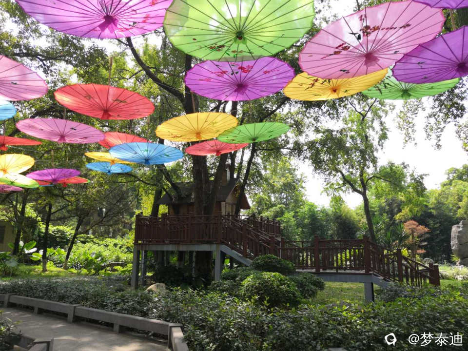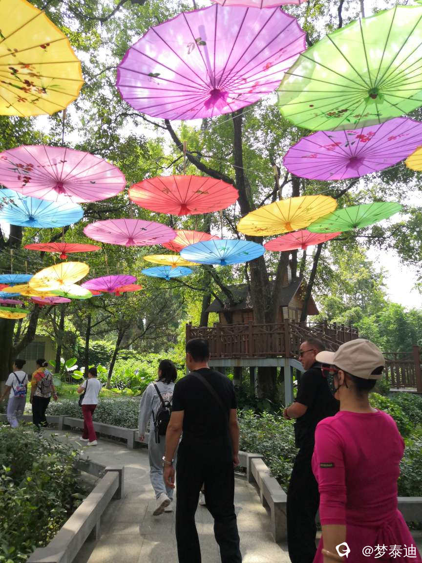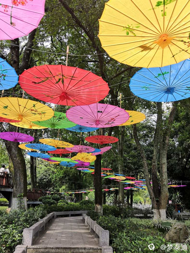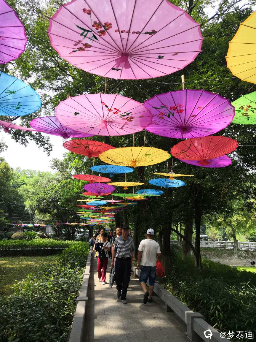 骆驼山旁小树林九曲迂回的路上,装饰了五彩缤纷的民族花伞。来来往往的游客穿行在花伞中,增添了喜庆的节日气氛!