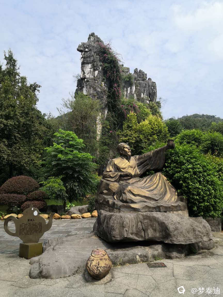 游客们来到七星公园,都会在酒壶山下和雷酒人拍照。