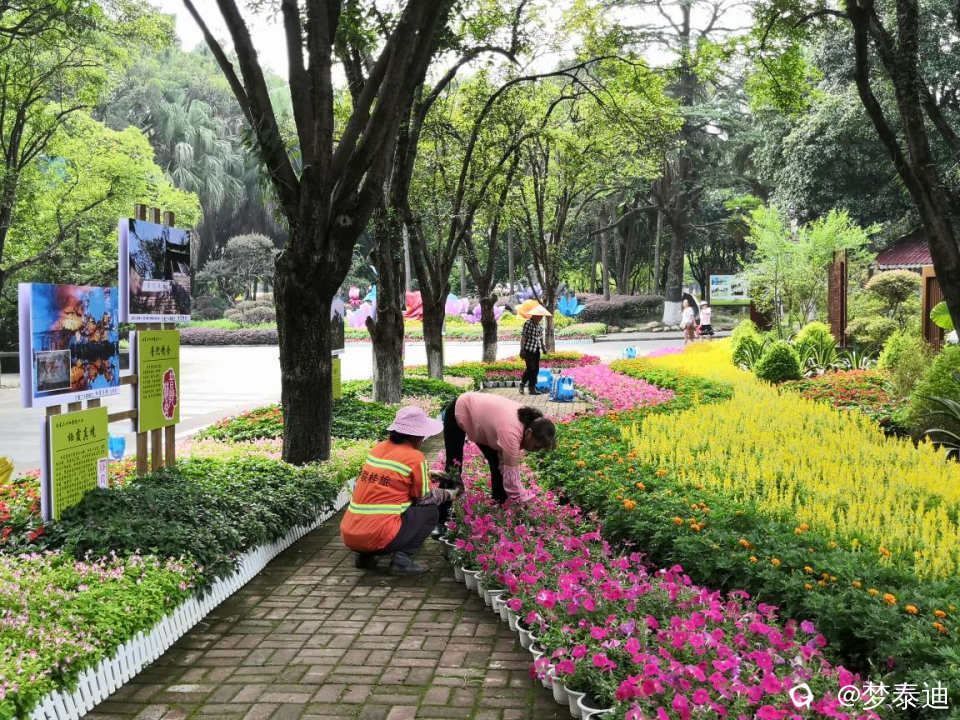 刚走过花桥,就看见公园的花工在添补花坛的鲜花。