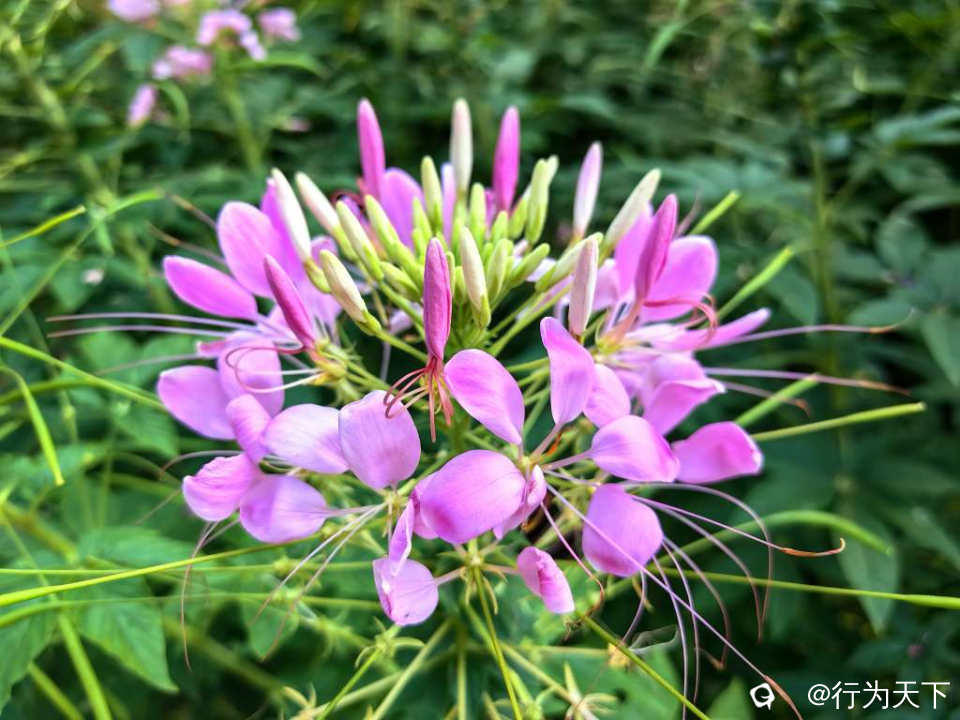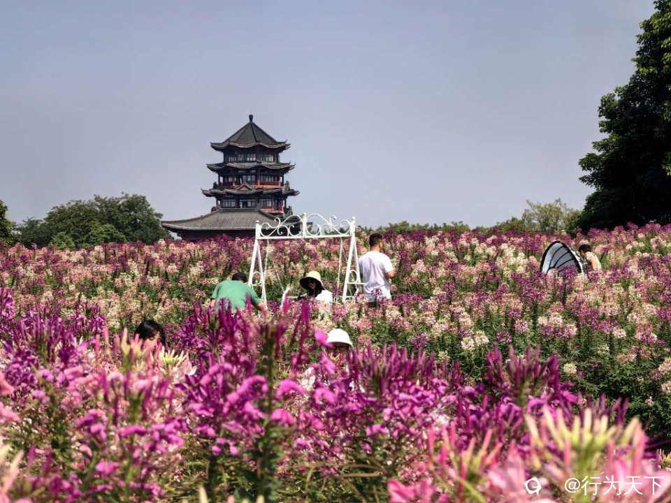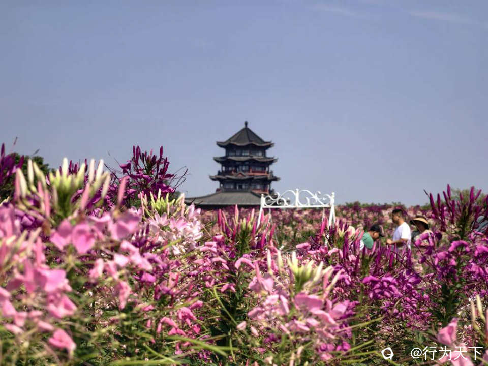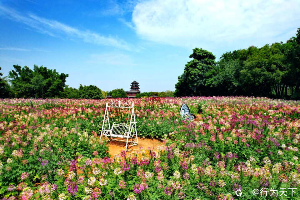 盛开的醉蝶花,总状花序形成一个丰满的花球,朵朵小花犹如翩翩起舞的蝴蝶。秋风拂过,掀起层层花浪,一朵朵、一簇簇、一片片,与天边的云彩、亭台楼阁交相呼应,美不胜收。
