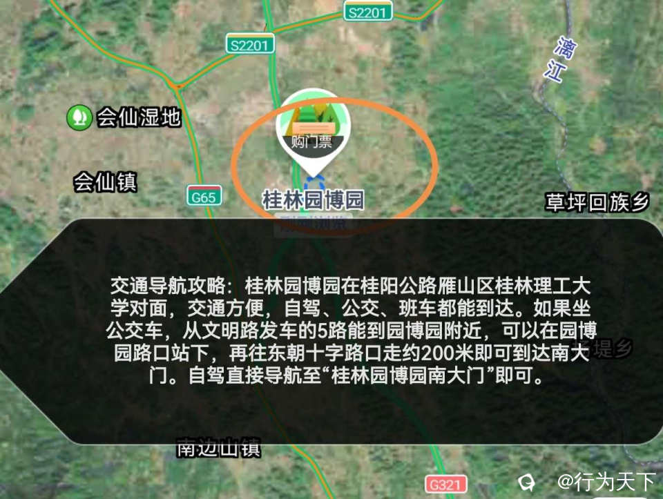 出行攻略:桂林园博园在桂阳公路雁山区桂林理工大学对面,交通方便,自驾、公交、班车都能到达。如果坐公交车,从文明路发车的5路能到园博园附近,可以在园博园路口站下,再往东朝十字路口走约200米即可到达南大门。自驾直接导航至“桂林园博园南大门”即可。