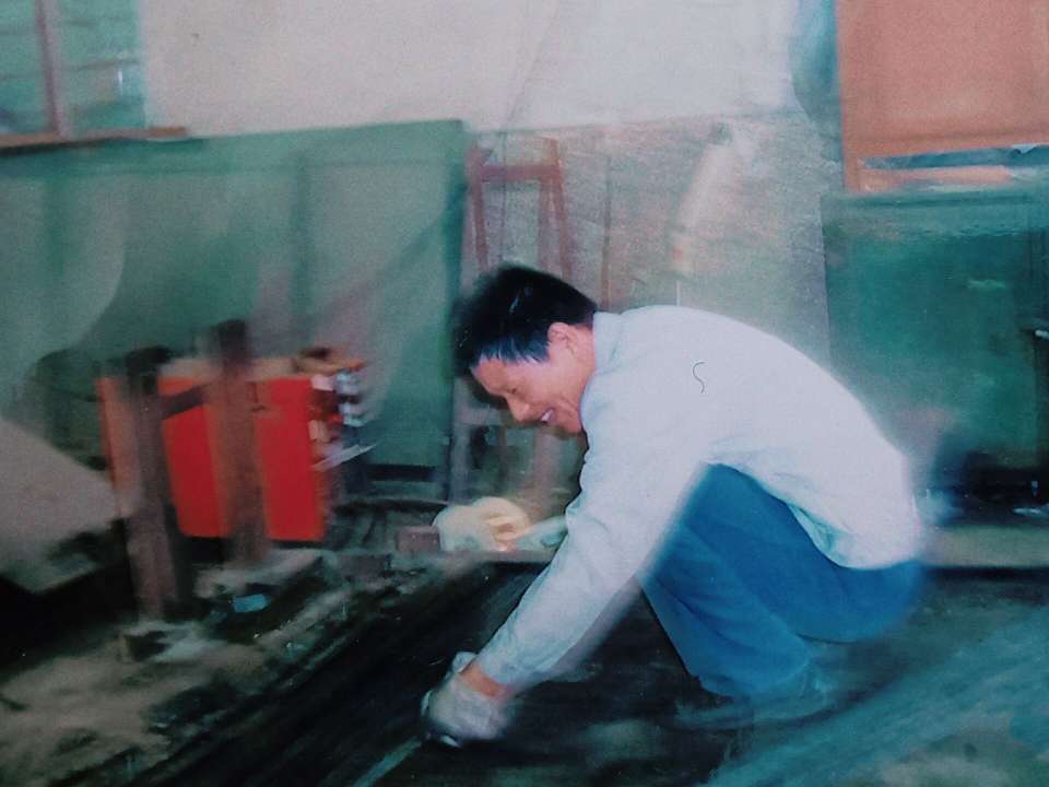 这张照片留下了父亲工作的画面,定格在2004年1月那一刻。画面中,他身着灰白工服和蓝色裤子,蹲在地上全神贯注地工作,他的眼神专注而深邃,仿佛是他青春奋斗的象征。周围,绿色的柜子和红色的物体交织出温暖的色彩,为这专注的身影增添了几分温馨和活力。