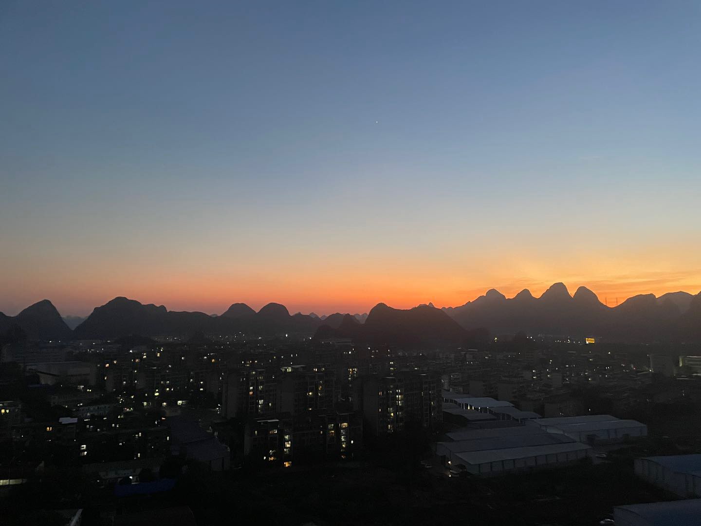 夕阳西下天已黑,晚霞余晖中各家各户已点灯,就像星光洒在了黑夜中。
