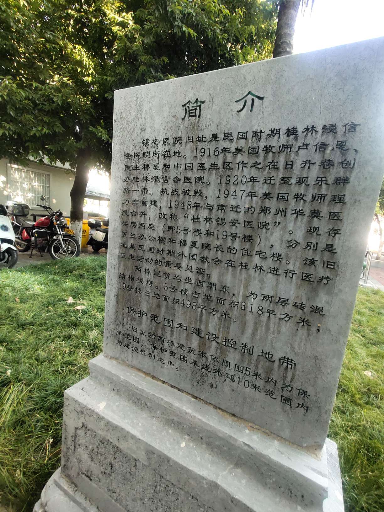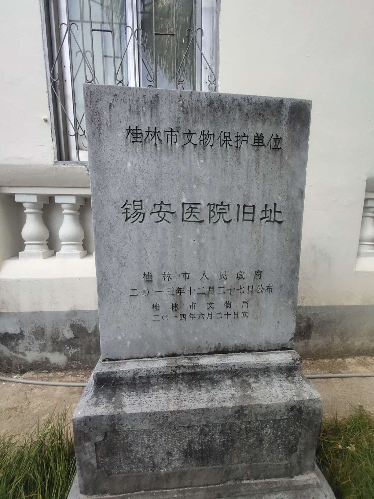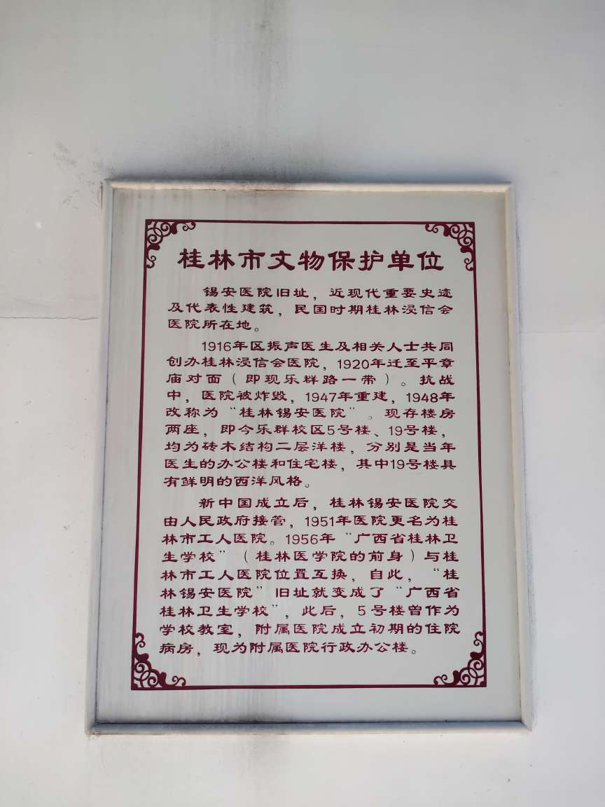 在桂林医学院乐群校区内的某行政楼门口,却放置着桂林市文物保护单位“锡安医院旧址”的碑刻。