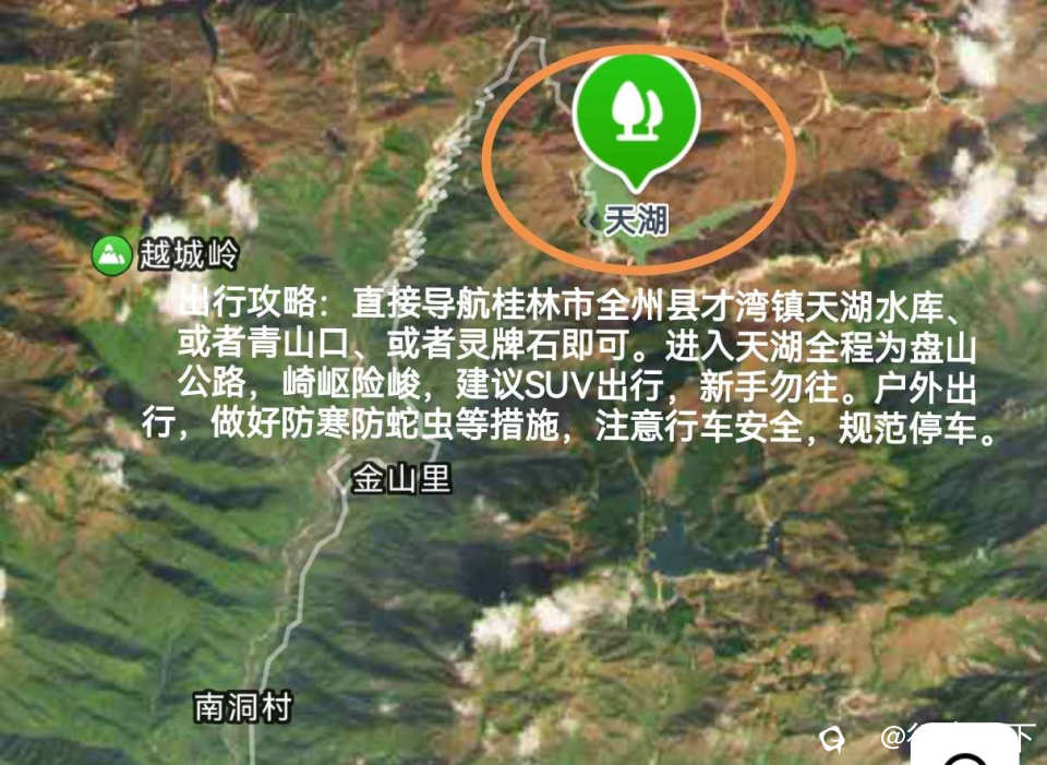 出行攻略:直接导航桂林市全州县才湾镇天湖水库、或者青山口、或者灵牌石即可。进入天湖全程为盘山公路,崎岖险峻,建议SUV出行,新手勿往。