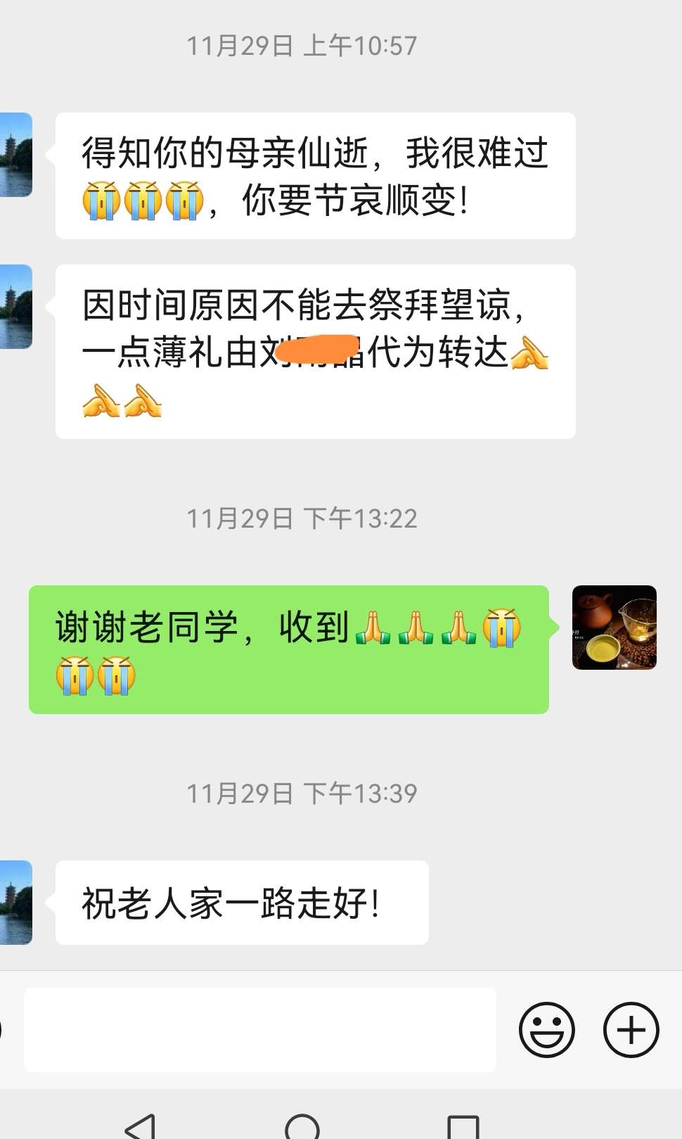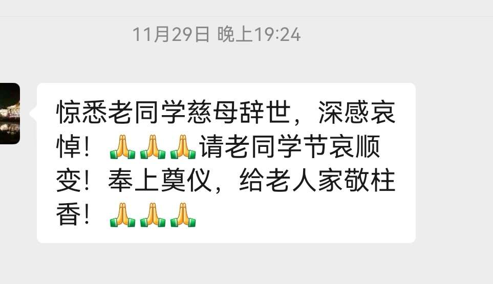 母亲过世后,我只在朋友圈发了一个讣告,就不一一通知了。想不到很多同学都很关心我,从小学到大学都有,特别有几位远在千里之外的老同学也给我发信息安慰,并奉上奠仪,要我给母亲上一炷香。