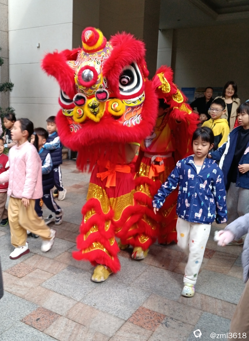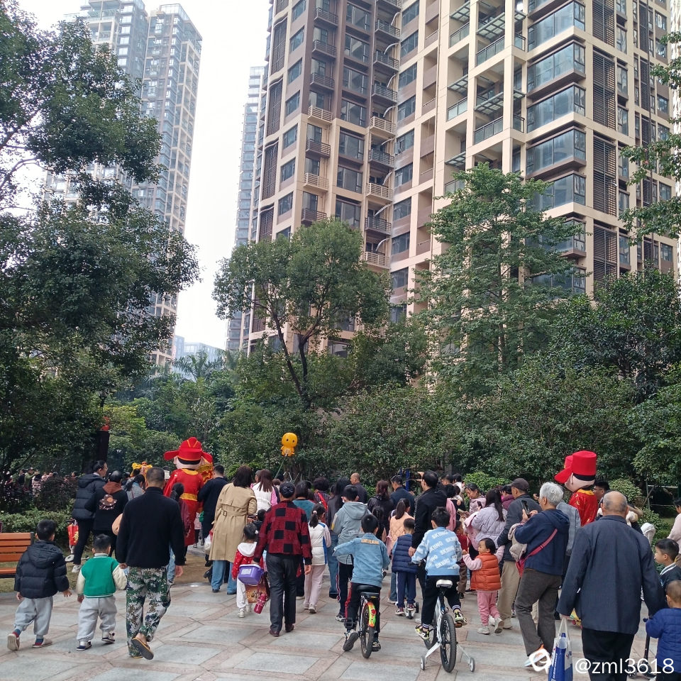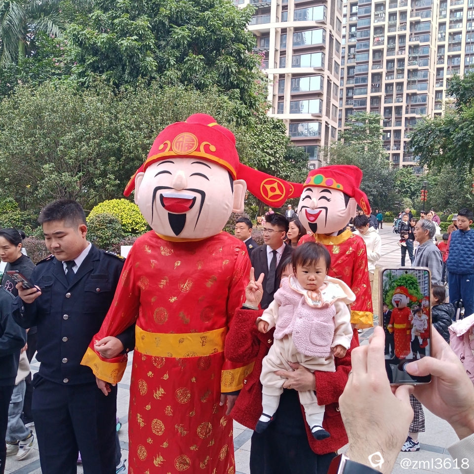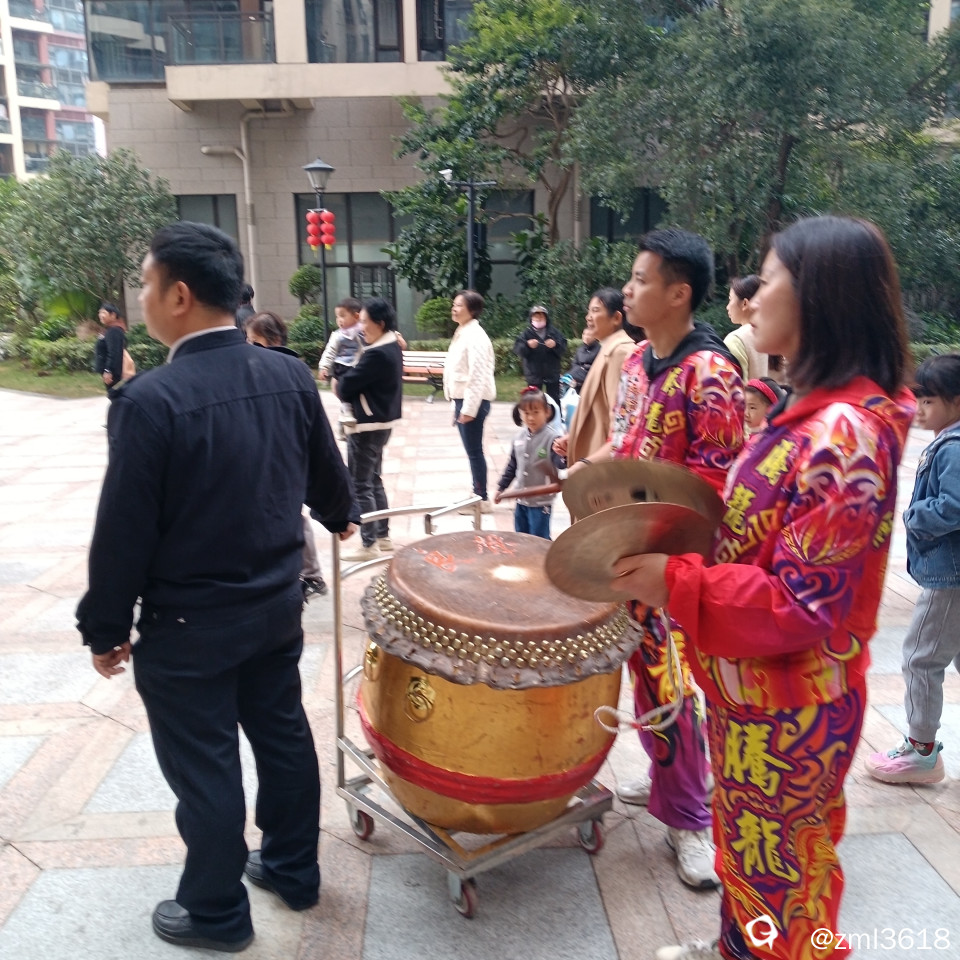小区里热闹非凡,敲锣打鼓的,舞龙狮,迎财神。