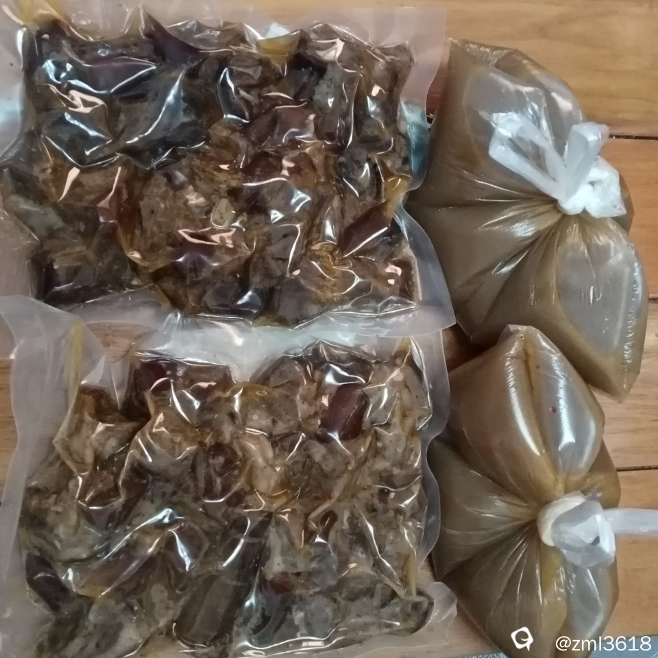 首先是买了两斤多六塘柴火狗肉,将其真空包装。