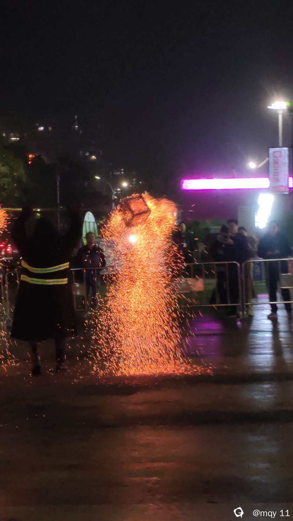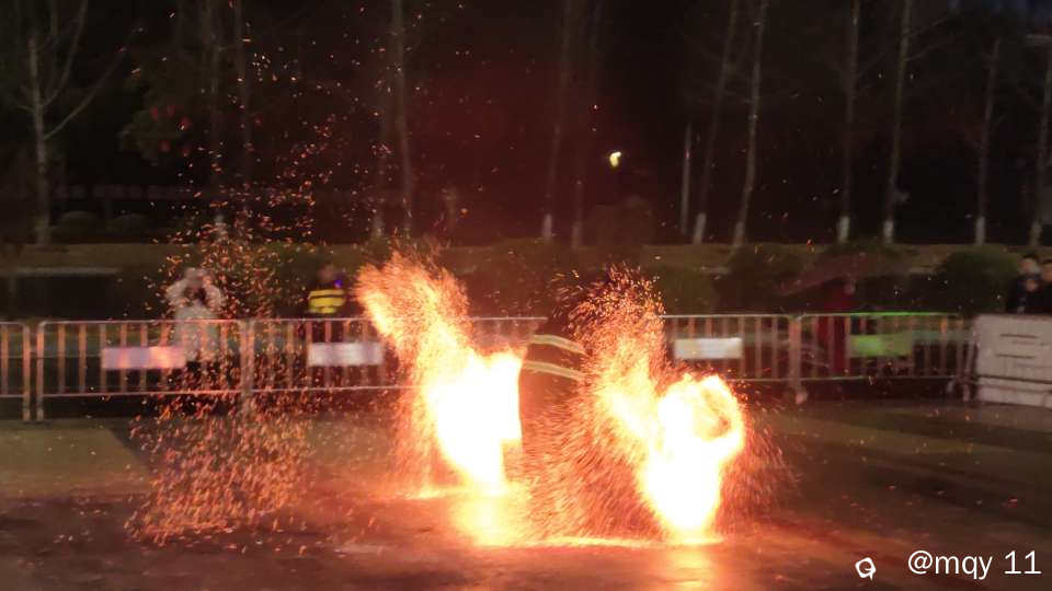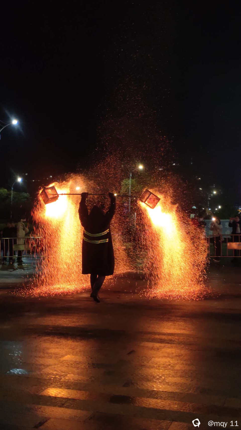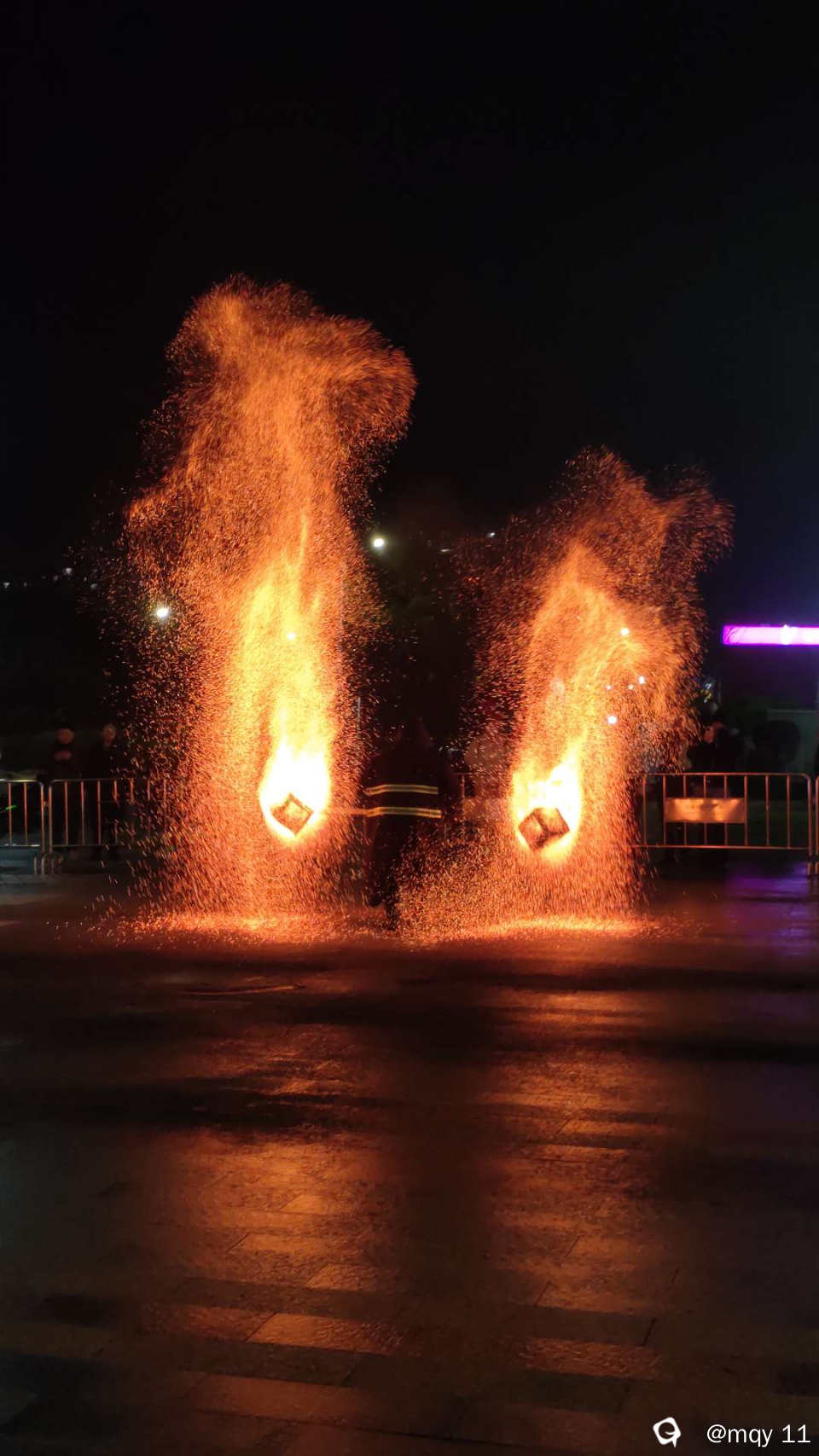 大年初二之夜,在桂林临桂新区某商业广场门口,进行了一场火壶表演。