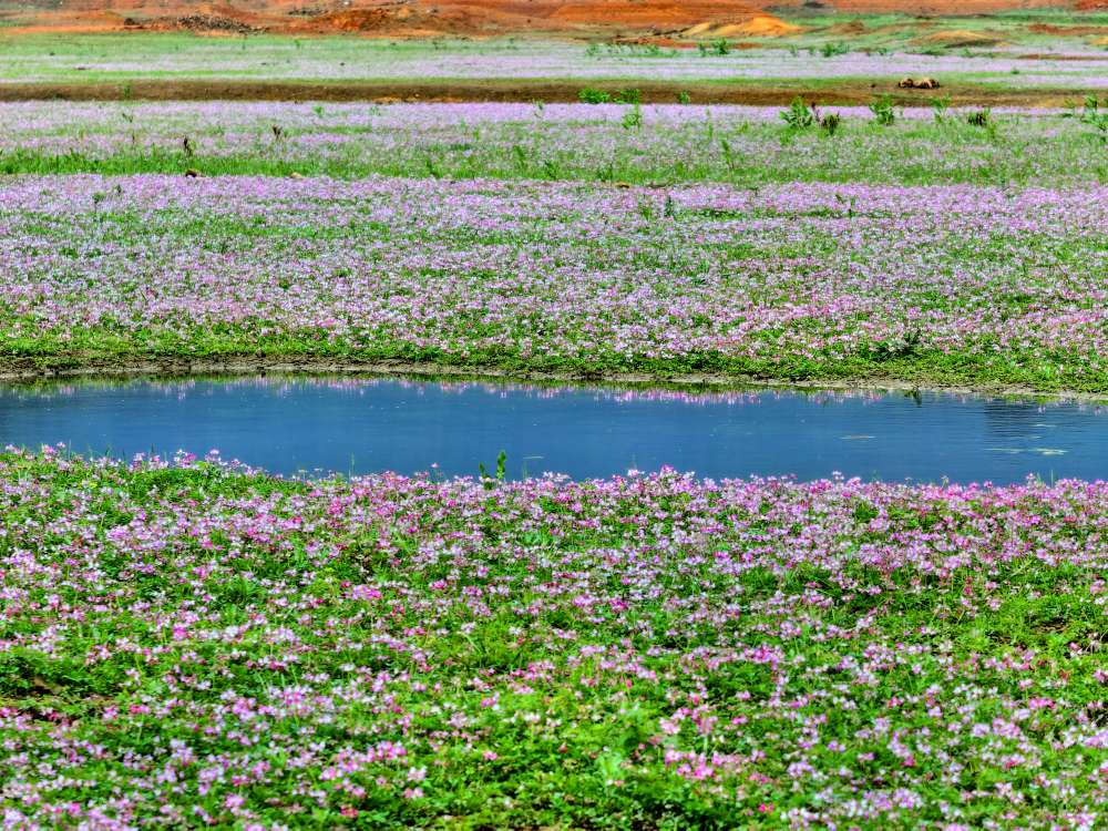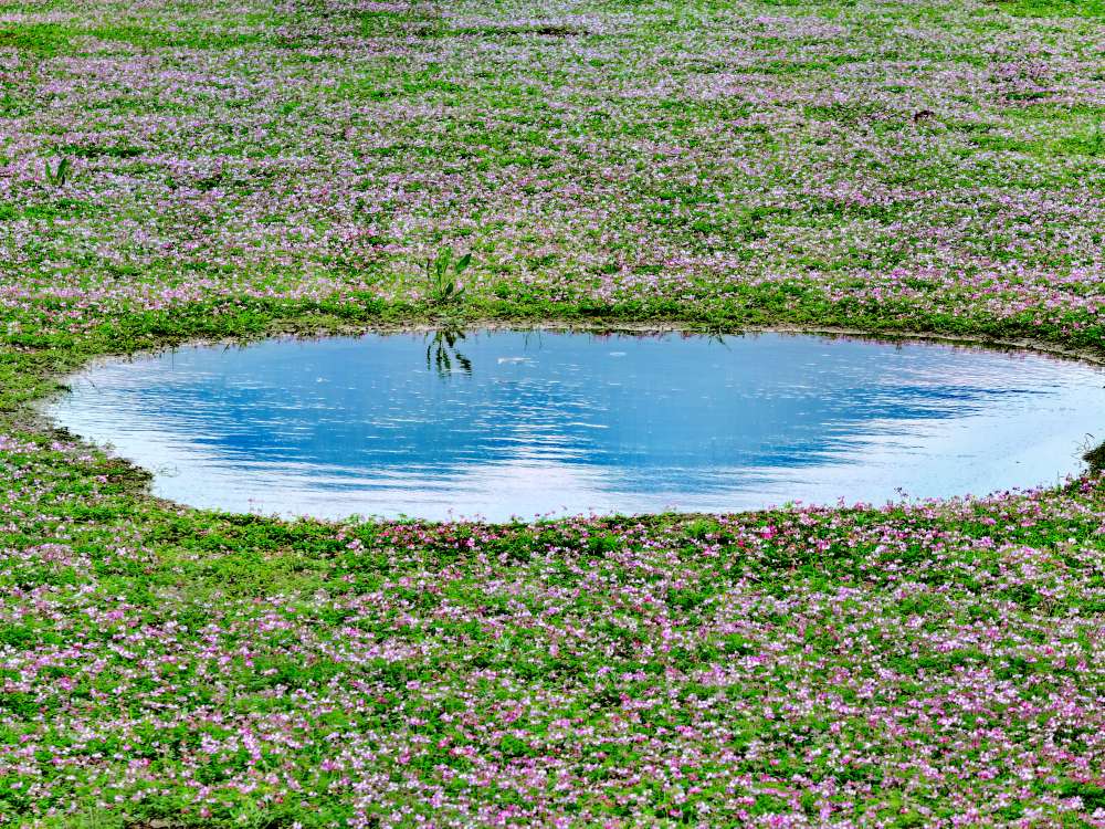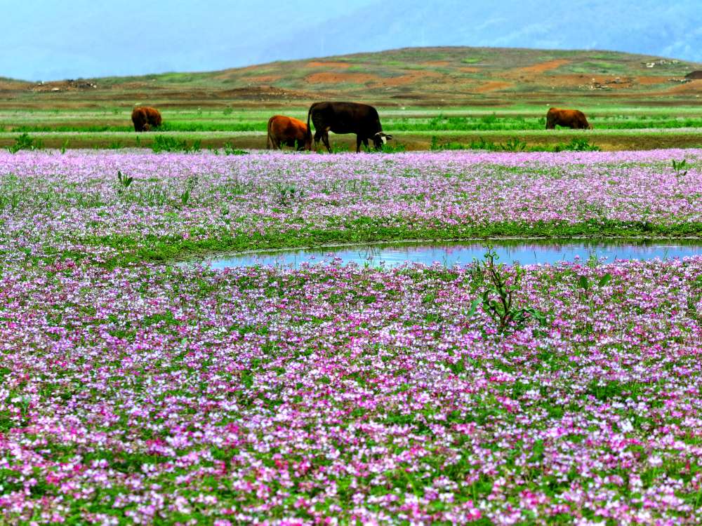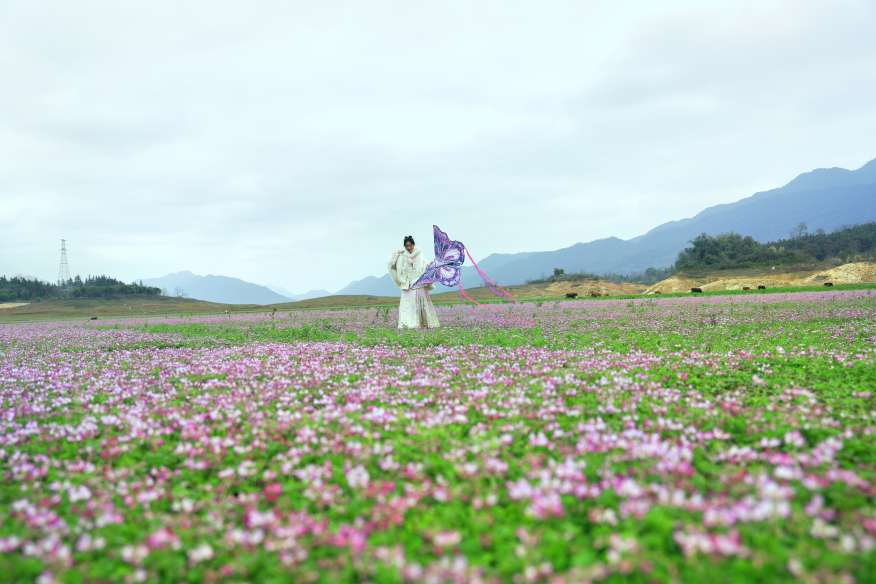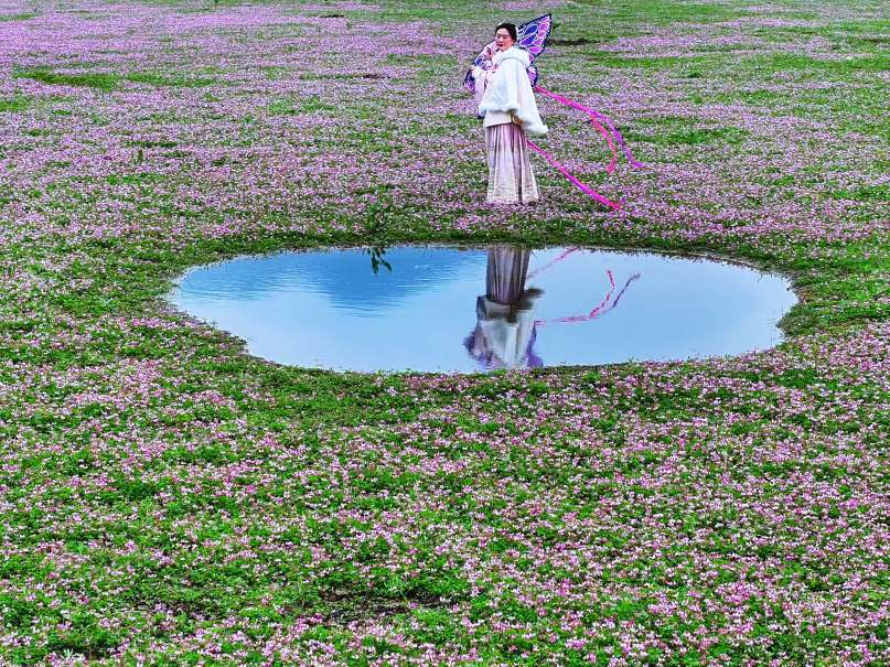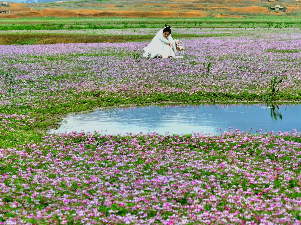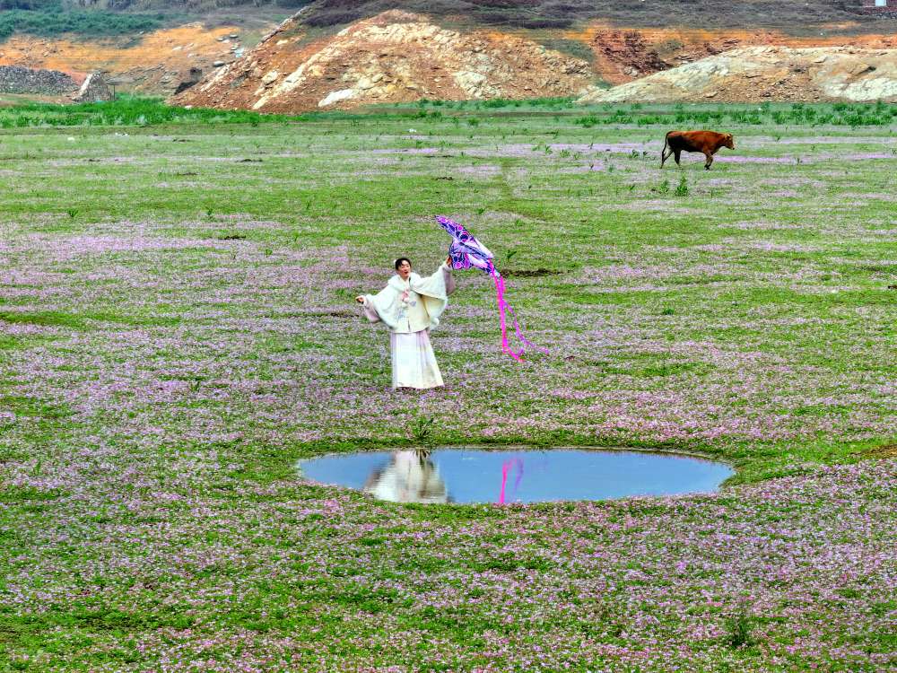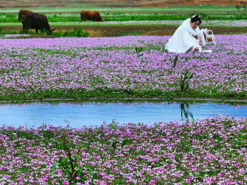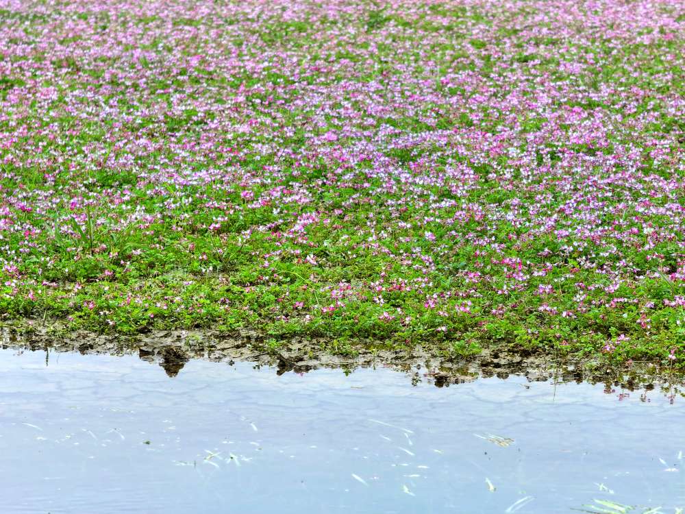 春日私语,桂林灵川大桥村的紫云英又一次花海灿烂。三月的风,轻柔地掠过灵川大桥村干涸的湖面,唤醒了沉睡的紫云英。