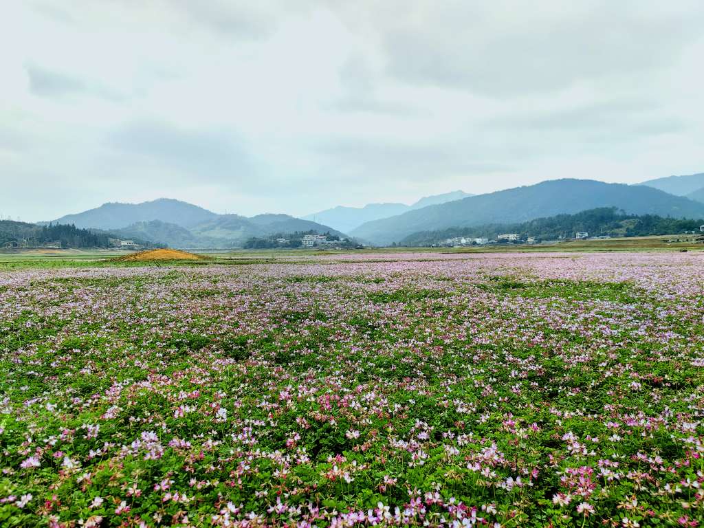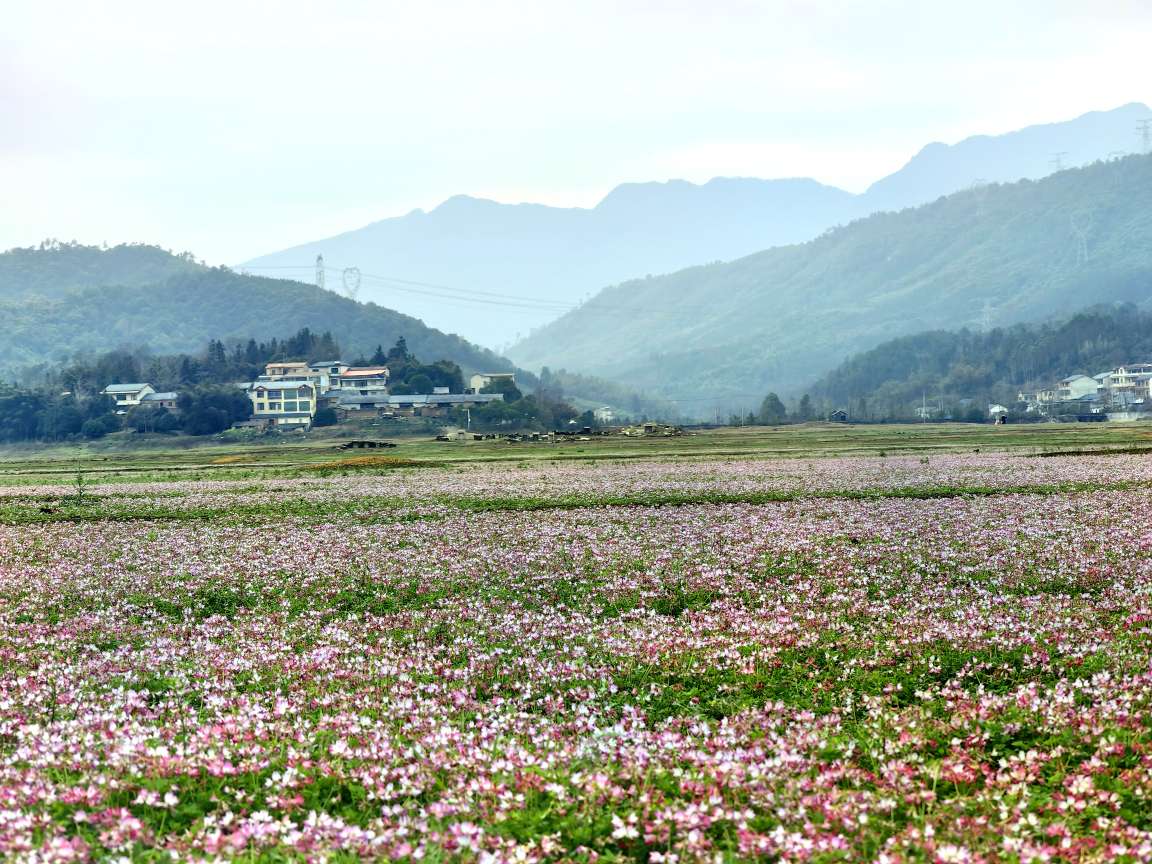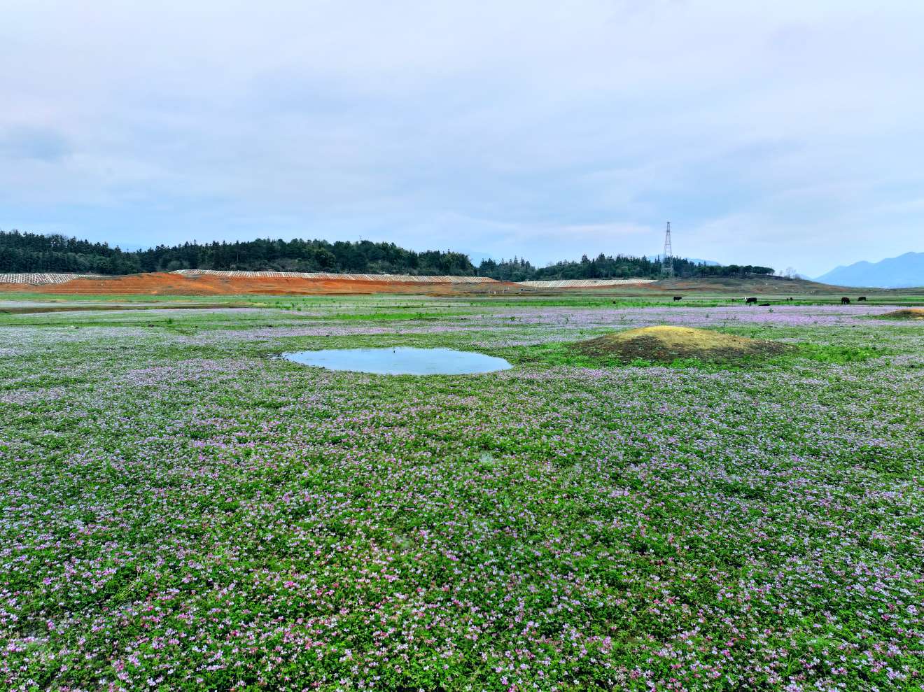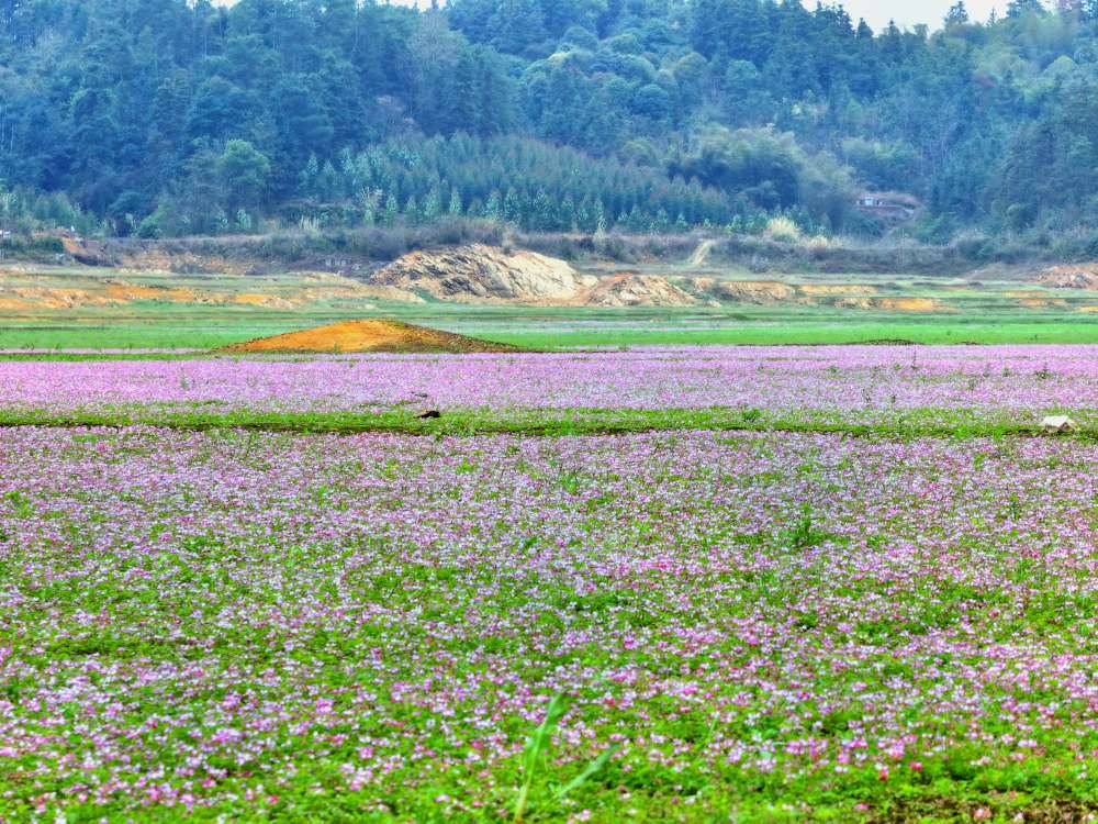 远远望去,紫云英花海如同一幅巨大的紫色地毯,铺展在青山绿水之间,与蓝天白云相映成趣。微风拂过,花海泛起层层波浪,空气中弥漫着淡淡的清香,沁人心脾。