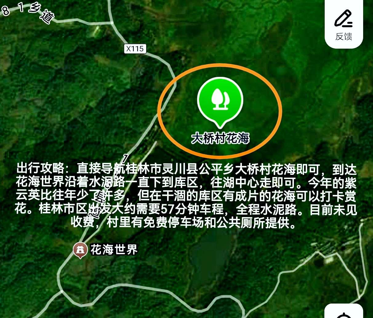 出行攻略:直接导航桂林市灵川县公平乡大桥村花海即可,到达花海世界沿着水泥路一直下到库区,往湖中心走即可。