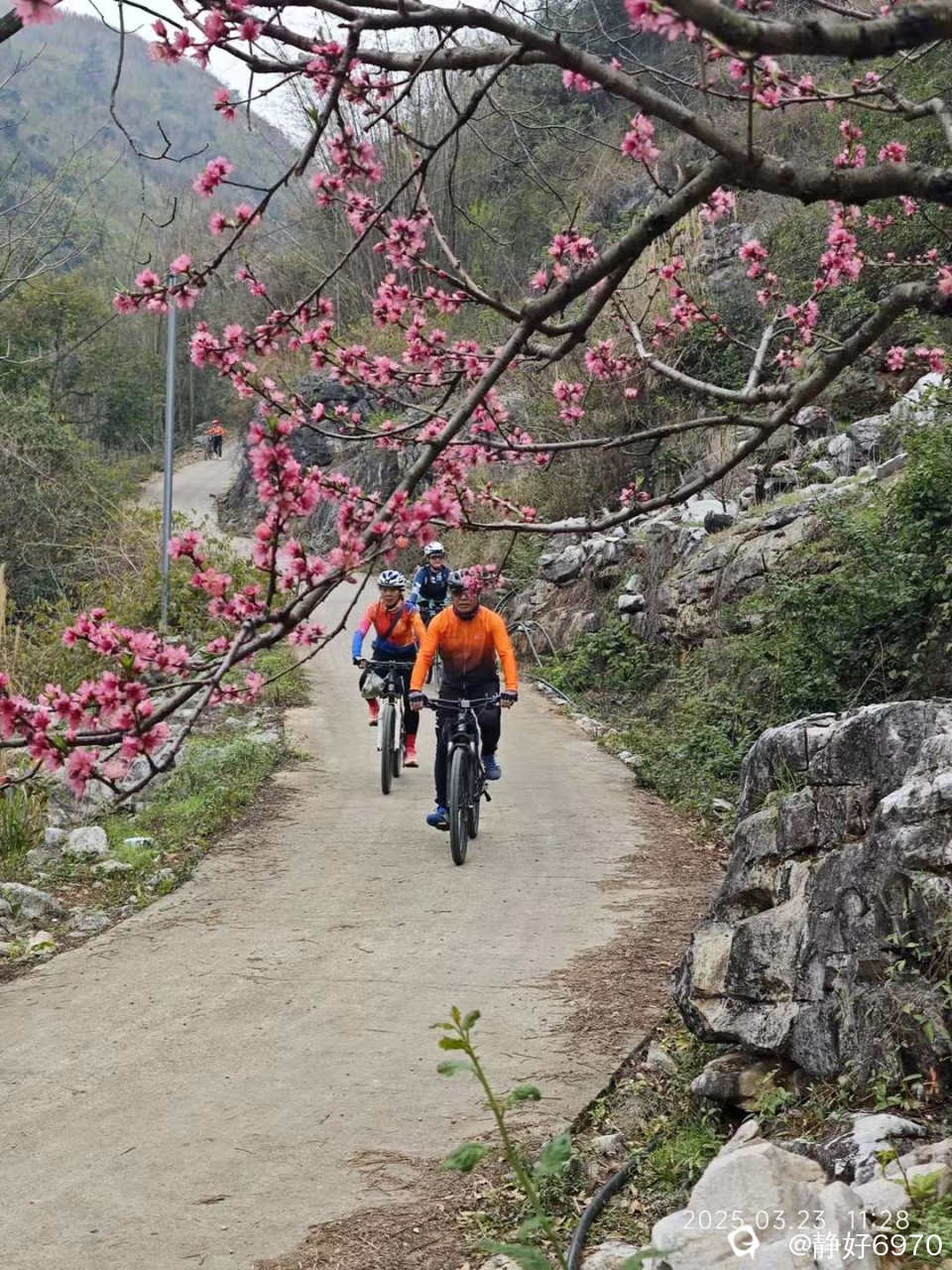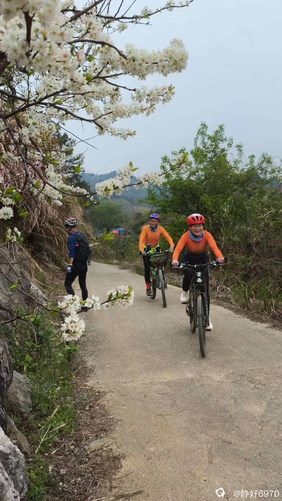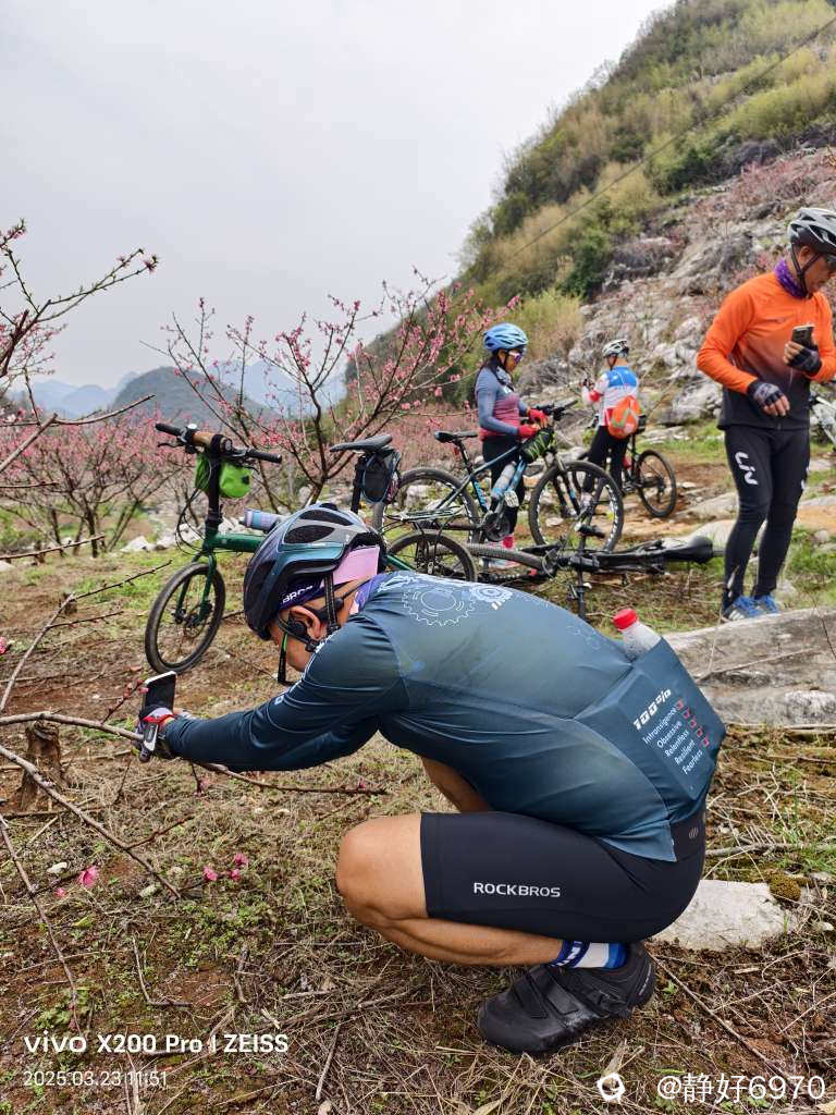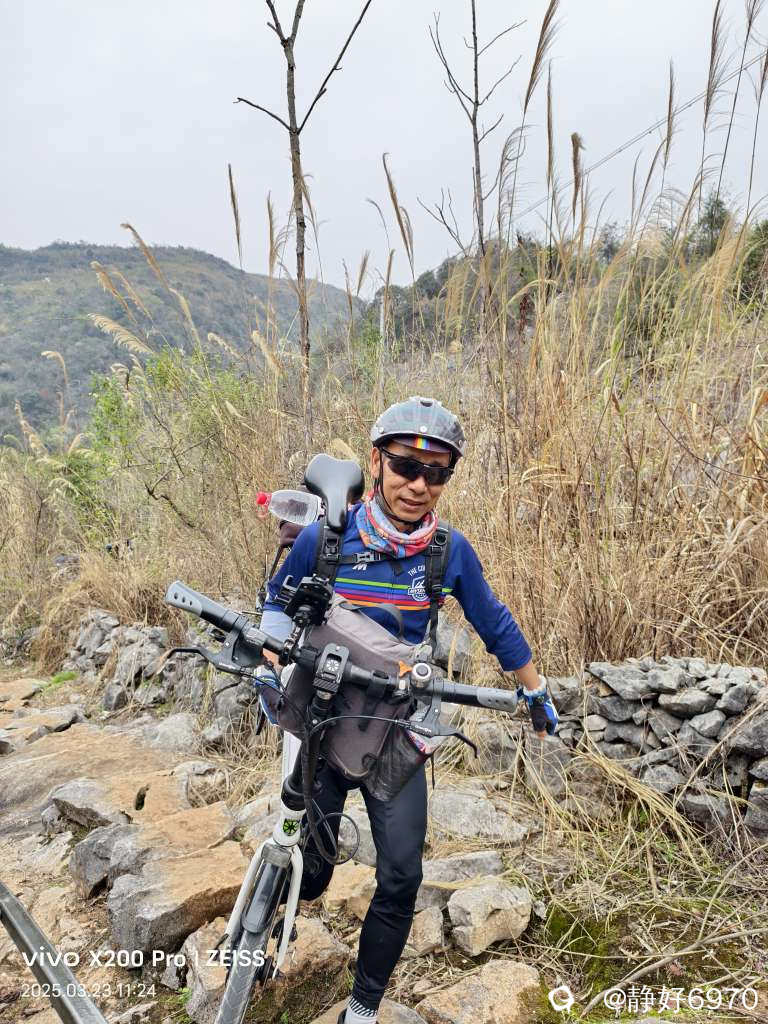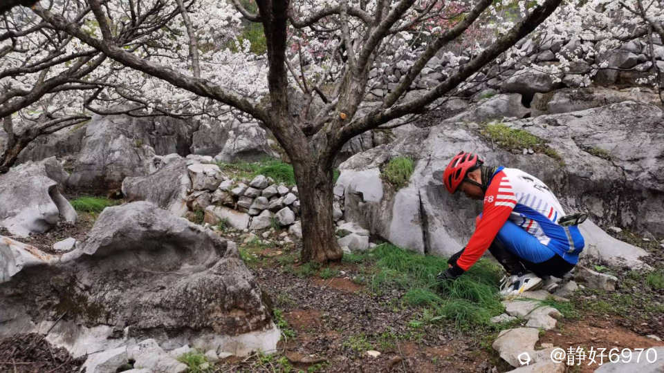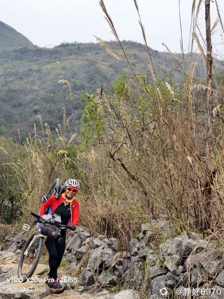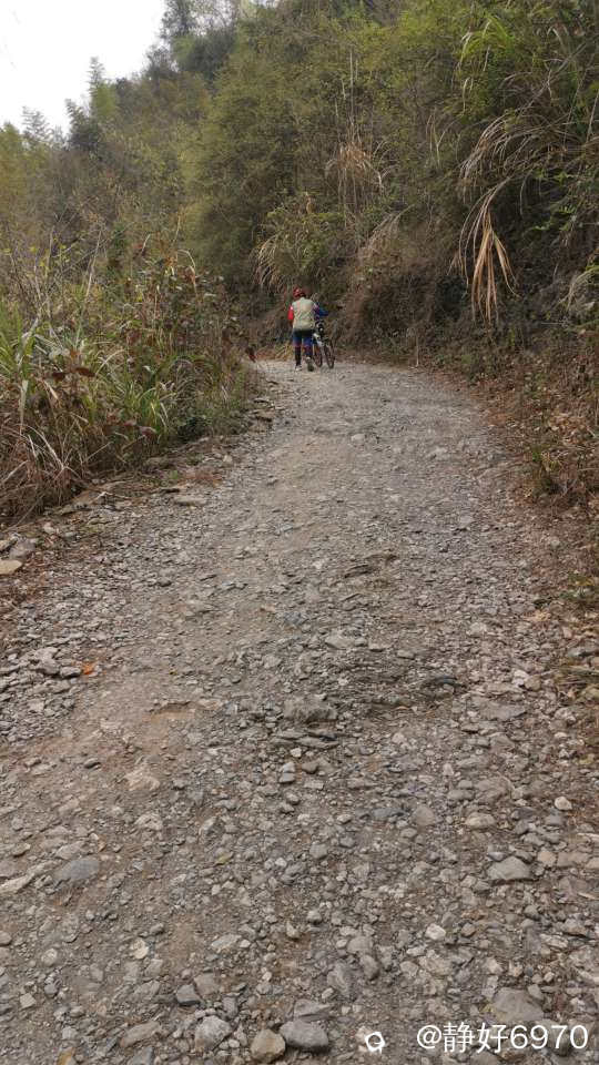 唐僧取经要经过九九八十一难,我们想去看美丽的桃花,要爬过一段蜿蜒起伏的大坡,路面全是碎石头,我根本骑不上去,只好下来推车。大神们不一样,几乎全是骑上去的。