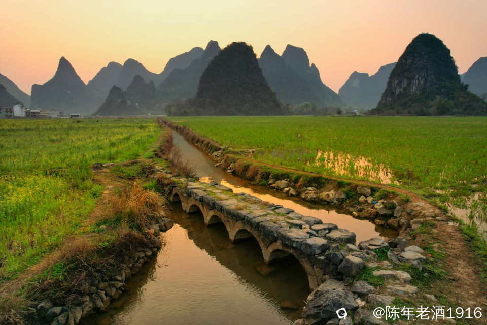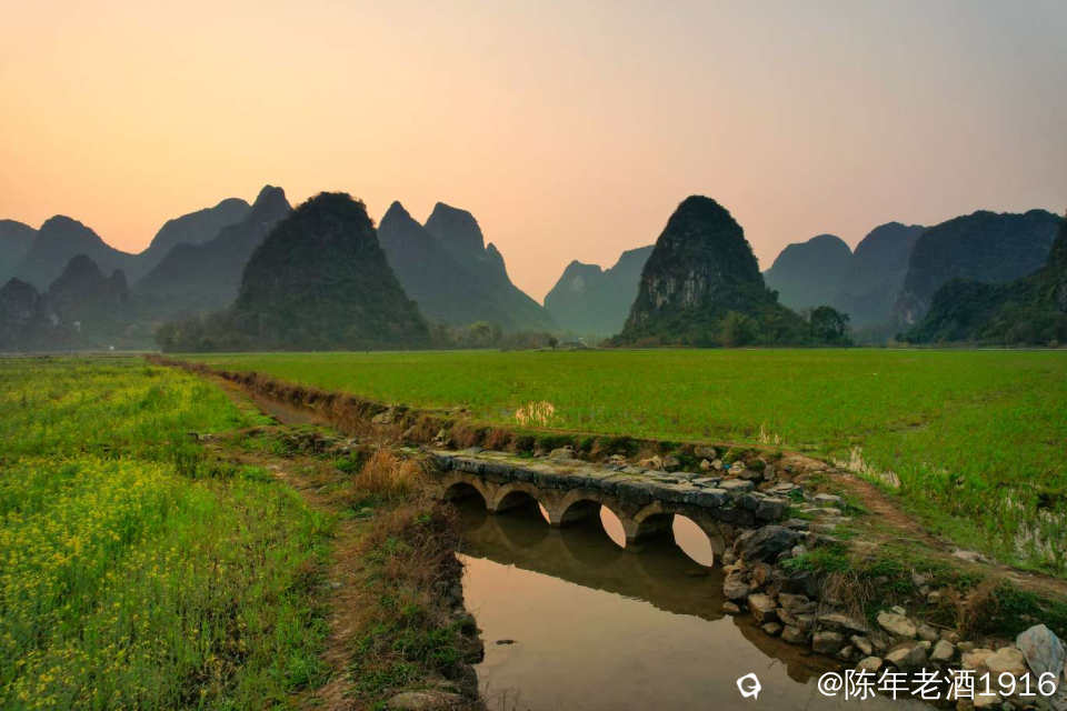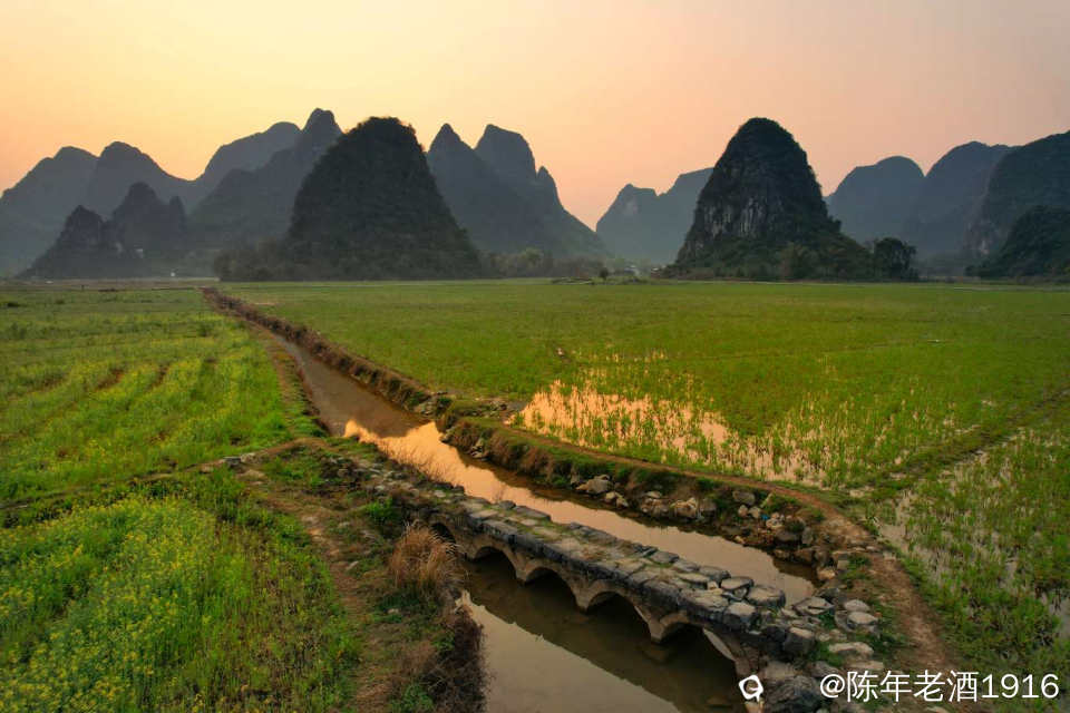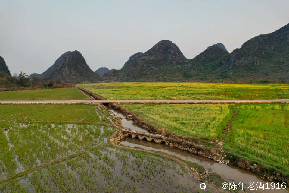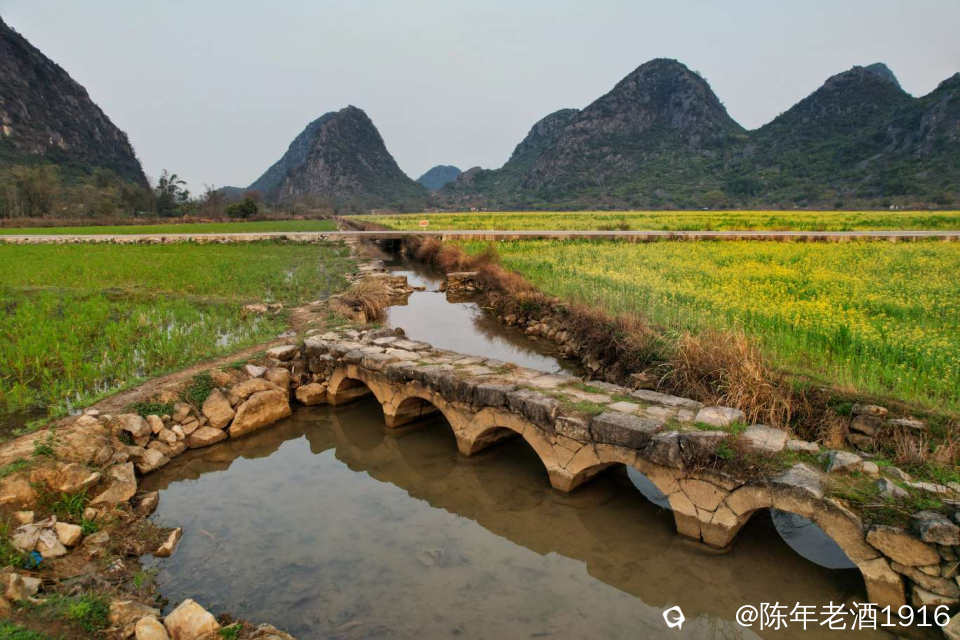 四塘田心村这座小五拱石桥,每次去都要打打卡,每次都有不一样的风景。这座桥就在去往田心村的东侧马路边水渠上,由于比较小且桥面与田埂路在一个平面上,不像状元楼等其他拱桥的拱形高出路面那么明显,所以不留意的话还是对它视而不见。其实,我觉得这座小巧玲珑且精致,桥身全部由石头累砌而成,保存得非常完整,可见当年的工匠技艺水准之高。清晨的田心村,东边伴随着黎明的蛋黄光辉,这座五拱桥与田间的油菜花和群山交相辉映,妥妥一幅菜花古桥山水田园画卷,试问有谁能抗拒这浑然天成的自然风光。