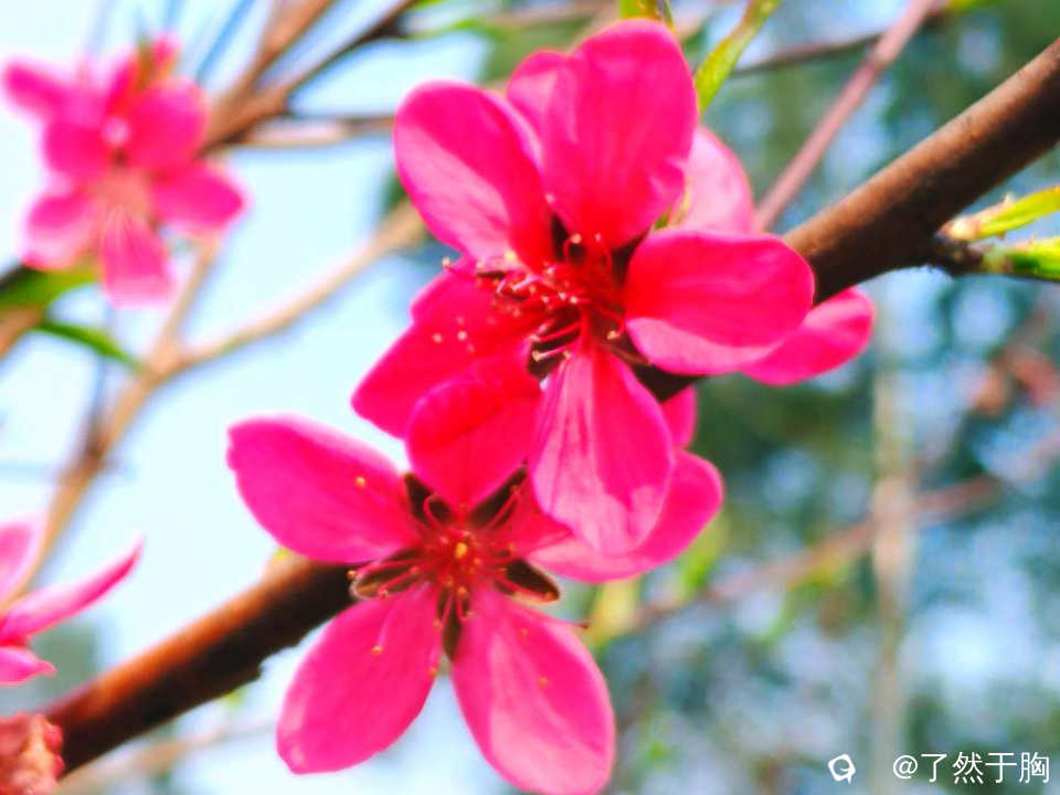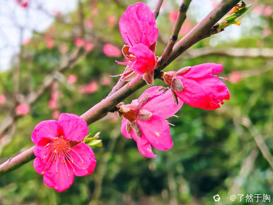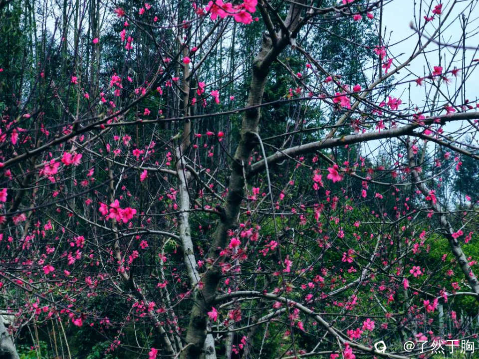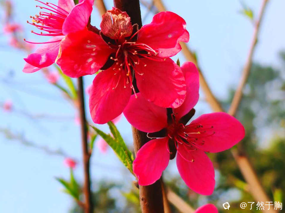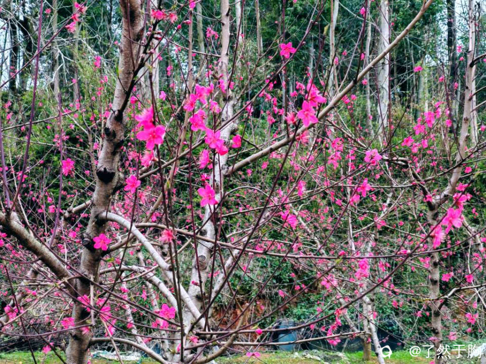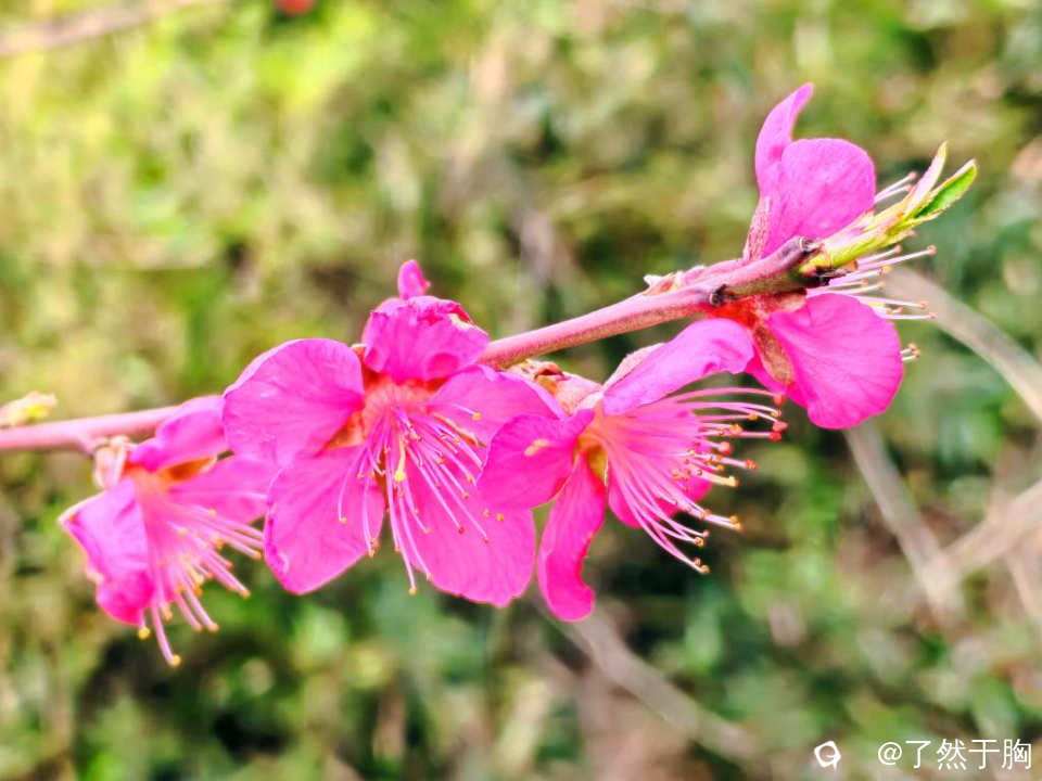因没遇到村民,后经查询度娘,方知其名为碧桃,是桃子的一个变种。我原先也知道碧桃这一品种,但都是粉色,而这胭脂红色的桃花,却是第一次见,确实让我惊喜而赏心悦目啊。