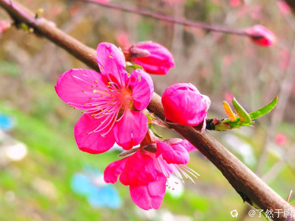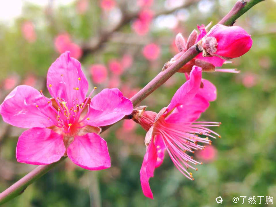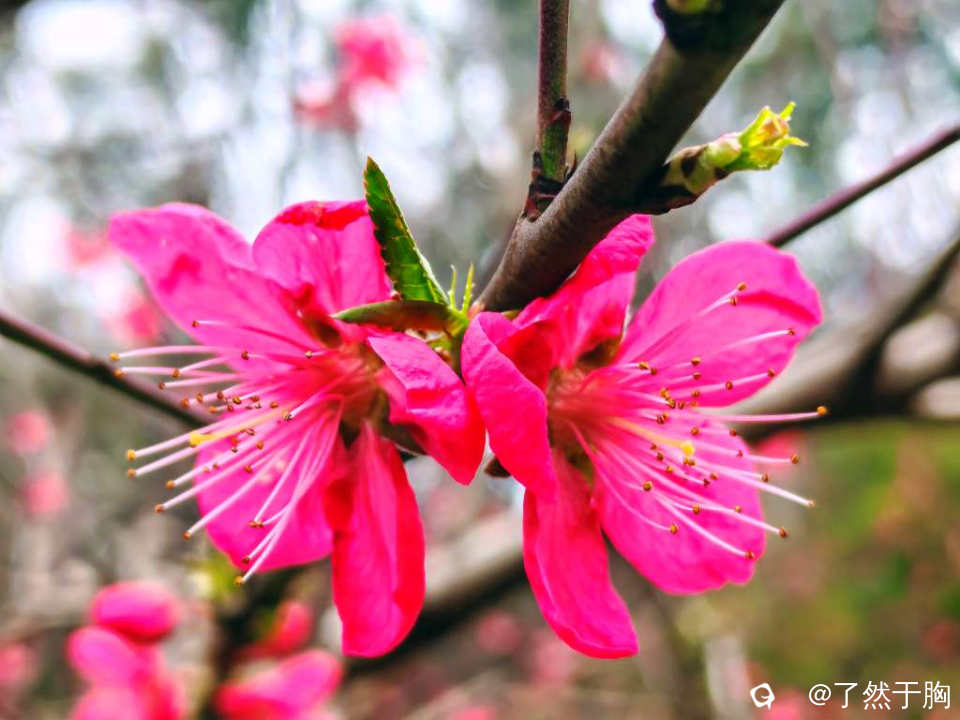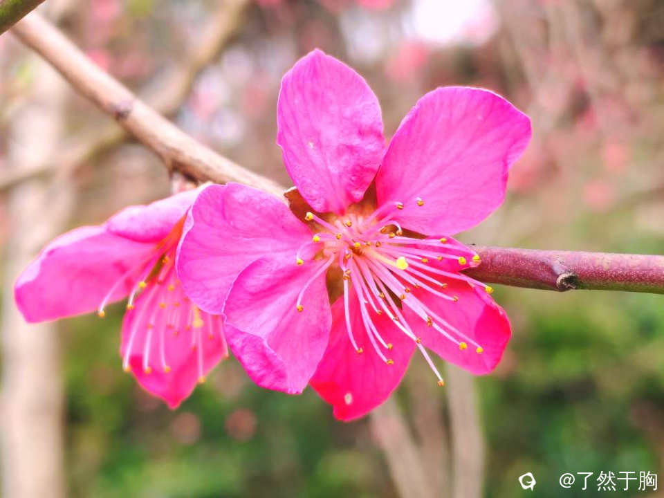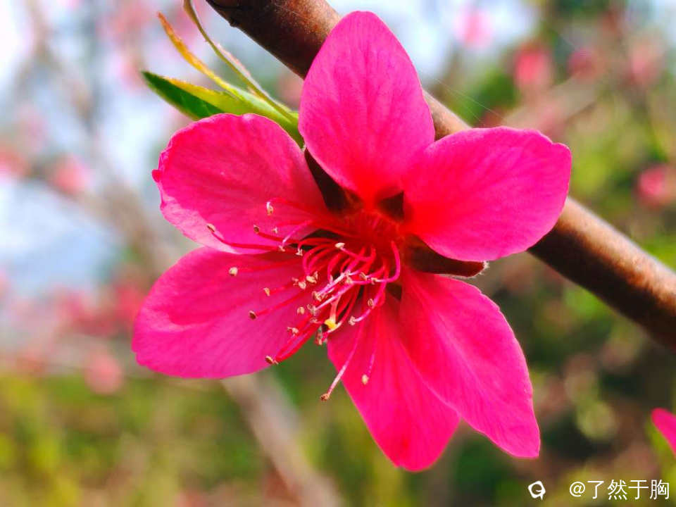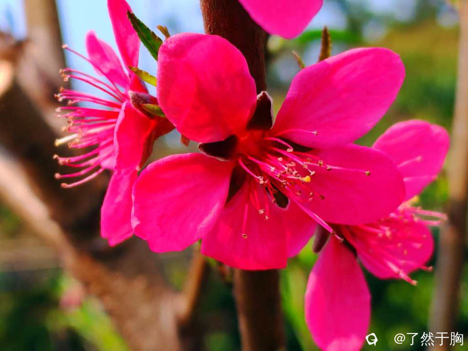 因没遇到村民,后经查询度娘,方知其名为碧桃,是桃子的一个变种。我原先也知道碧桃这一品种,但都是粉色,而这胭脂红色的桃花,却是第一次见,确实让我惊喜而赏心悦目啊。