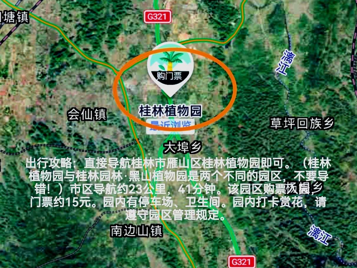 出行攻略:直接导航桂林市雁山区桂林植物园即可。(桂林植物园与桂林园林·黑山植物园是两个不同的园区,不要导错!)市区导航约23公里,41分钟。