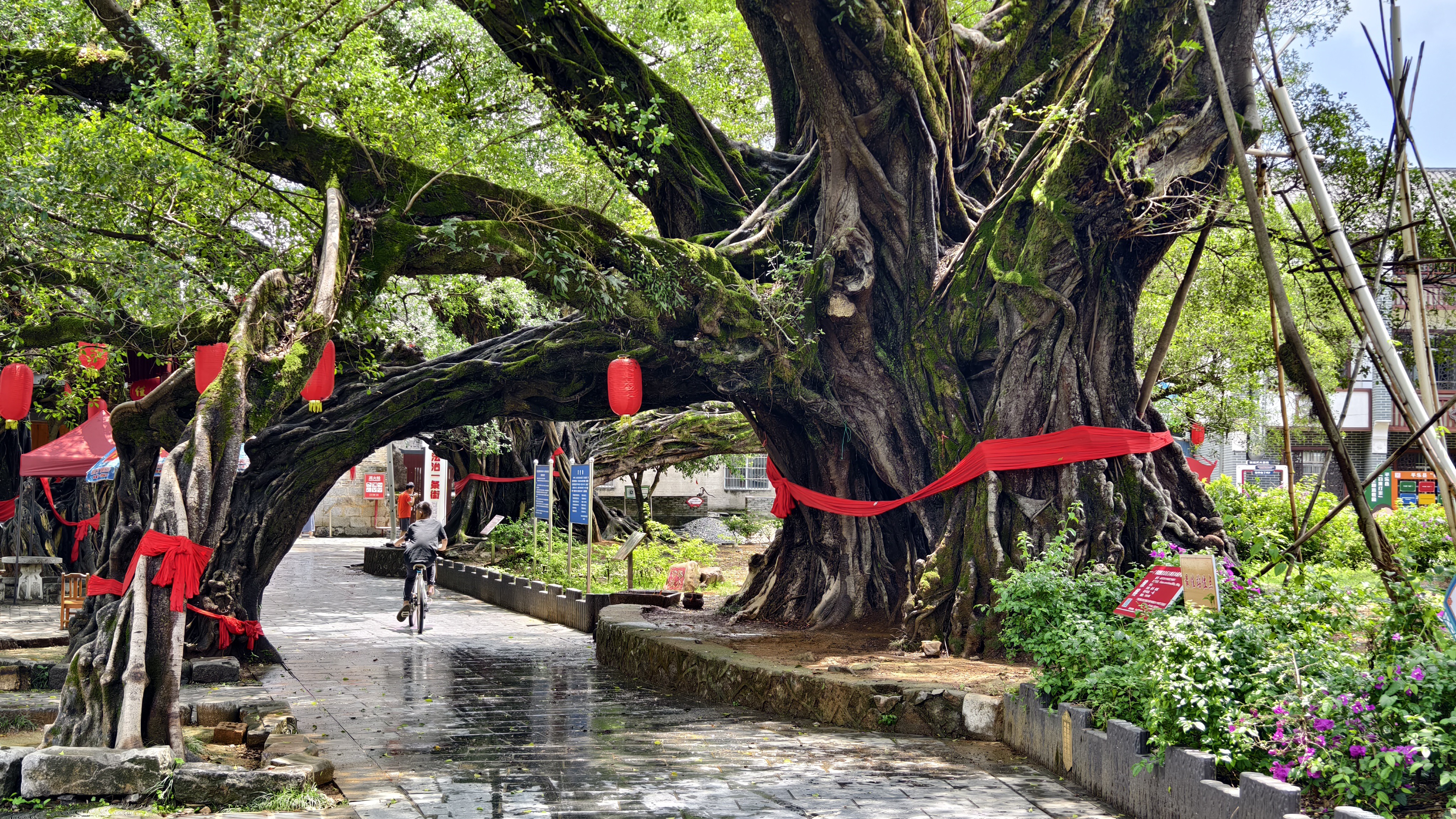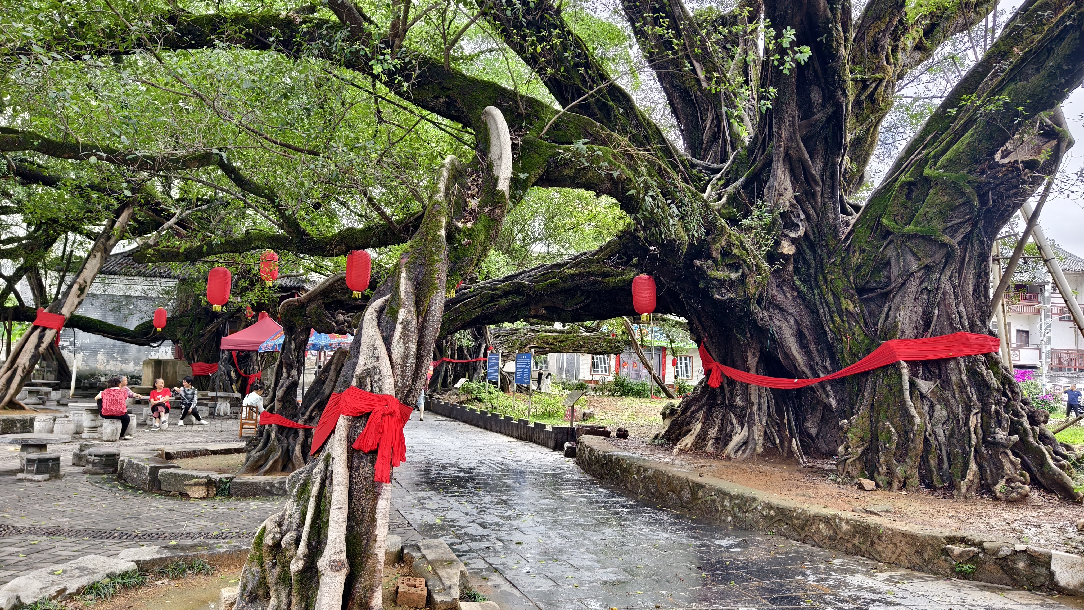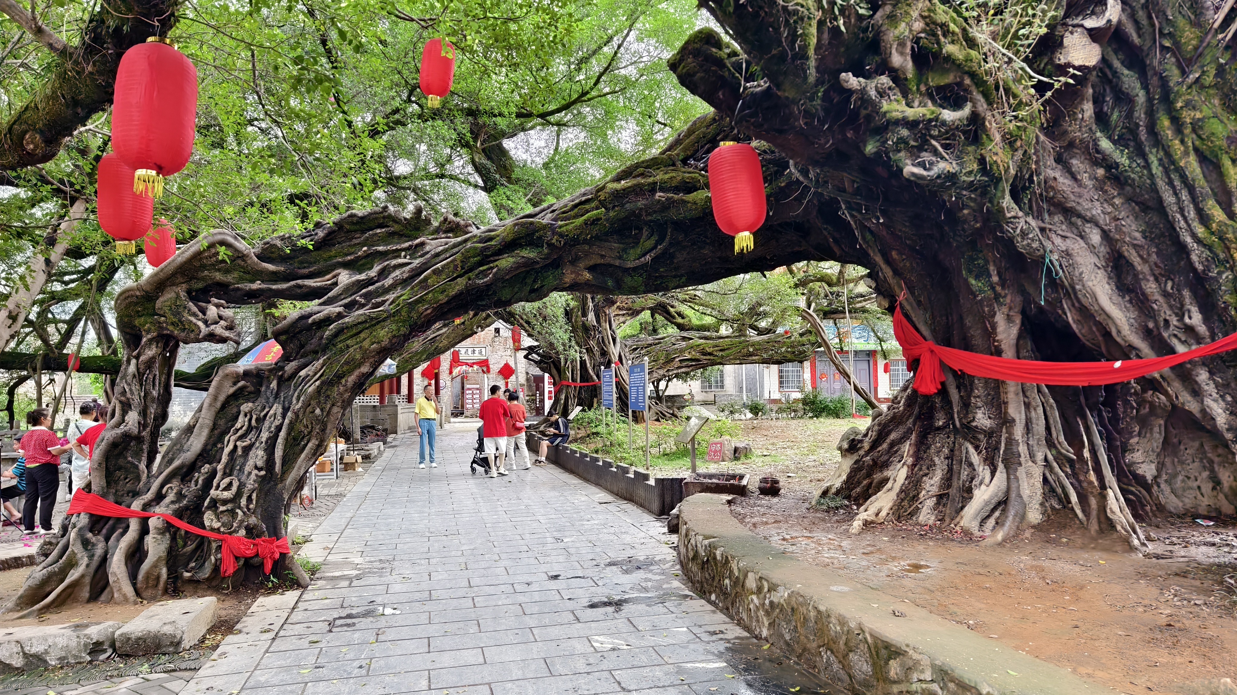 来到古镇,“华夏第一榕”果然名不虚传:古榕成群相拥,古朴苍劲,枝繁叶茂,枝干相连,形成了好几个拱门,其中最大的一棵被称为月老古榕,这也是这个古村落最值得看的千年古榕了,就在古镇入口处。