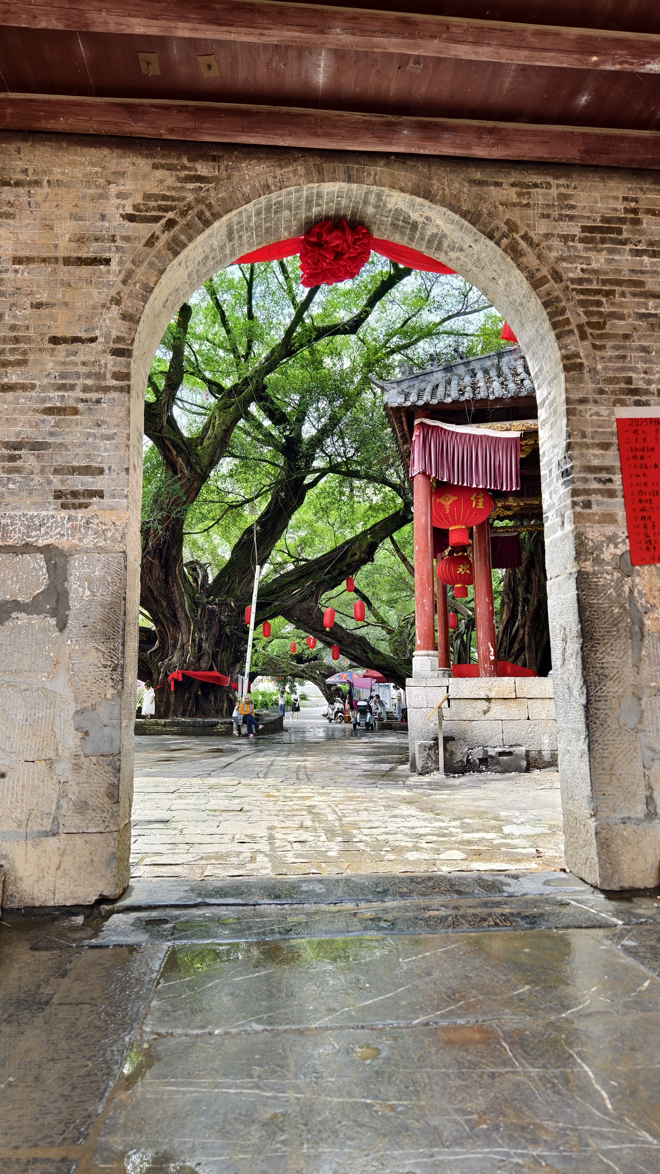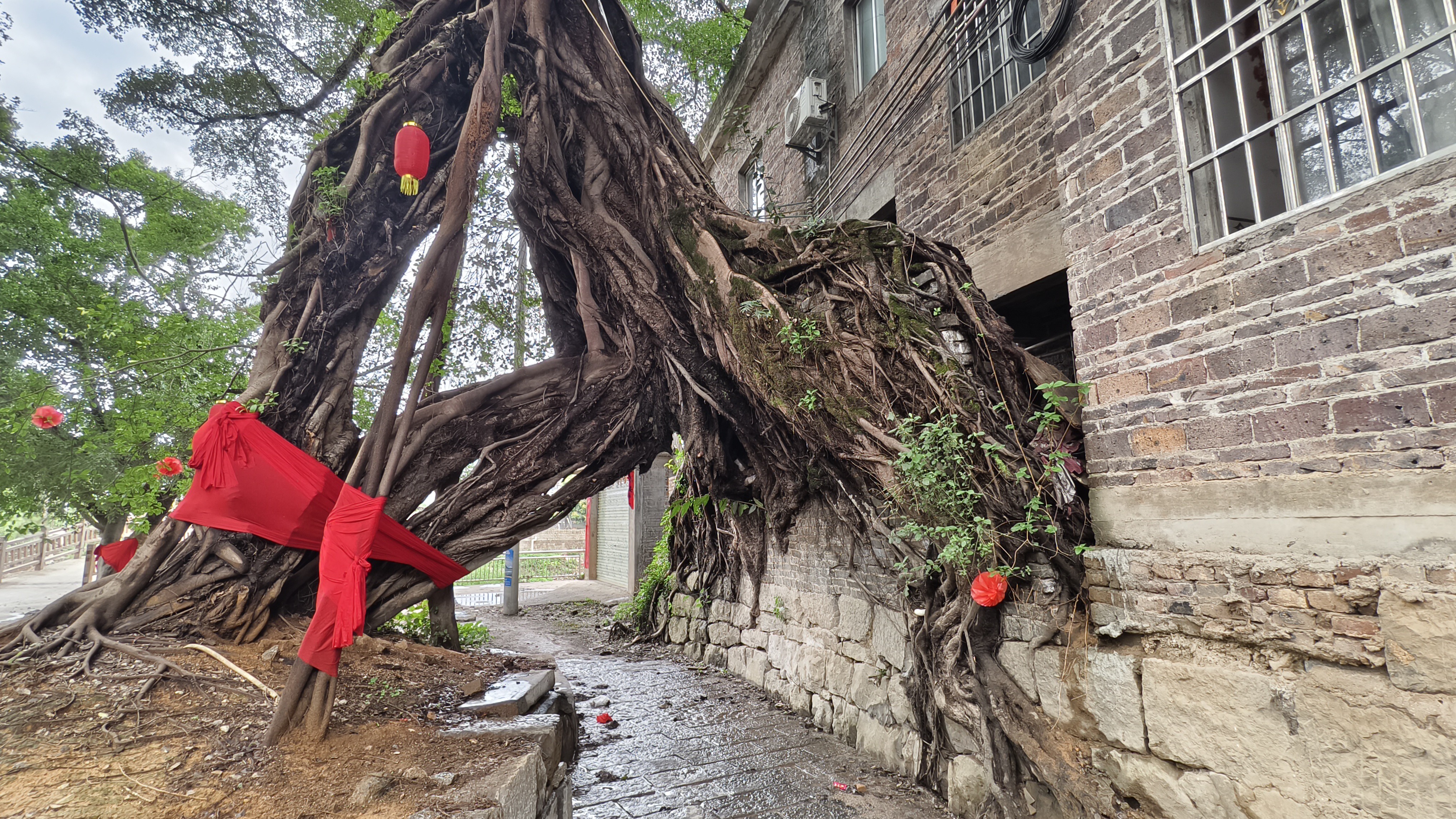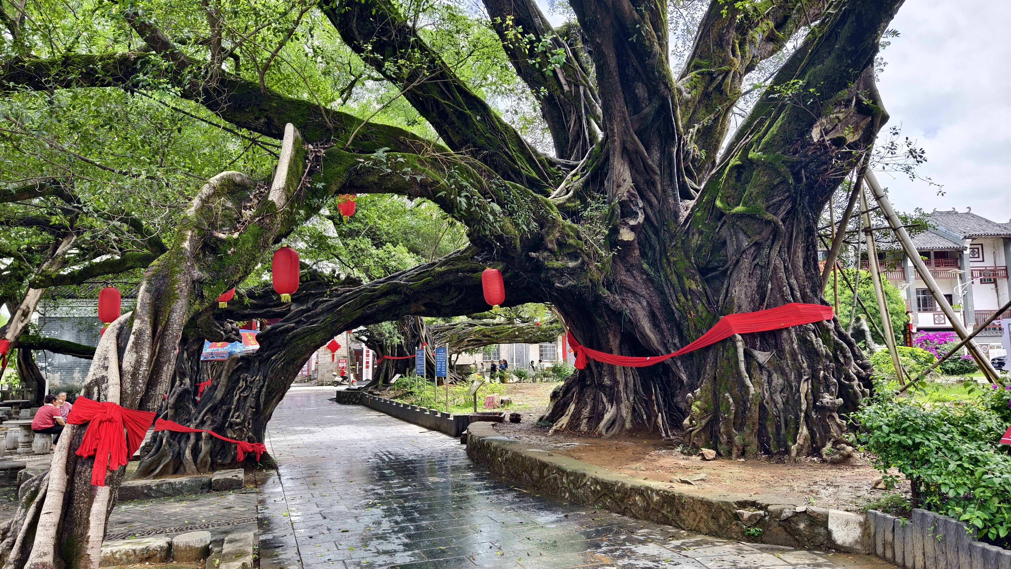 来到古镇,“华夏第一榕”果然名不虚传:古榕成群相拥,古朴苍劲,枝繁叶茂,枝干相连,形成了好几个拱门,其中最大的一棵被称为月老古榕,这也是这个古村落最值得看的千年古榕了,就在古镇入口处。