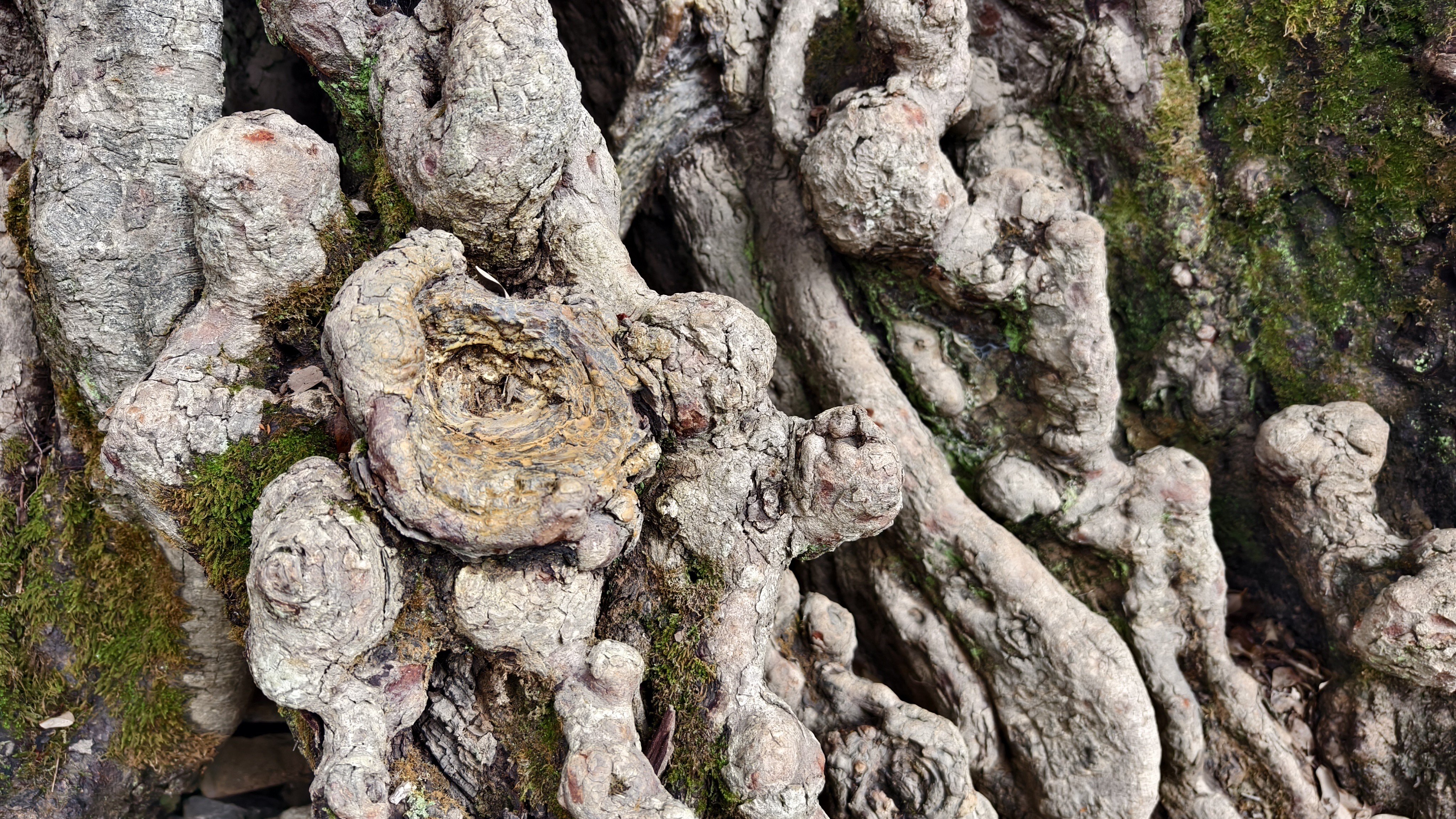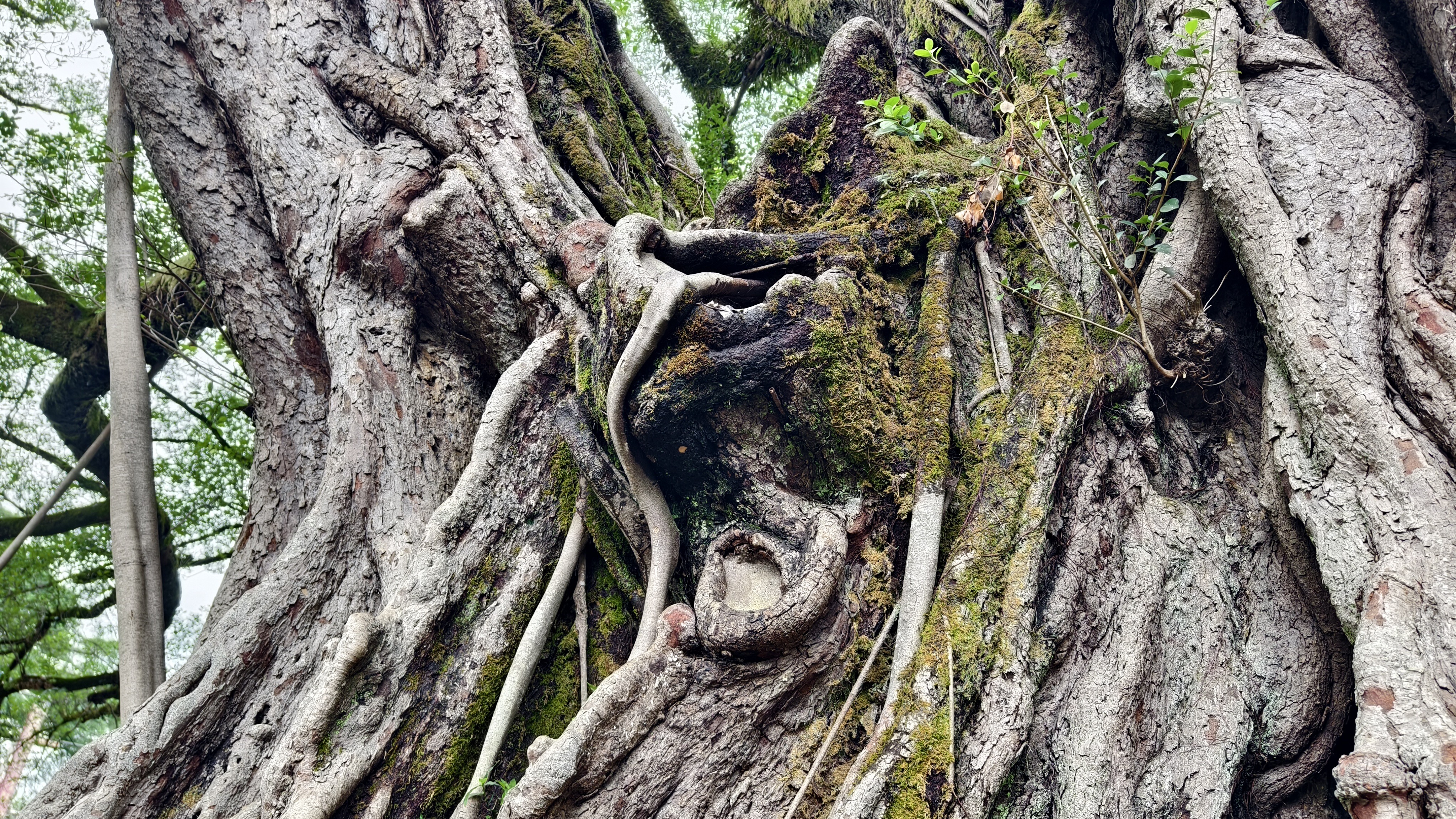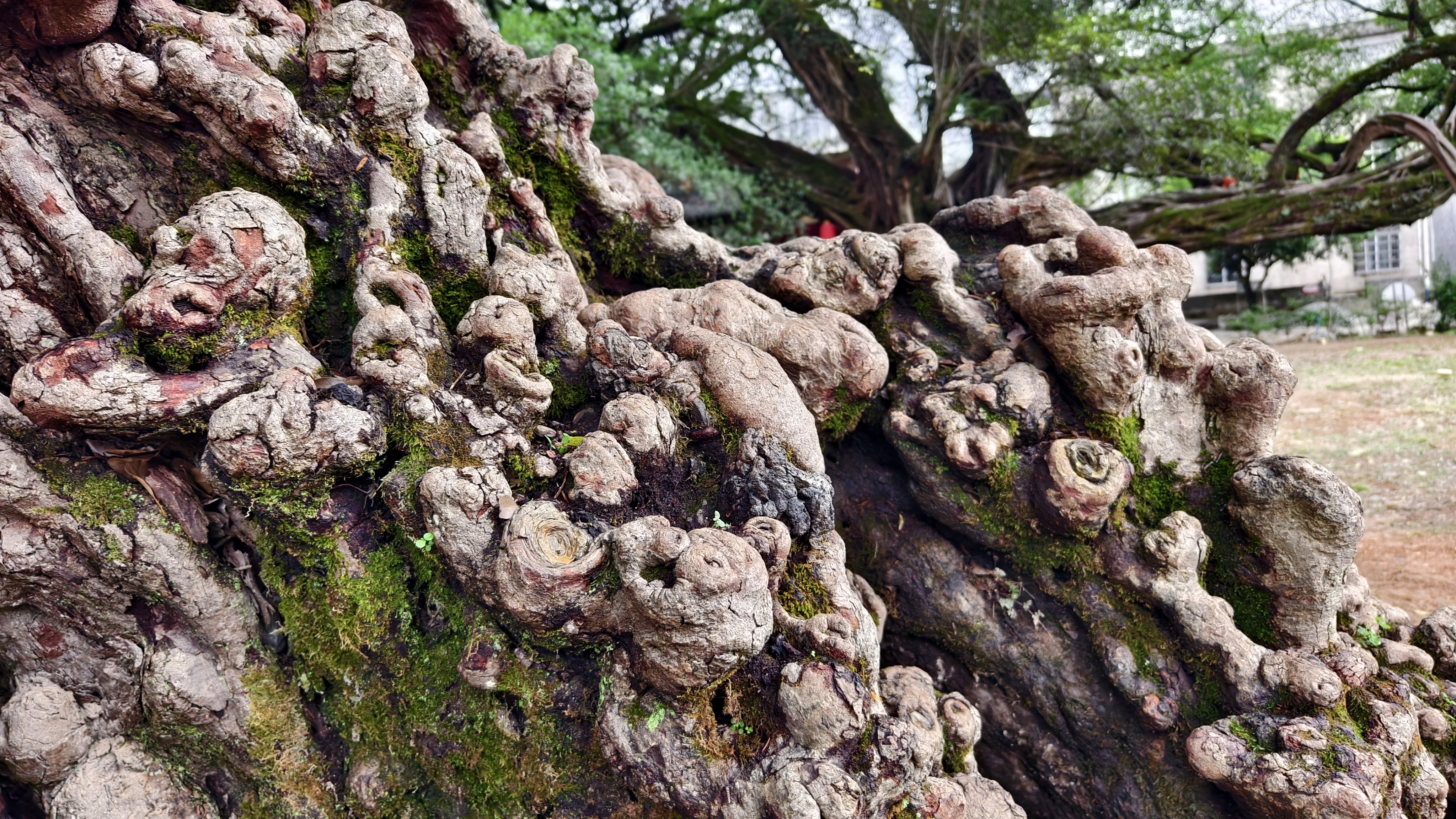虬枝凌空,拱如明月,绿叶浓阴,覆盖着由盘龙根须构成的天然雕饰拱门。