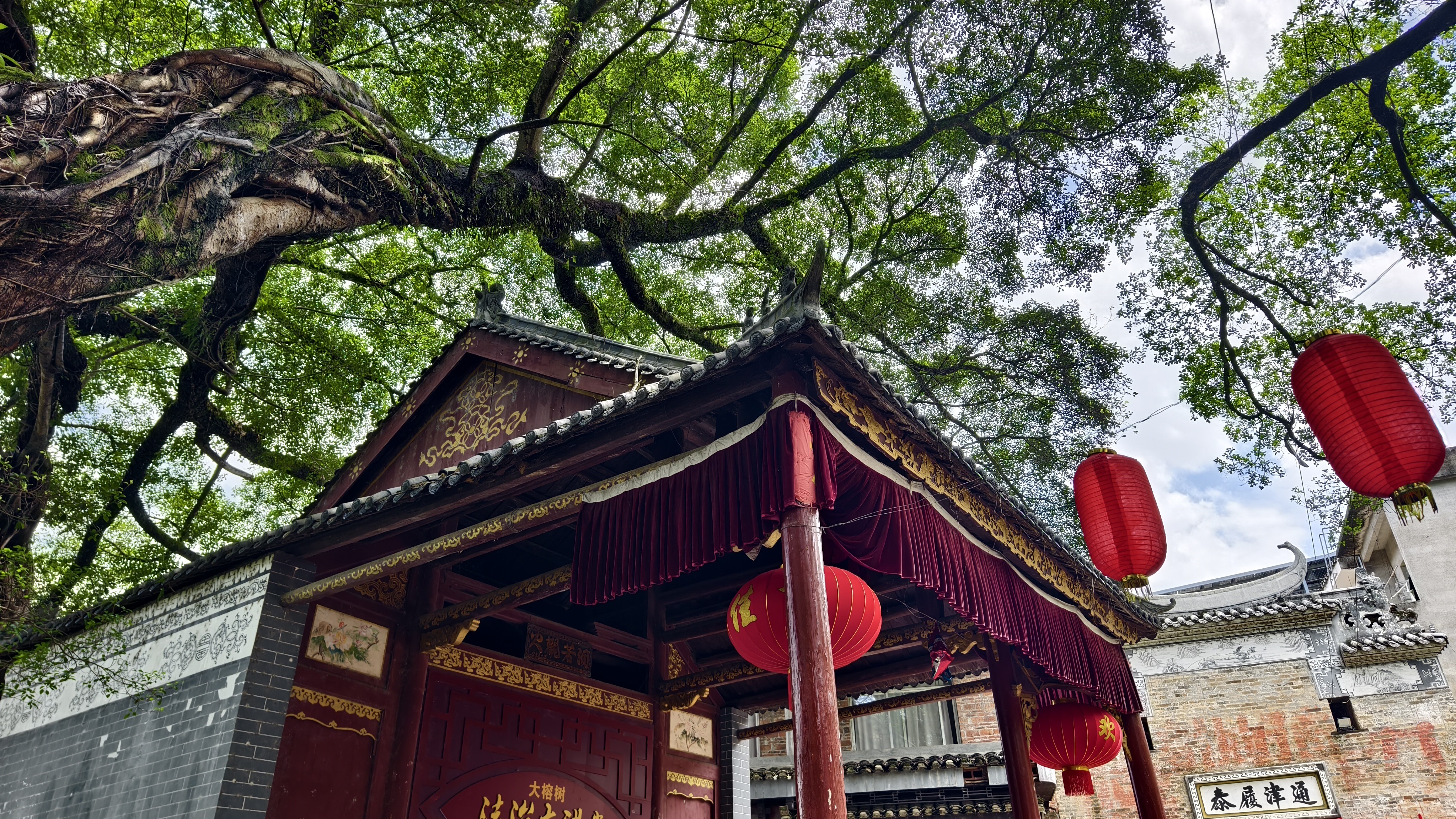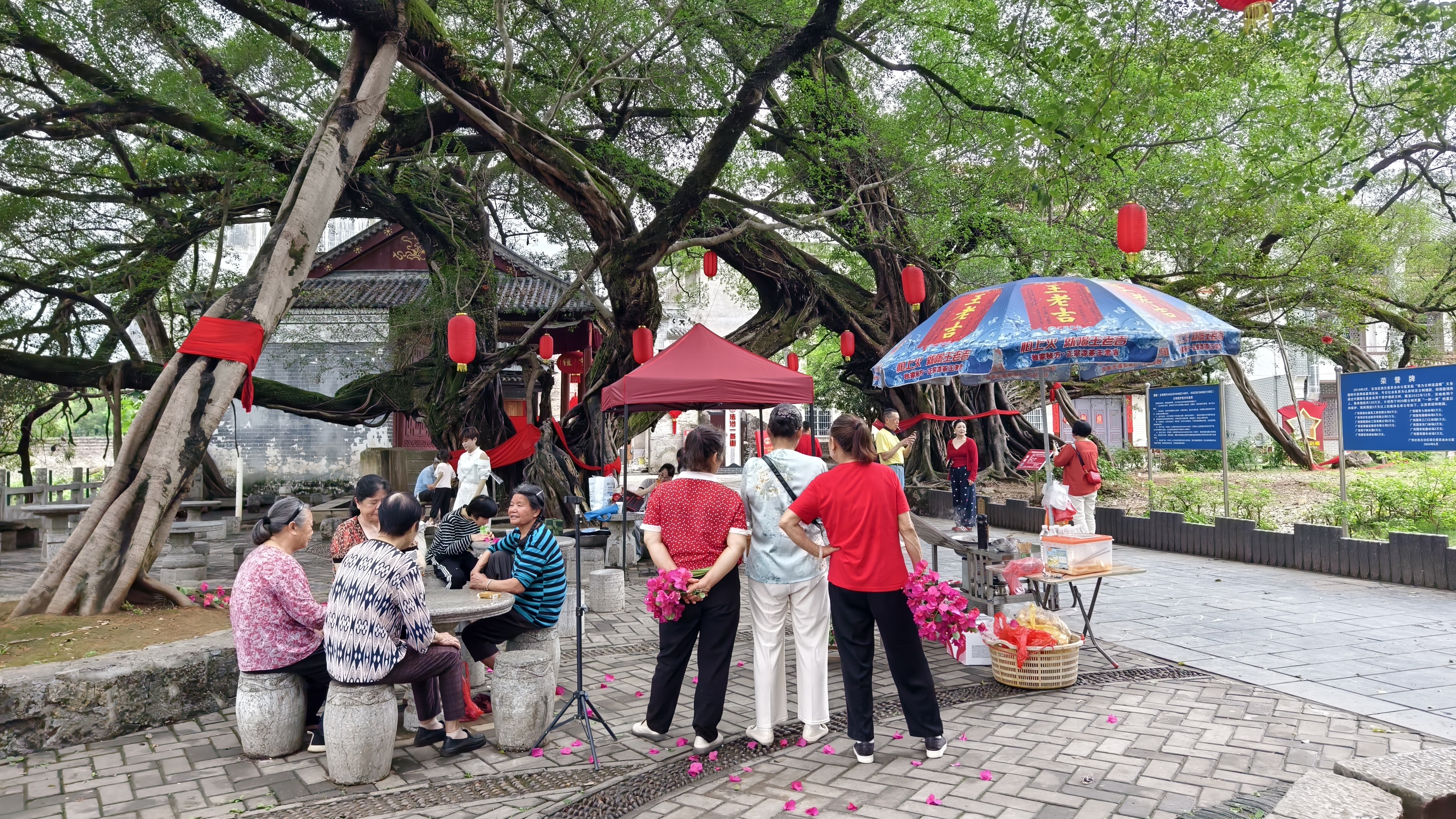 榕树下的人有摆摊的,有跳广场舞的,有闲聊的……看着这些安逸的老人、走在古街里随处可见家家户户供着的财神爷,土地公公、土地婆婆,这些真真切切的生活,淳朴的民风,与美丽的古榕风光,融合在一起,千年后的古村正焕发着现代派生机勃勃的另一种魅力。