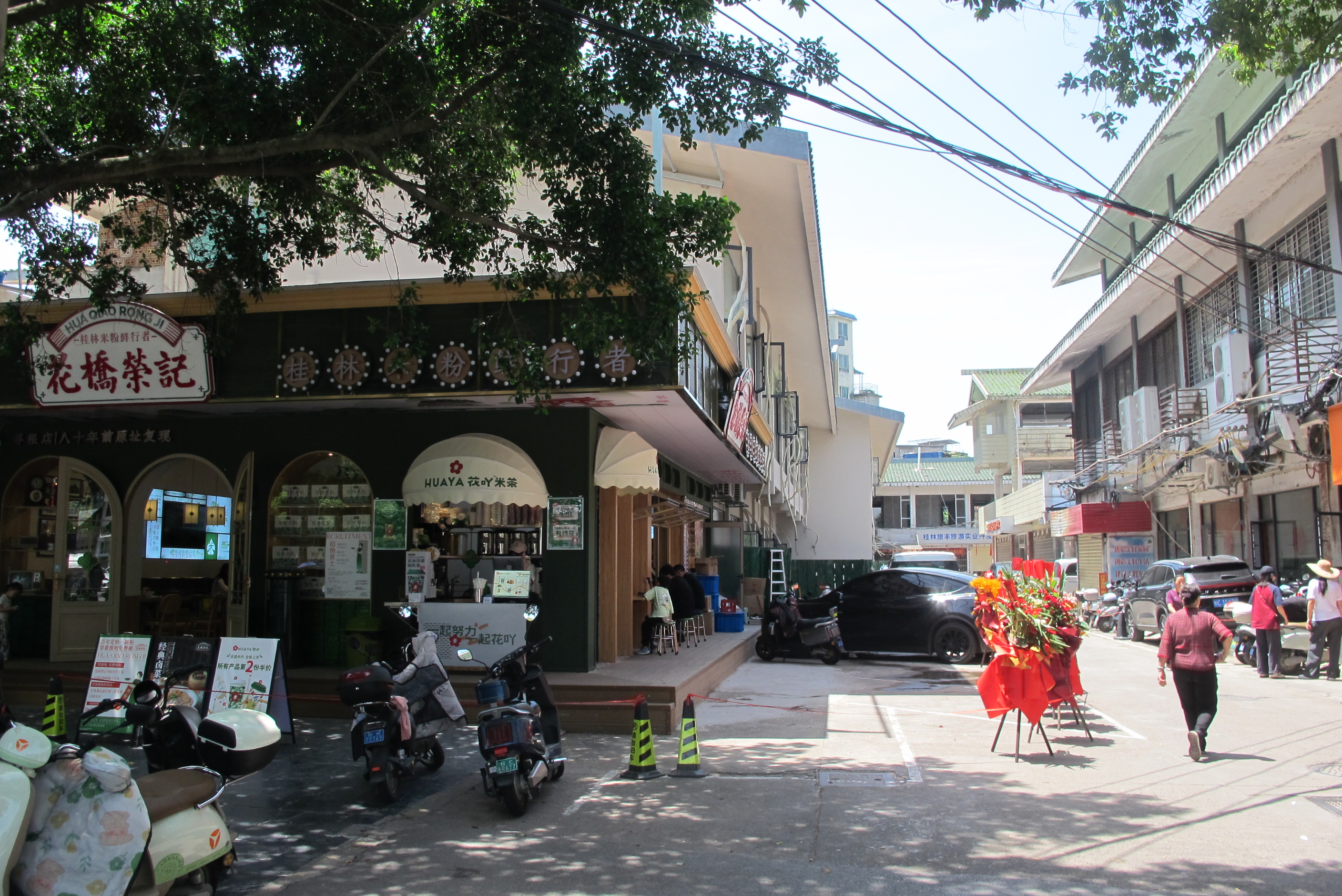 左手边浓蔭树下,昨天才开张的“花桥荣记寻根店”,米粉味香不散,食客盈门等座。