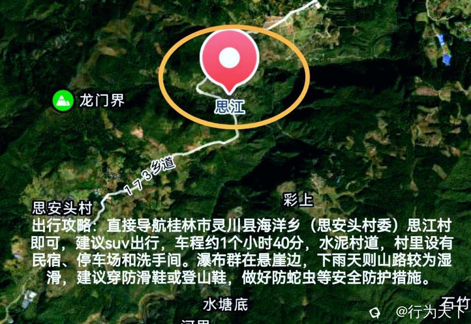 出行攻略:直接导航桂林市灵川县海洋乡(思安头村委)思江村即可,建议suv出行,车程约1个小时40分,水泥村道,村里设有民宿、停车场和洗手间。