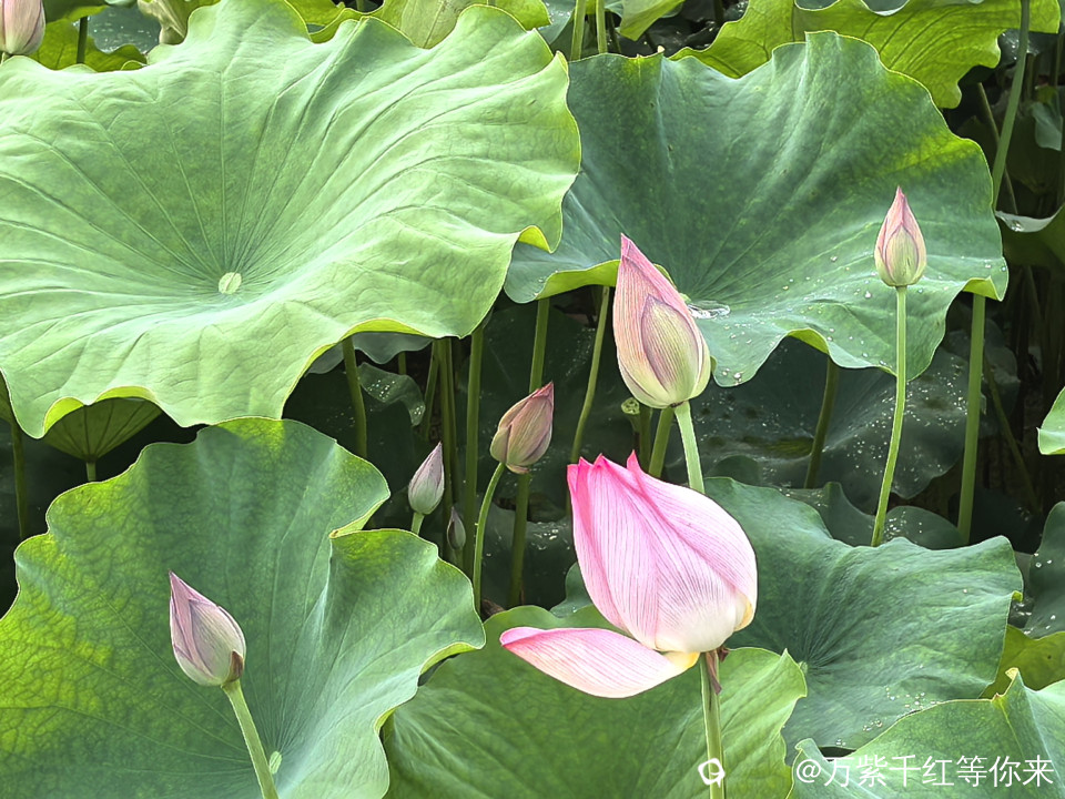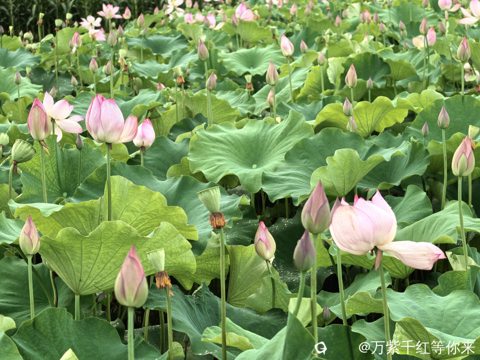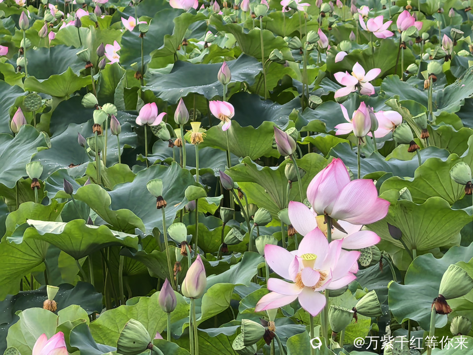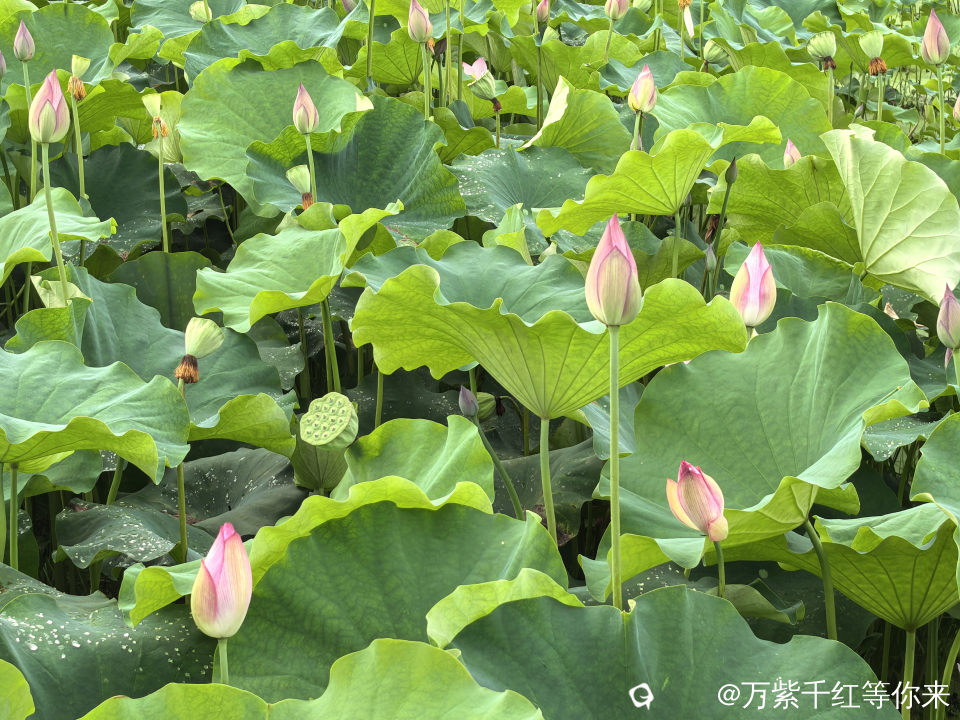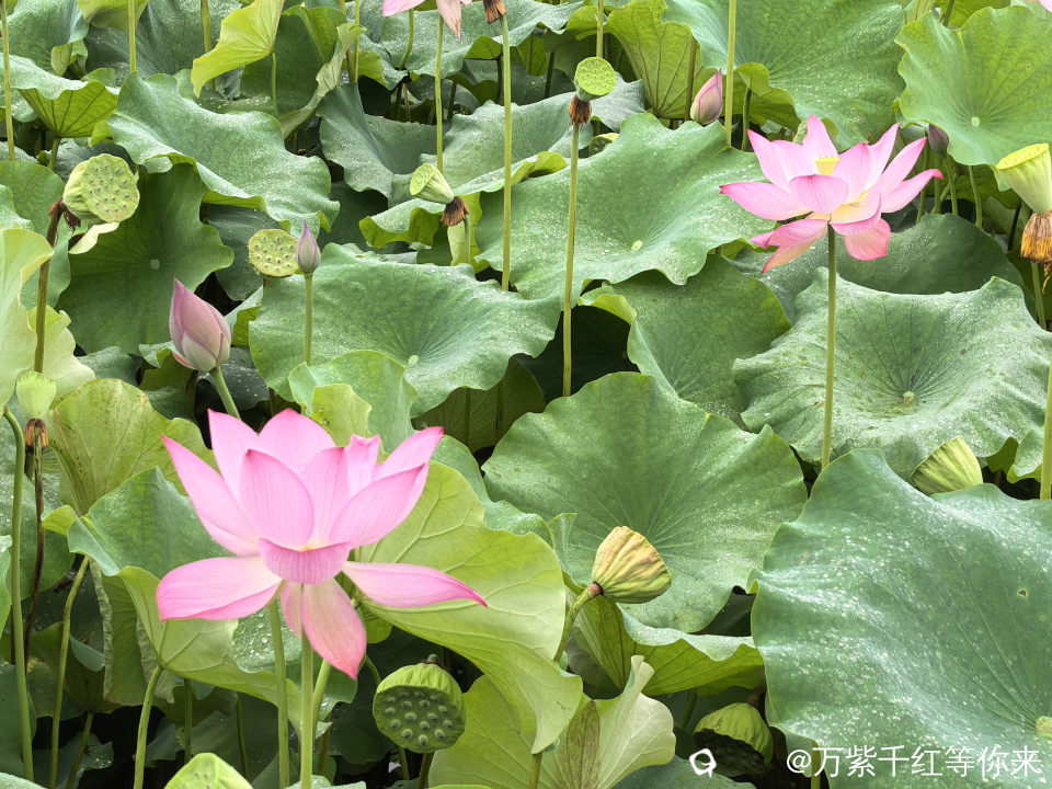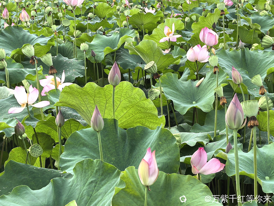 不一会儿,那片心心念念的荷花便映入眼帘。远山近池,只见满塘的荷叶挨挨挤挤,像一个个碧绿的大圆盘。有的高出水面许多,有的则轻轻地浮在水面上,微风吹过,荷叶随风摇曳,泛起层层绿浪 ;荷花在荷叶之间亭亭玉立,粉粉红红的美人脸千姿百态,宛如娇羞的少女。有的花瓣儿全展开了,露出嫩黄色的小莲蓬;有的还是花骨朵儿,充满了生机与诗意。