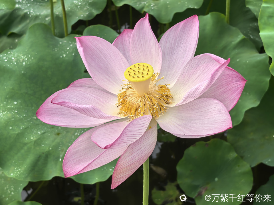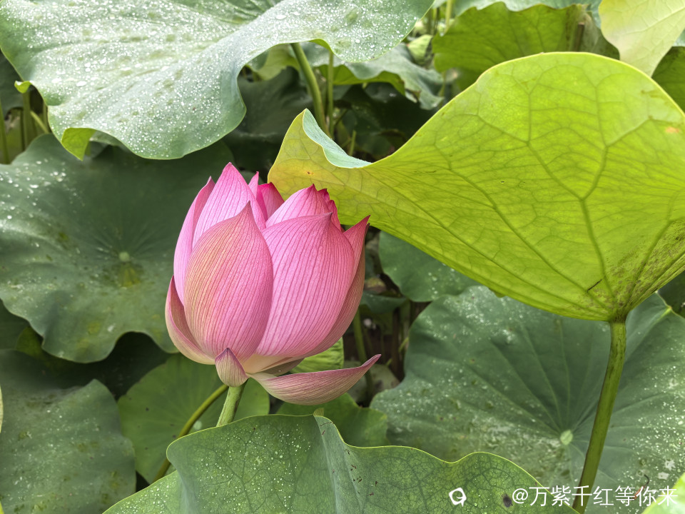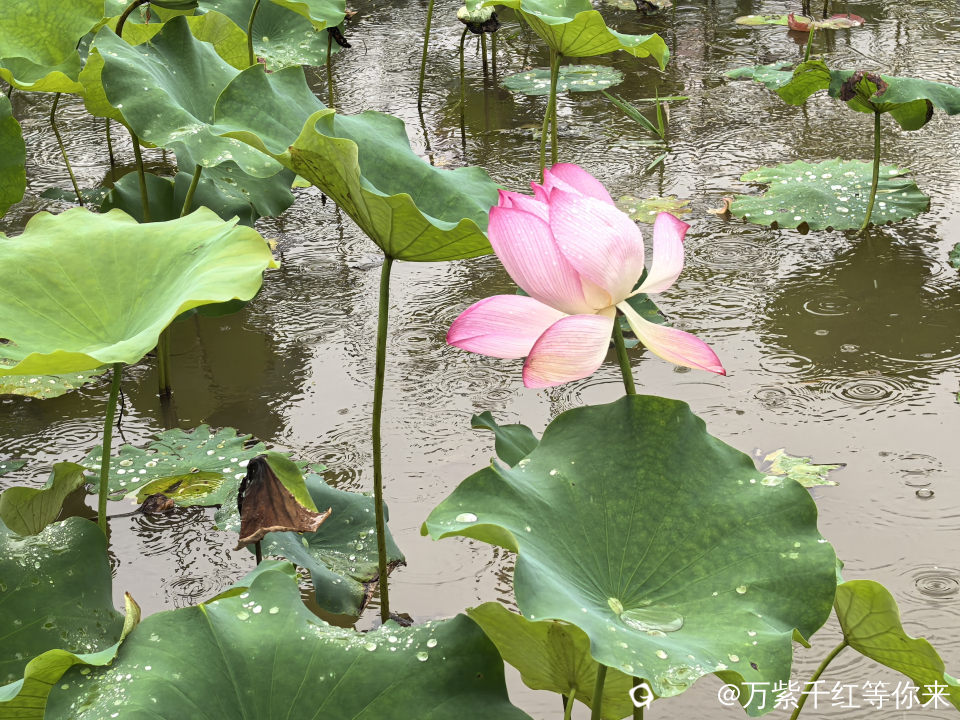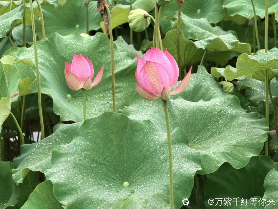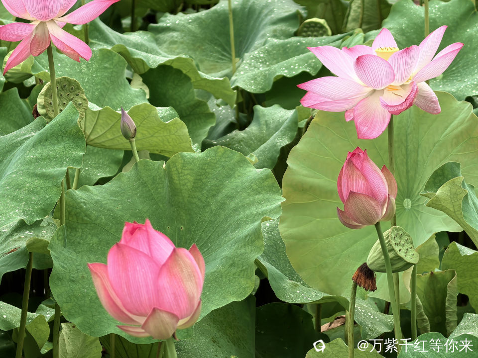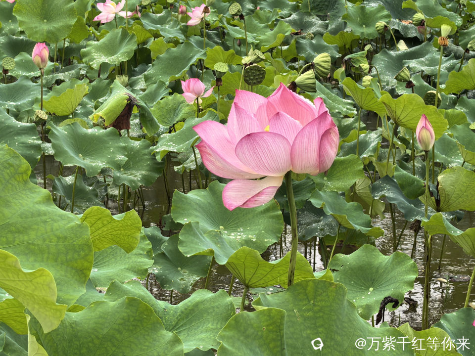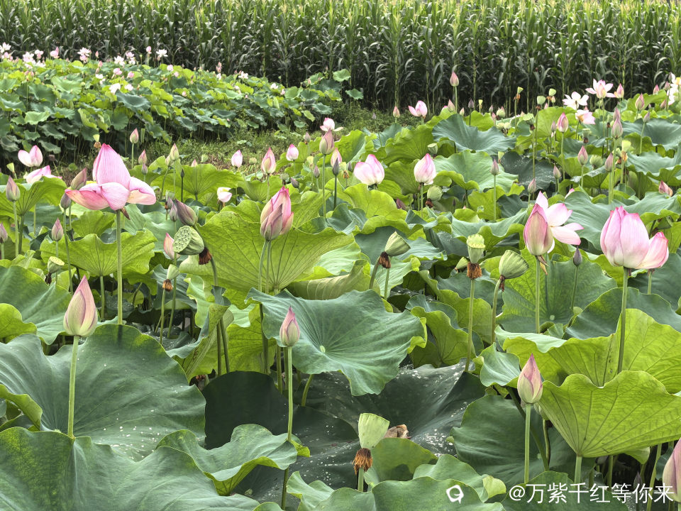 不一会儿,那片心心念念的荷花便映入眼帘。远山近池,只见满塘的荷叶挨挨挤挤,像一个个碧绿的大圆盘。有的高出水面许多,有的则轻轻地浮在水面上,微风吹过,荷叶随风摇曳,泛起层层绿浪 ;荷花在荷叶之间亭亭玉立,粉粉红红的美人脸千姿百态,宛如娇羞的少女。有的花瓣儿全展开了,露出嫩黄色的小莲蓬;有的还是花骨朵儿,充满了生机与诗意。