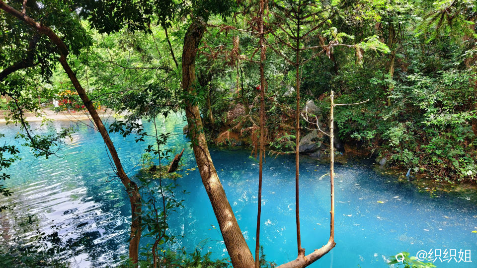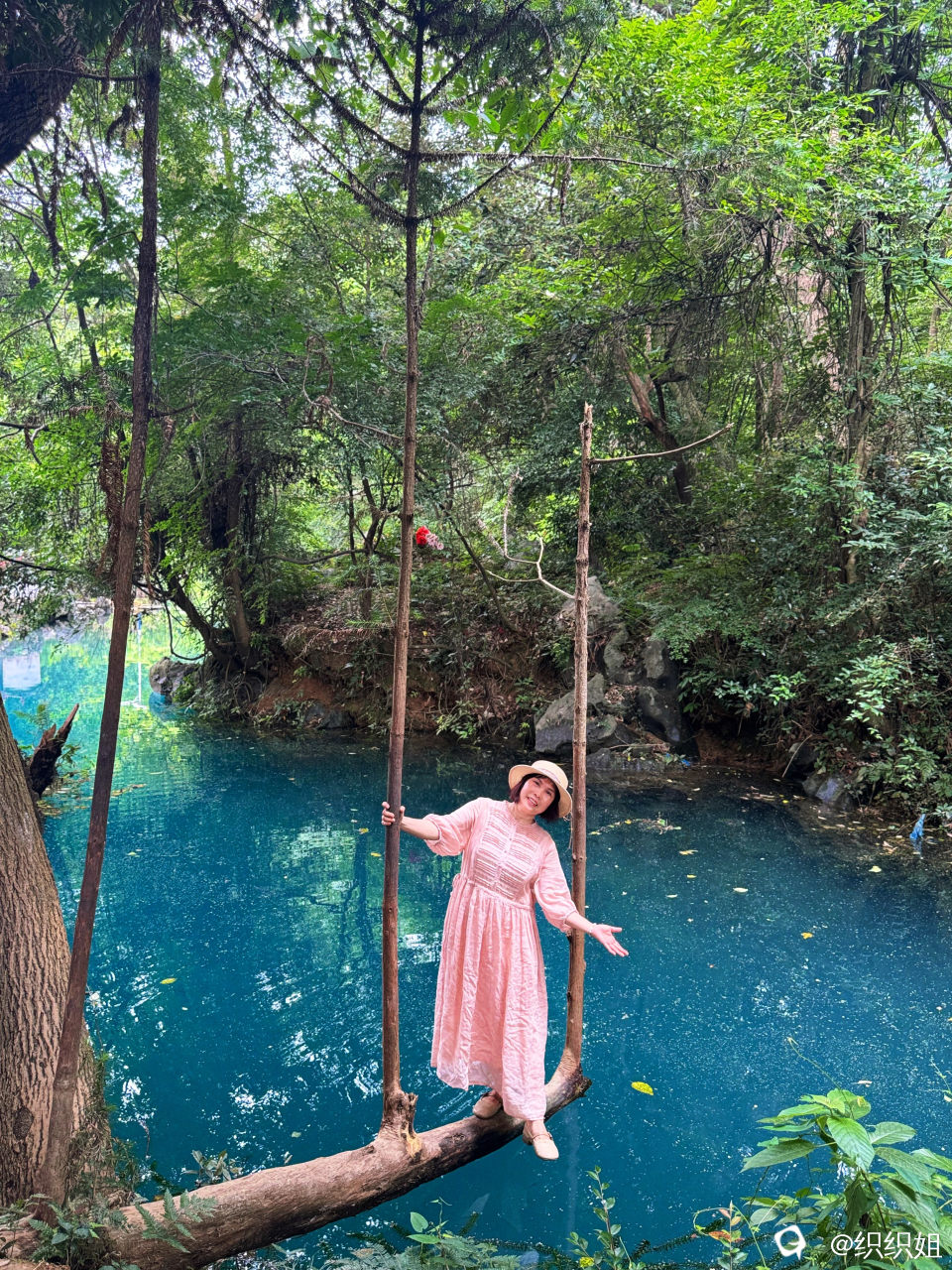 深潭边斜生着像秋千般的树,游人争相打卡。据说不少来自北京、上海的游客慕名而来,只为一睹“小九寨沟”的芳容,在网红“秋千树”前打卡留念。