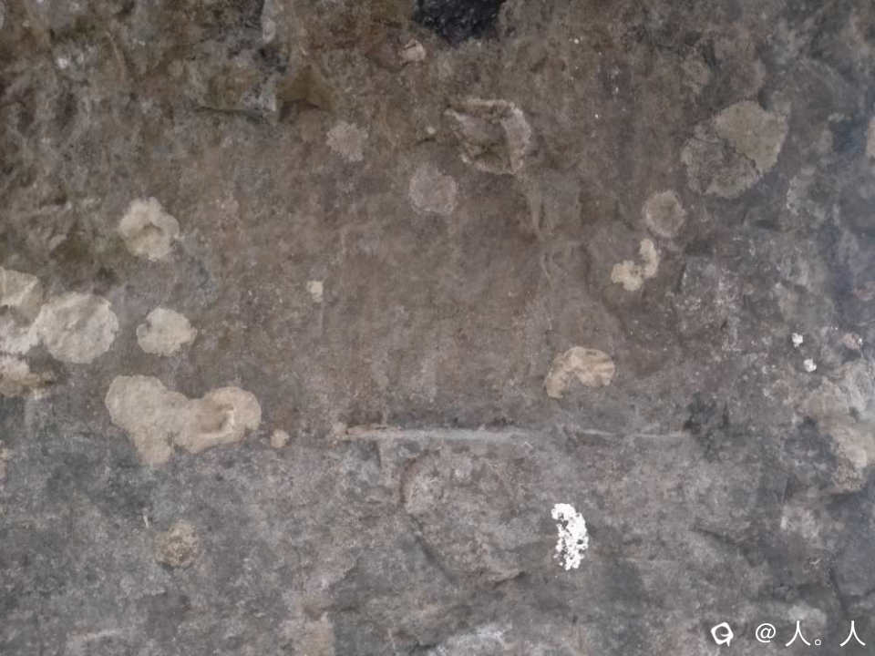 桥底有一方25×15公分的模糊石刻。丰水期的水位刚好在石刻下方,暴雨最大的那几天,毫无疑问石刻是被淹没的。