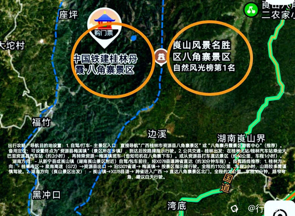 出行攻略:直接导航“广西桂林市资源县八角寨景区” 或 “湖南崀山八角寨丹霞景区”(推荐),到达后按路牌指示行驶。