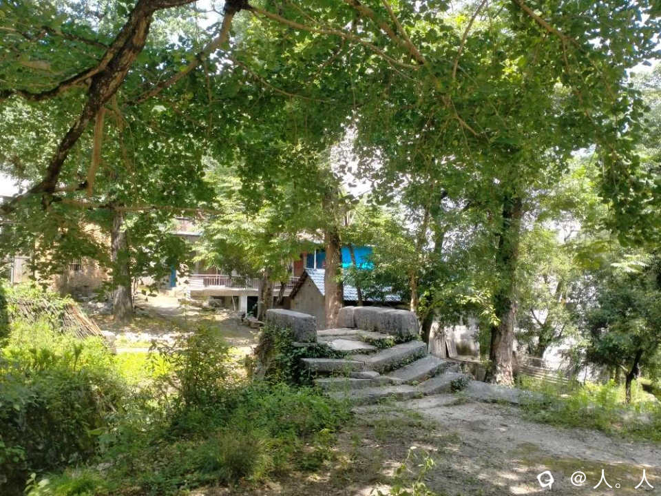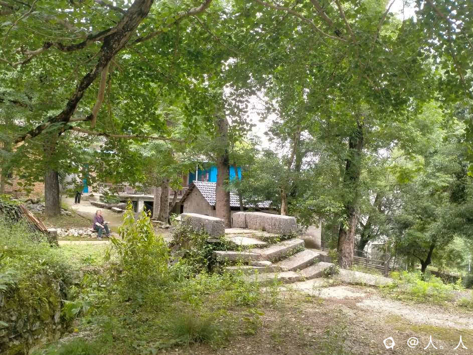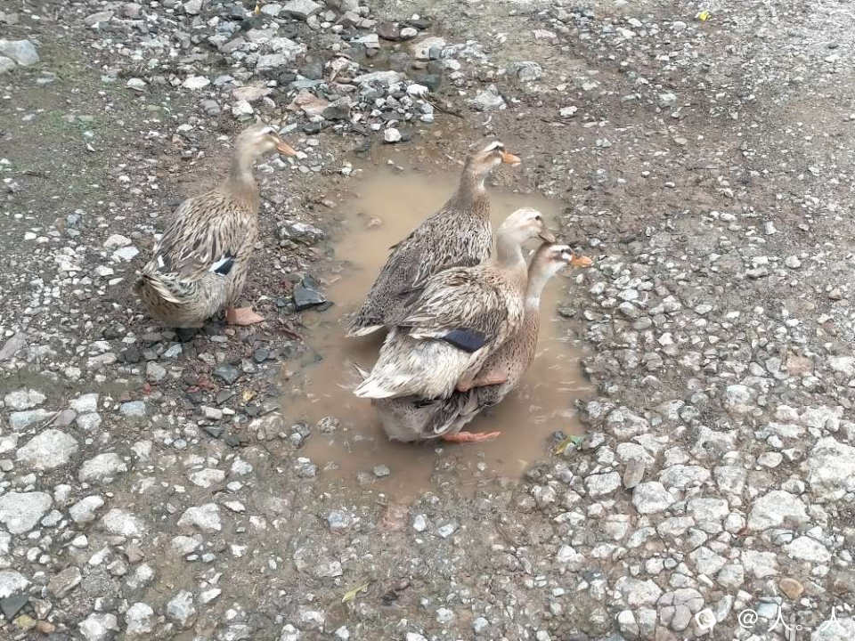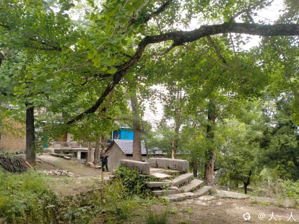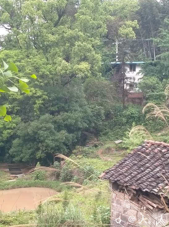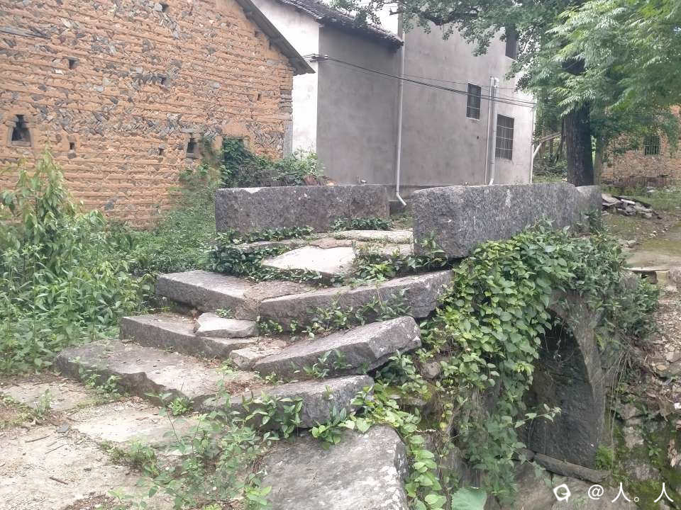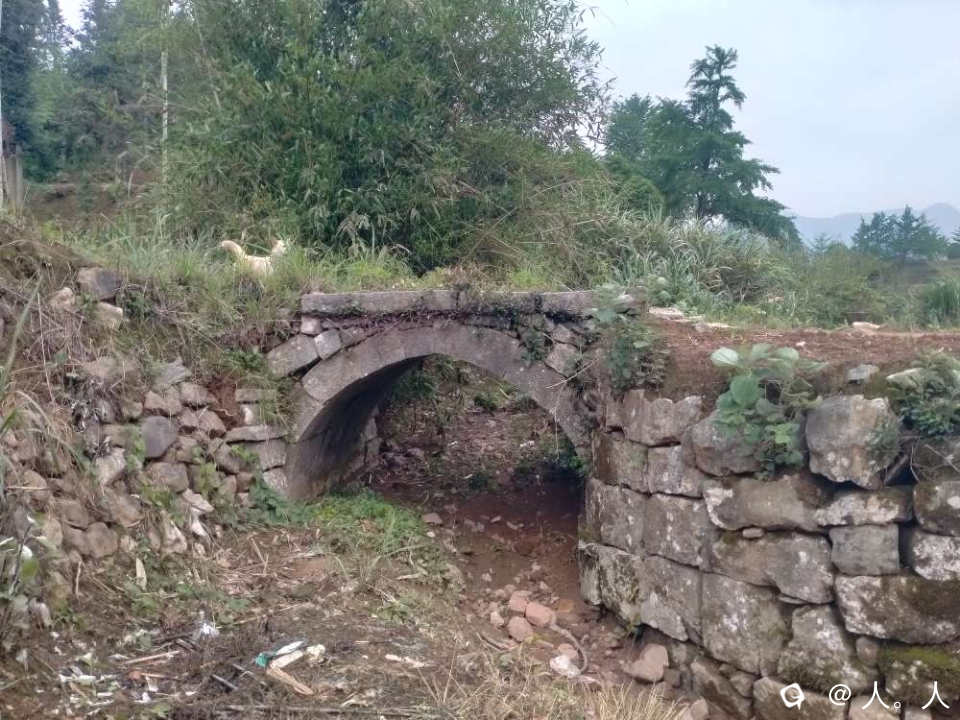 我在大山岭看到一栋平房,一些鸡鸭,几条古道和一座石拱桥。