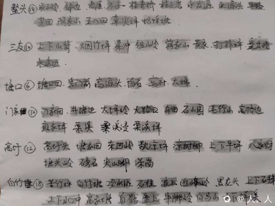 去过的地方用铅笔涂抹了。有两个自然村没有去到——