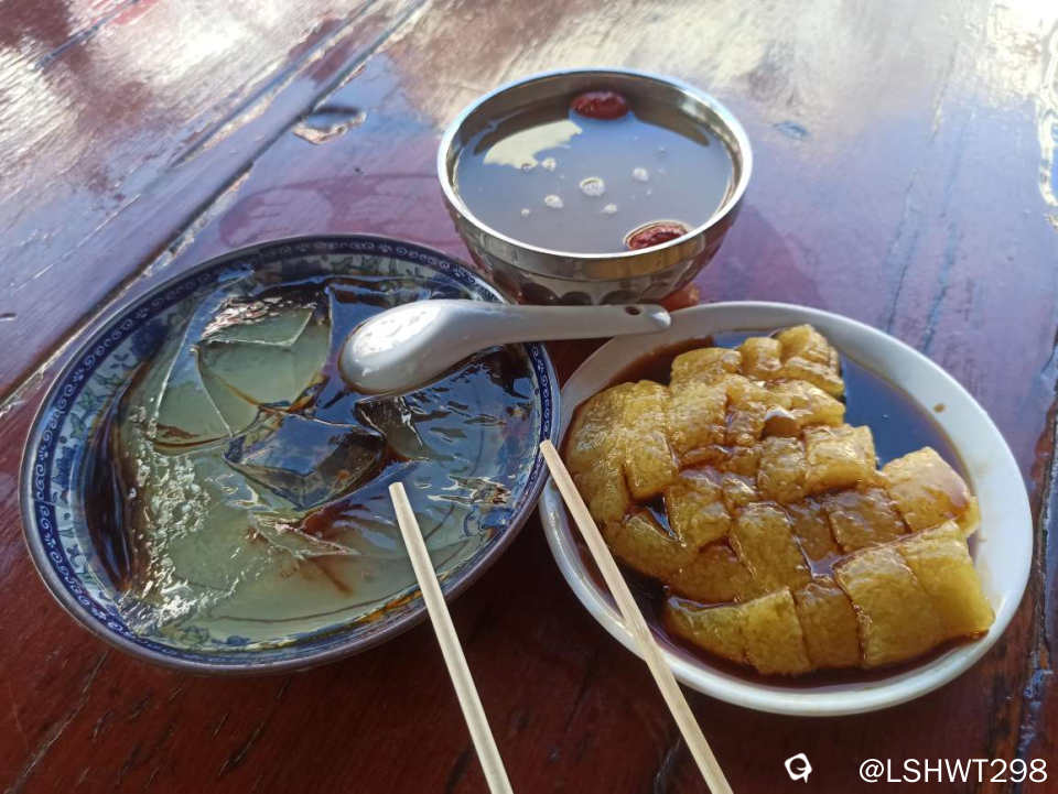 回程,江永桃川镇老十字街上的“三剑客“,人。人大佬推荐的消费“陷阱“。一人干三碗,凉水粽粑是新推精品,糯Q弹,糖水香纯,回味甘甜。一拐伍的凉粉是找不到了,三闷街就三闷街(当然粽粑是伍拐)。这个坑,我第一个踩定了,而且下次来还会踩。你,会是第二个吗。。。