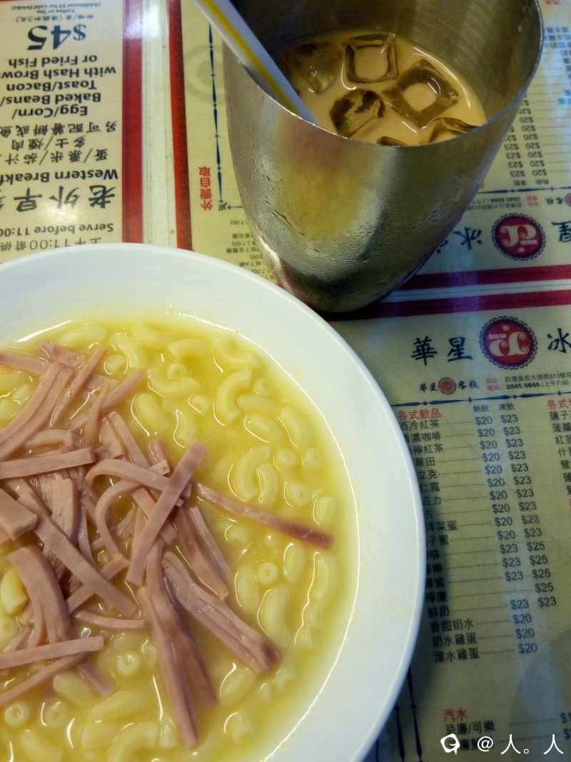 40港币套餐,一杯冰咖啡奶茶,一碗烟肉通心粉,一个多士。
