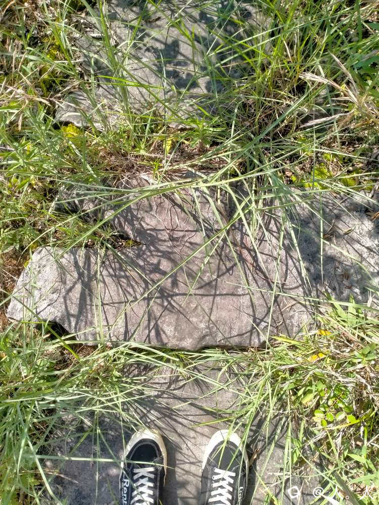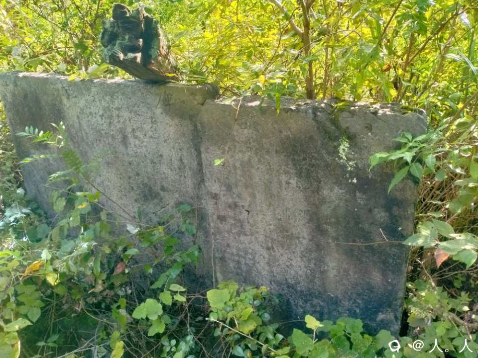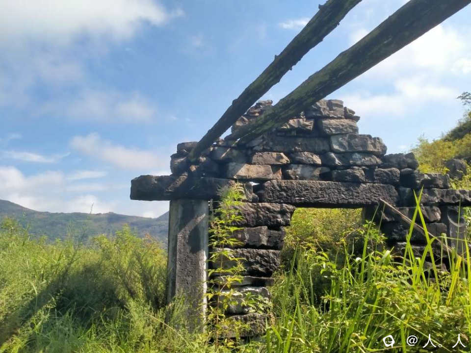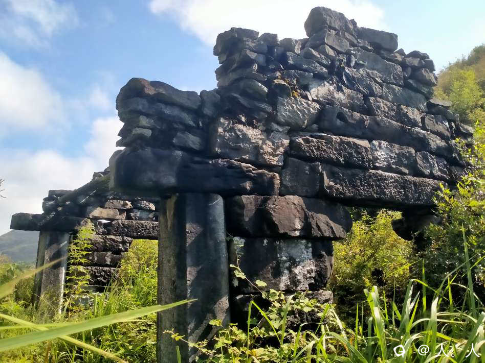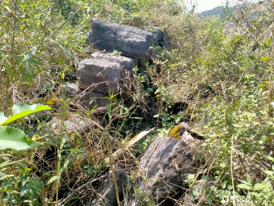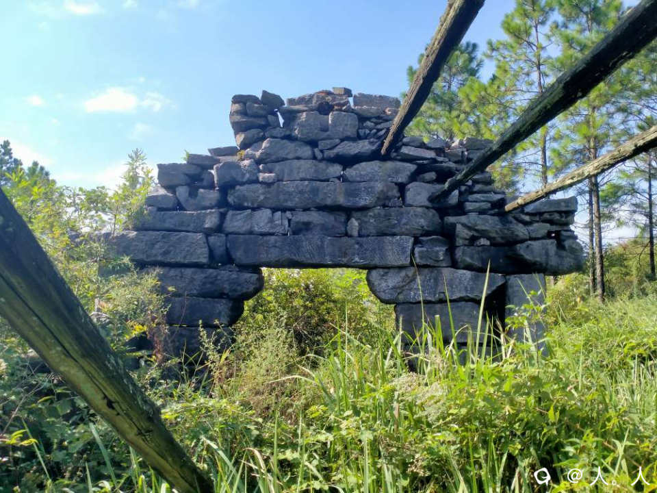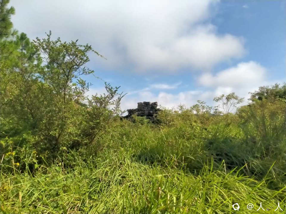 顺着隐隐约约的石路披荆斩棘十几分钟,远远看到山坳中一堆黑色的石头:一座凉亭。