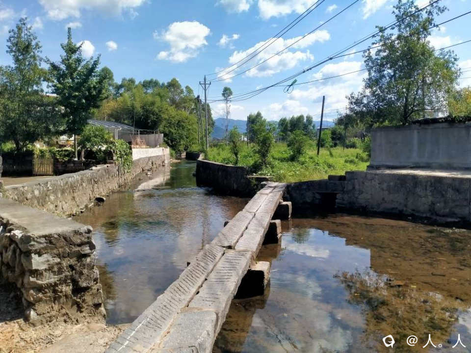 新街戴家塘到大坪村中间小溪,并排着近些年修的石板、水渠和石拱,还有一块嘉庆年间的重修大坪桥碑记。