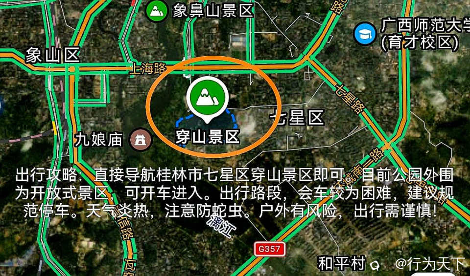 出行攻略:直接导航桂林市七星区穿山景区即可。目前公园外围为开放式景区,可开车进入。出行路段,会车较为困难,建议规范停车。