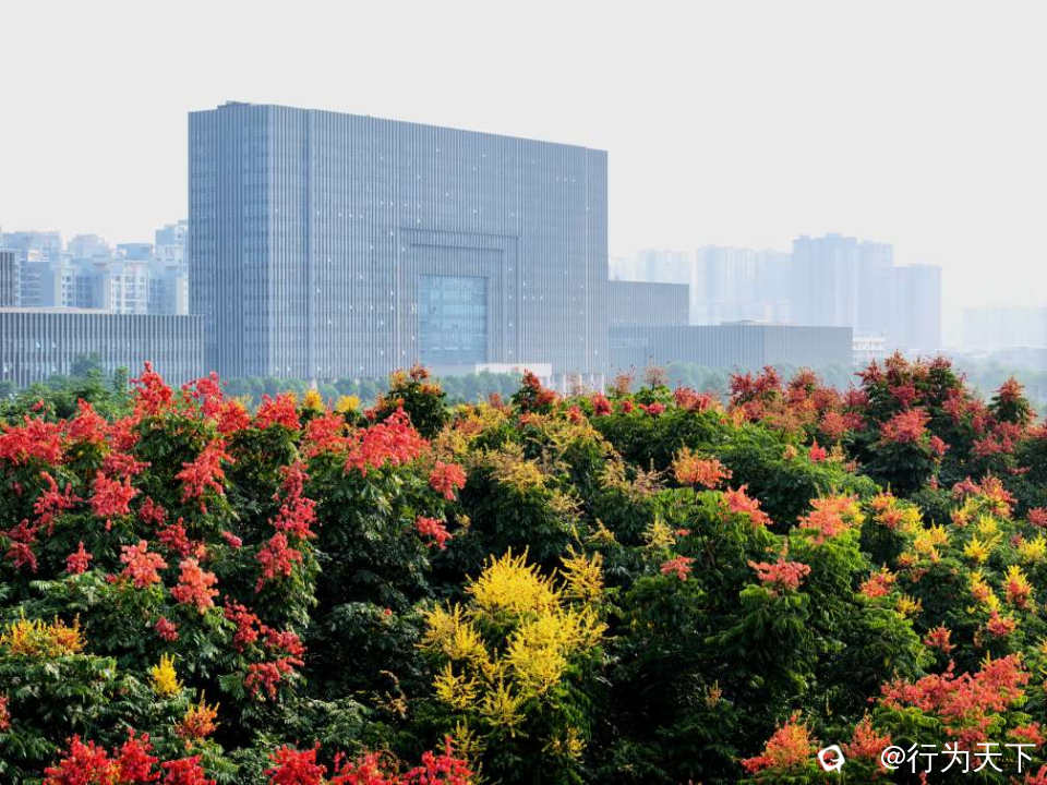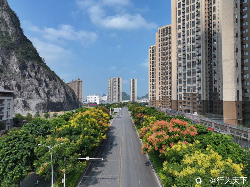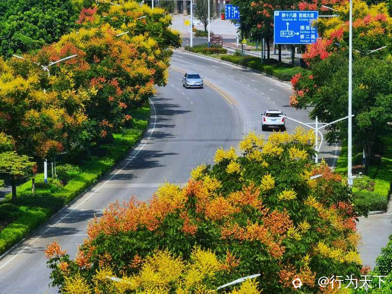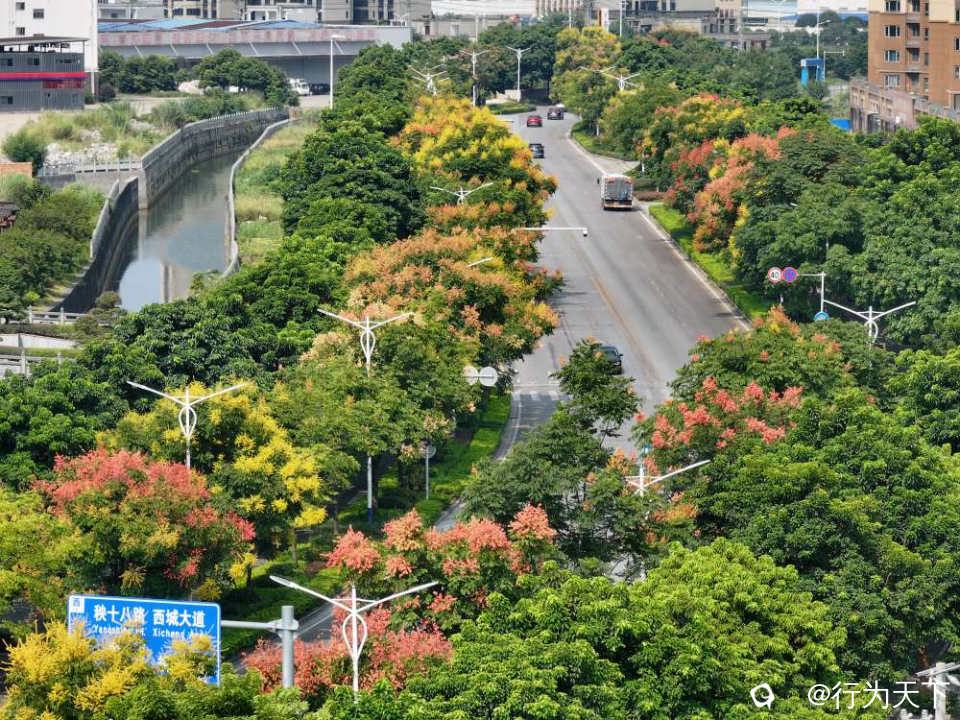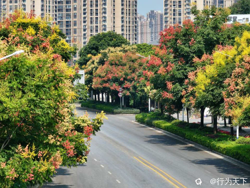 临桂新区的街道迎来一年中最绚烂的时刻——栾树花开。一树树金黄与绯红交织,如云霞铺展于道路两侧,与现代化楼宇、生态水系相映成趣。