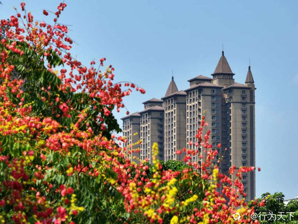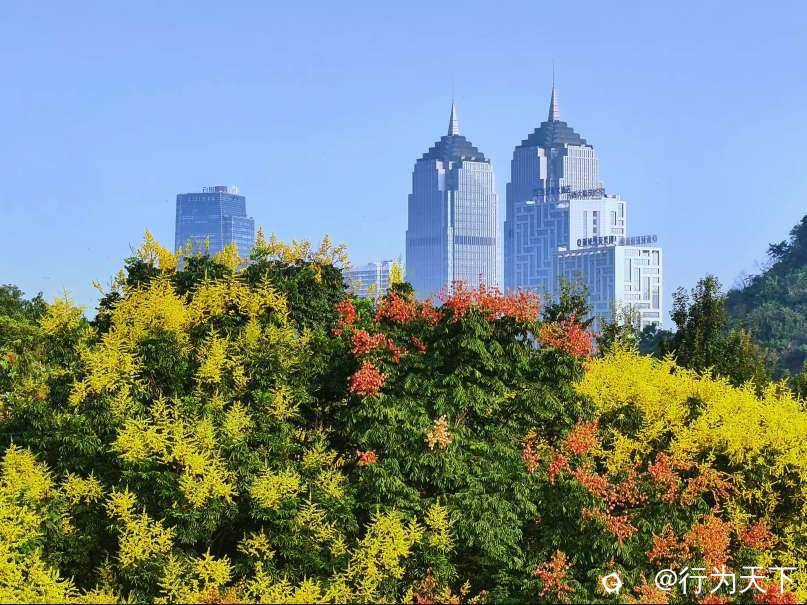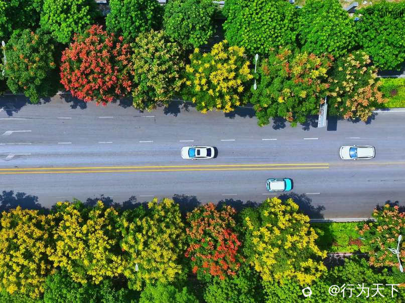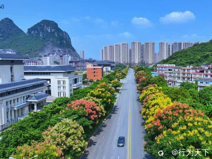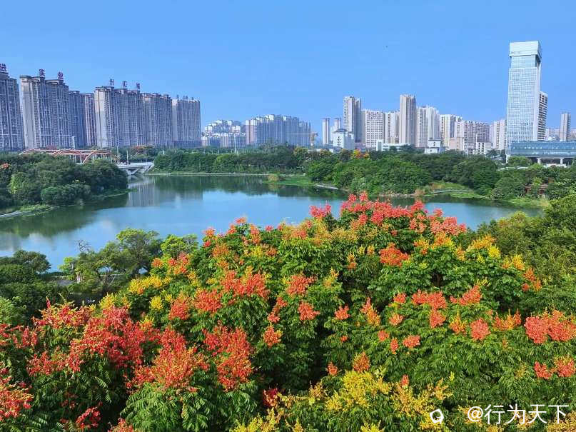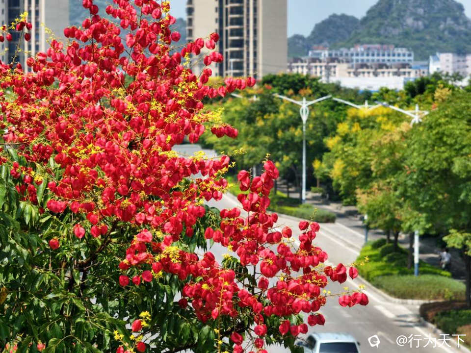 临桂新区的街道迎来一年中最绚烂的时刻——栾树花开。一树树金黄与绯红交织,如云霞铺展于道路两侧,与现代化楼宇、生态水系相映成趣。